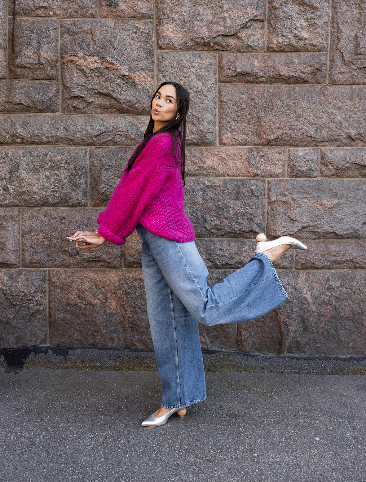 - Paksun langan kaunis paino yhdistettynä löysään silmukkaan luo kauniin naisellisen laskeutuvuuden