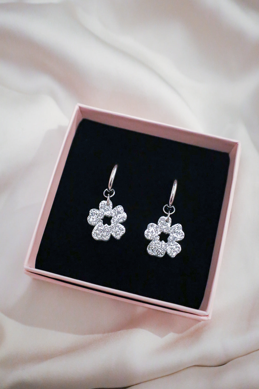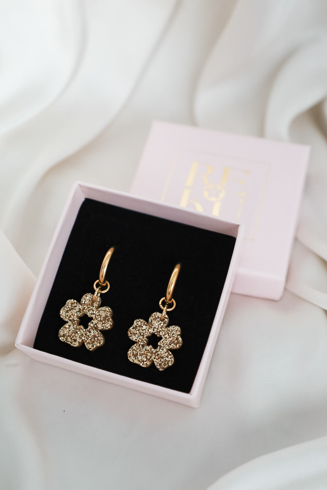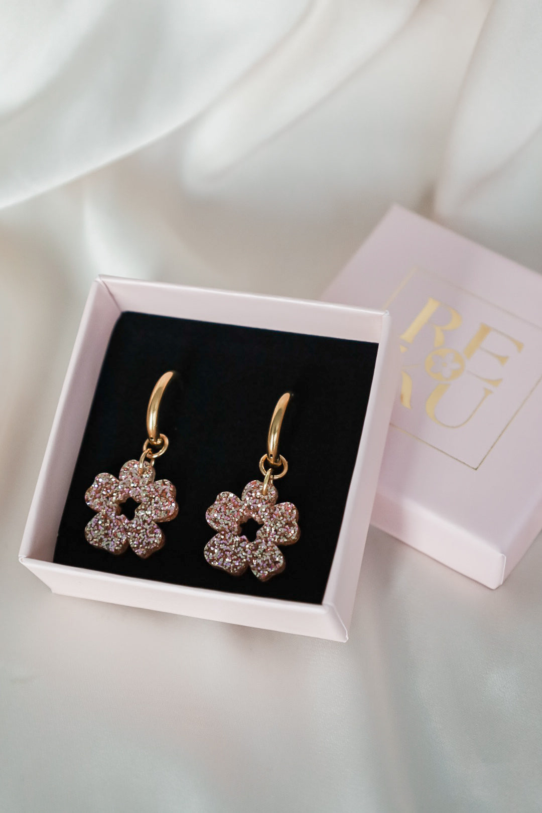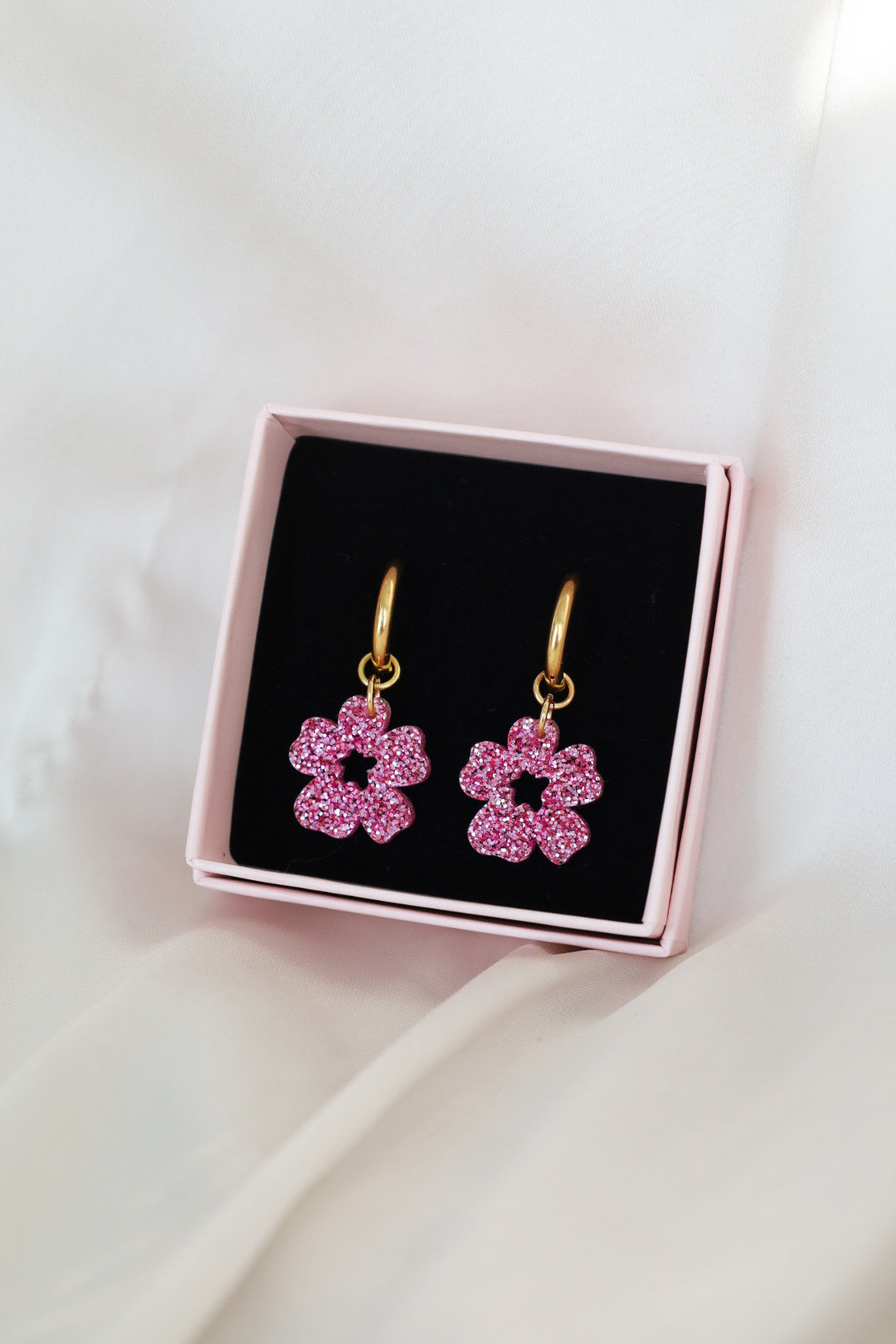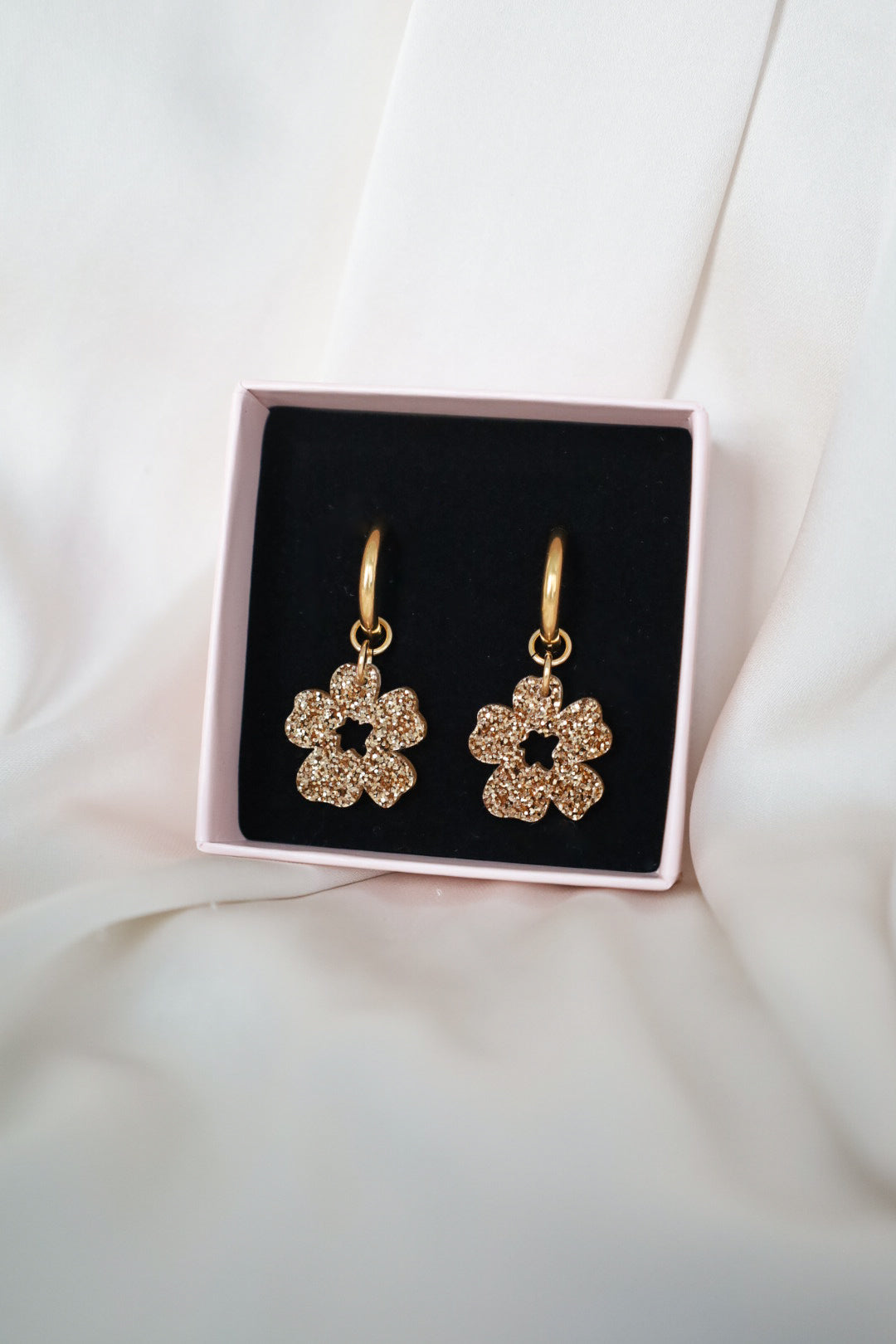 Kevyt ja kestävä glitterakryyli. Metalliosat ovat nikkelittömiä ja korvakorurengas on allergiaystävällistä 18K kullattua ruostumatonta terästä tai ruostumatonta terästä. Metalliosat ovat nikkelitestattuja eikä niistä vapaudu nikkeliä.