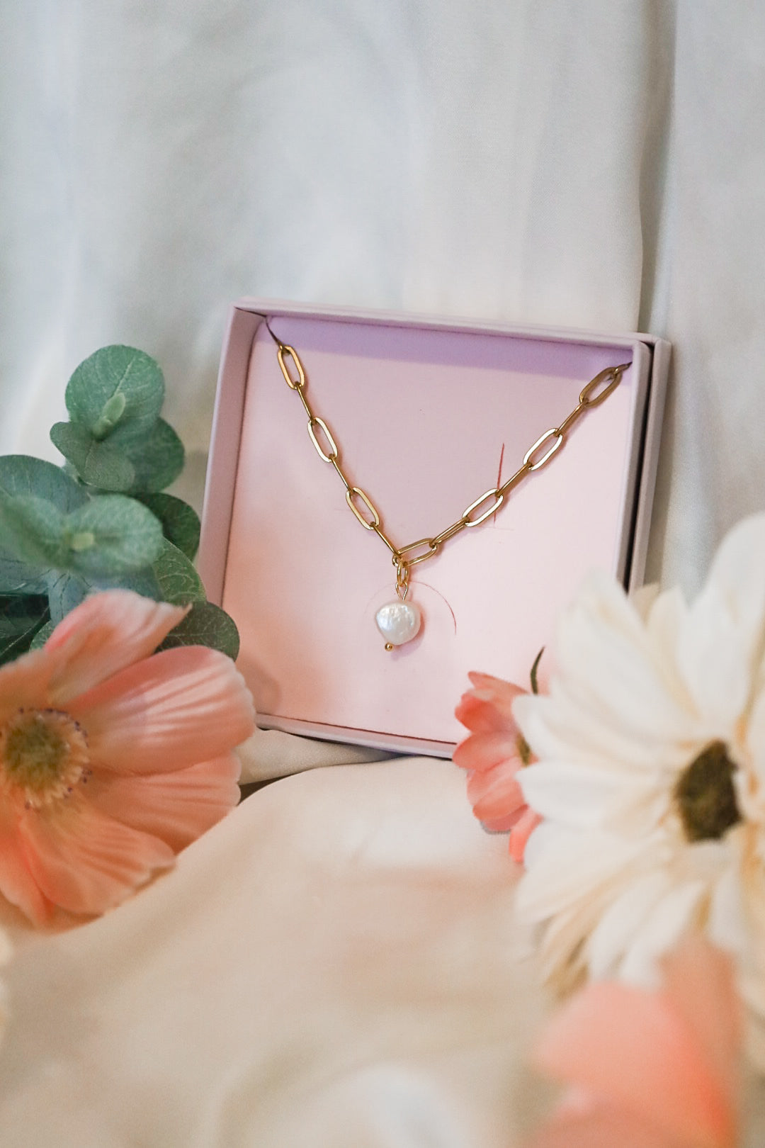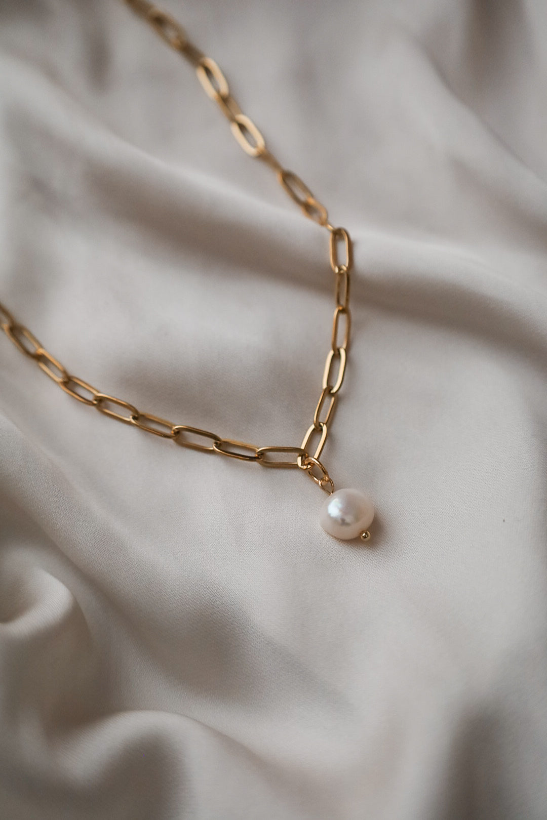 Mette-korussa yhdistyy täydellisesti herkkyys ja asenne. Aito makeanvedenhelmi tuo lempeyttä koruun, kun taas paksu ketju viestii voimaa. Ketjun materiaali on PVD kullattua ruostumatonta terästä, joka kestää vettä ja kulutusta hyvin.