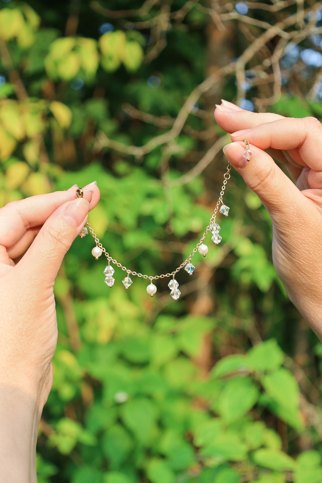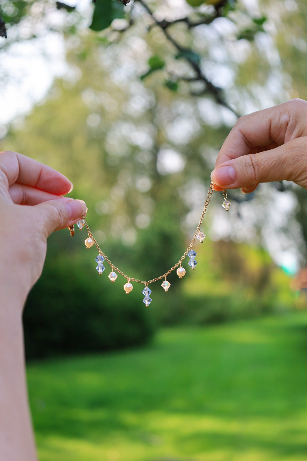 Tsekkiläiset Preciosa -lasikristallit ja shell pearl -helmet. Ketju on 18K kullattua ruostumatonta terästä, jossa on PVD -pinnoitus.