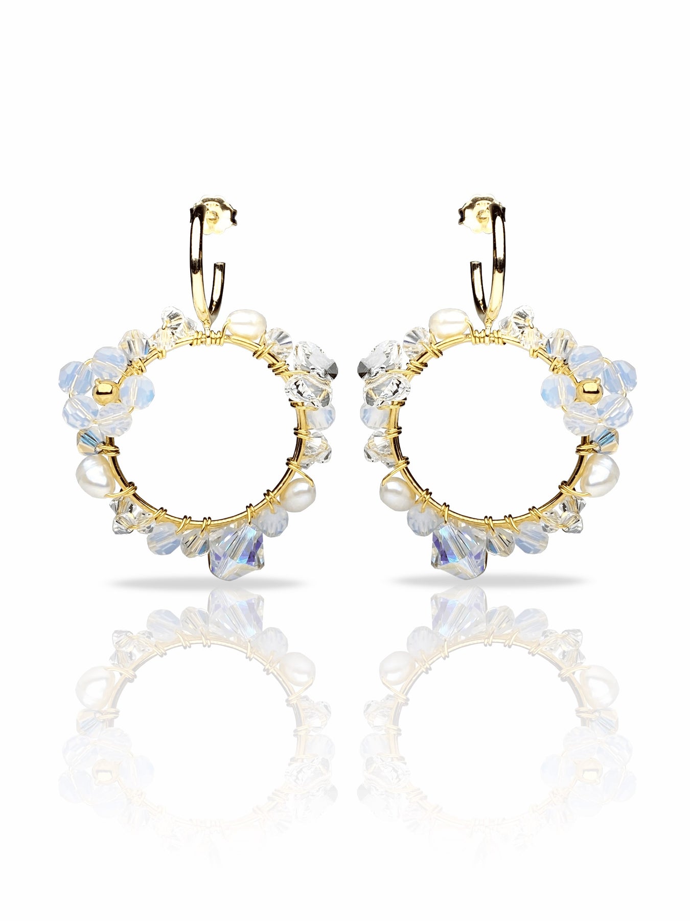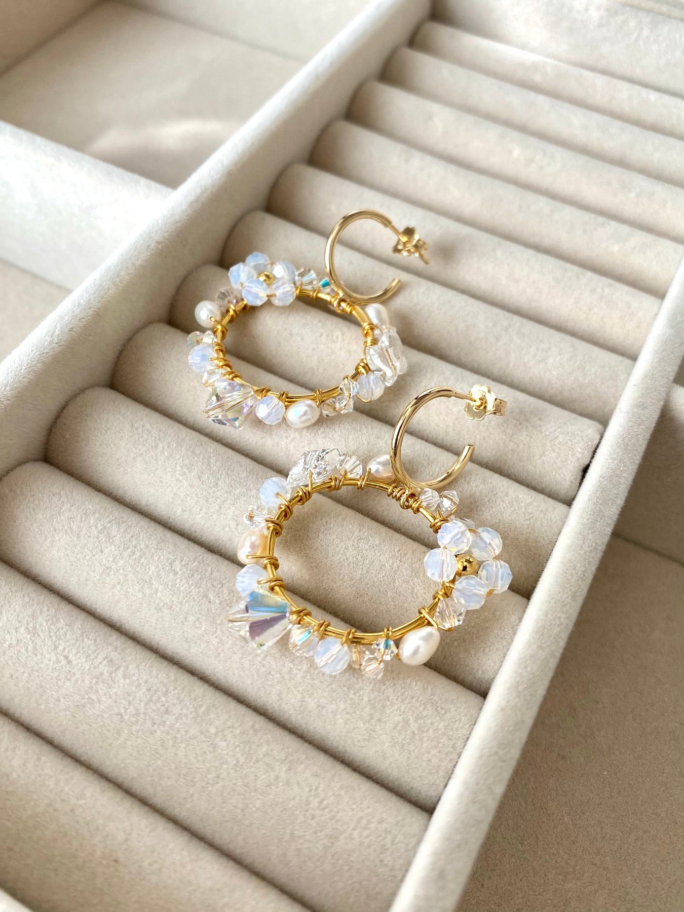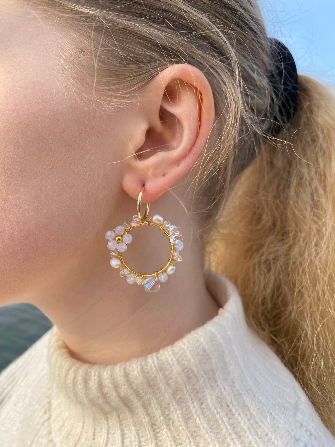 Korvakorurenkaat ovat 18K kullattua 925 sterling hopeaa ja riipusrengas on käsin muotoiltu 24K kullatusta kuparilangasta. Korvisrenkaiden halkaisija on 15 mm ja riipuksen 25 mm. Helmet ovat sekoitus erilaisia kristallilasihelmiä ja aitoja makeanvedenhelmiä. Jokainen on käsin kierretty renkaisiin yksi kerrallaan.