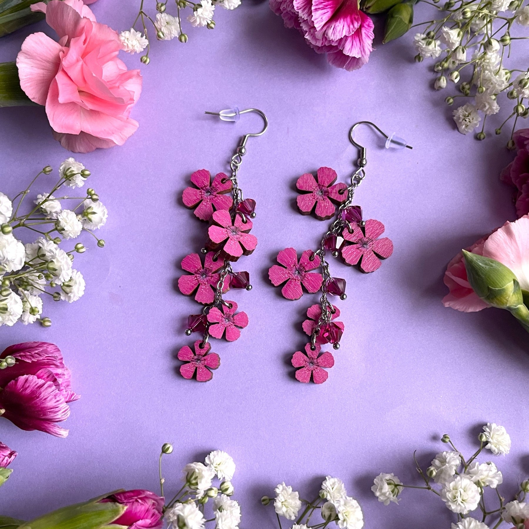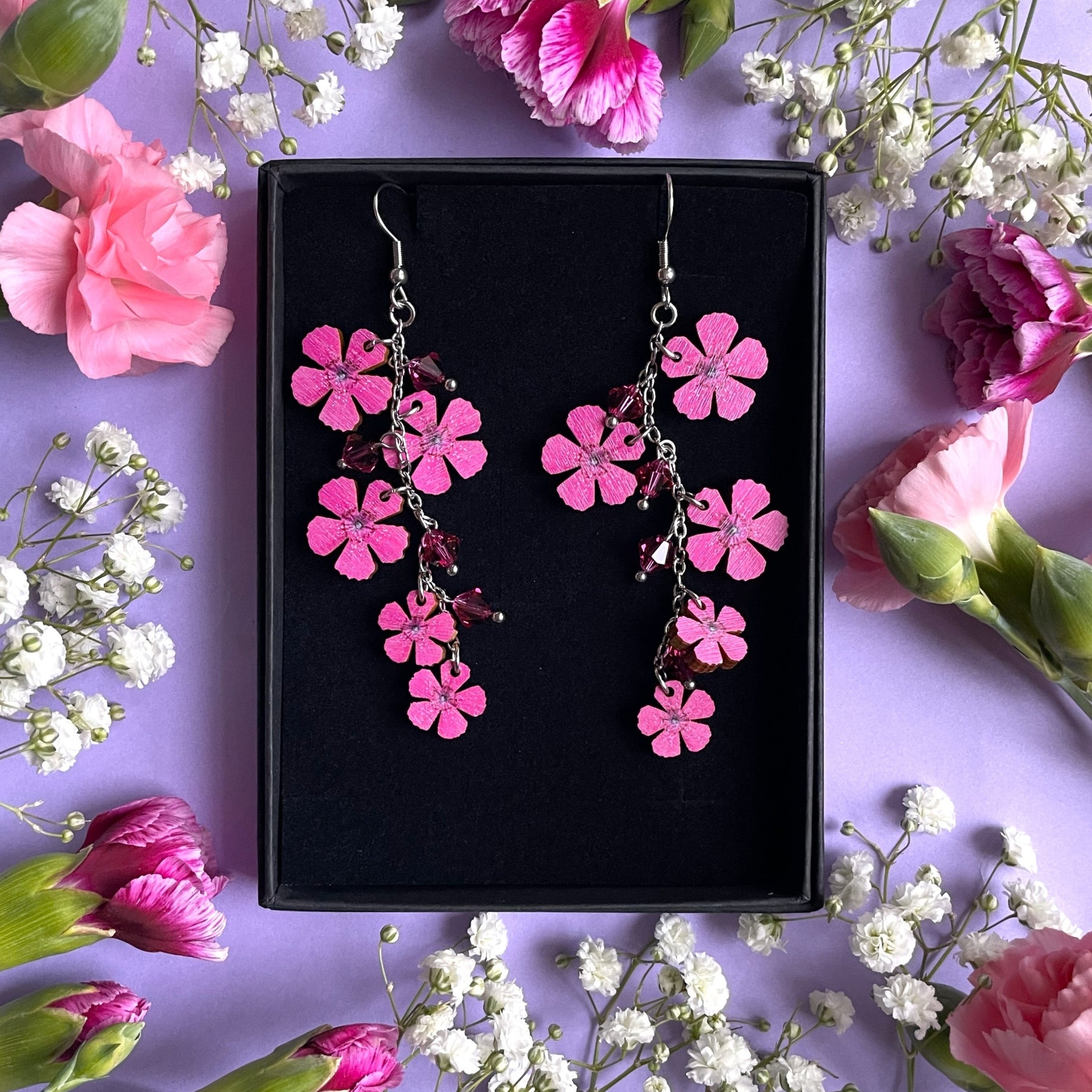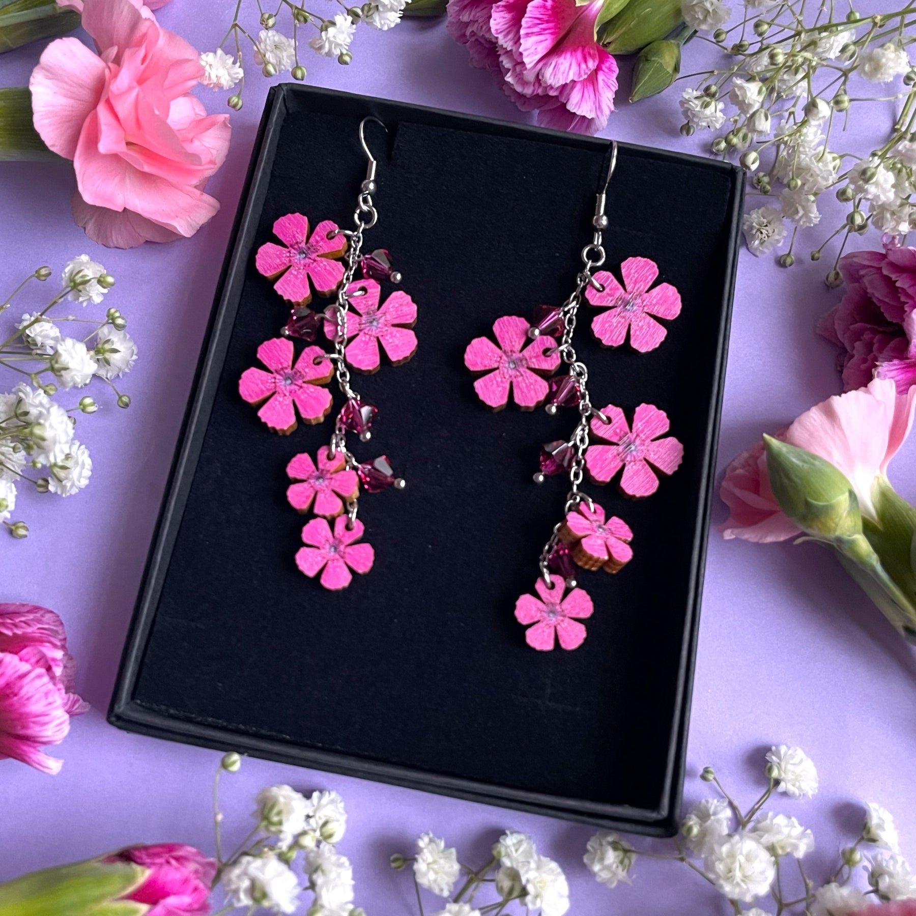 Viehkeät ketoneilikat kukkivat näissä hurmaavissa korvakoruissa. Kukkia koristavat kauniit fuksian väriset kristallit. Korvakorujen materiaali on suomalainen PEFC- ja FSC-sertifioitu koivuvaneri. Metalliosat ovat allergiaystävällistä kirurginterästä, joka ei tummu käytössä. Puuosat on laserleikattu ja printattu Helsingissä ja koottu muotoonsa Vantaalla.