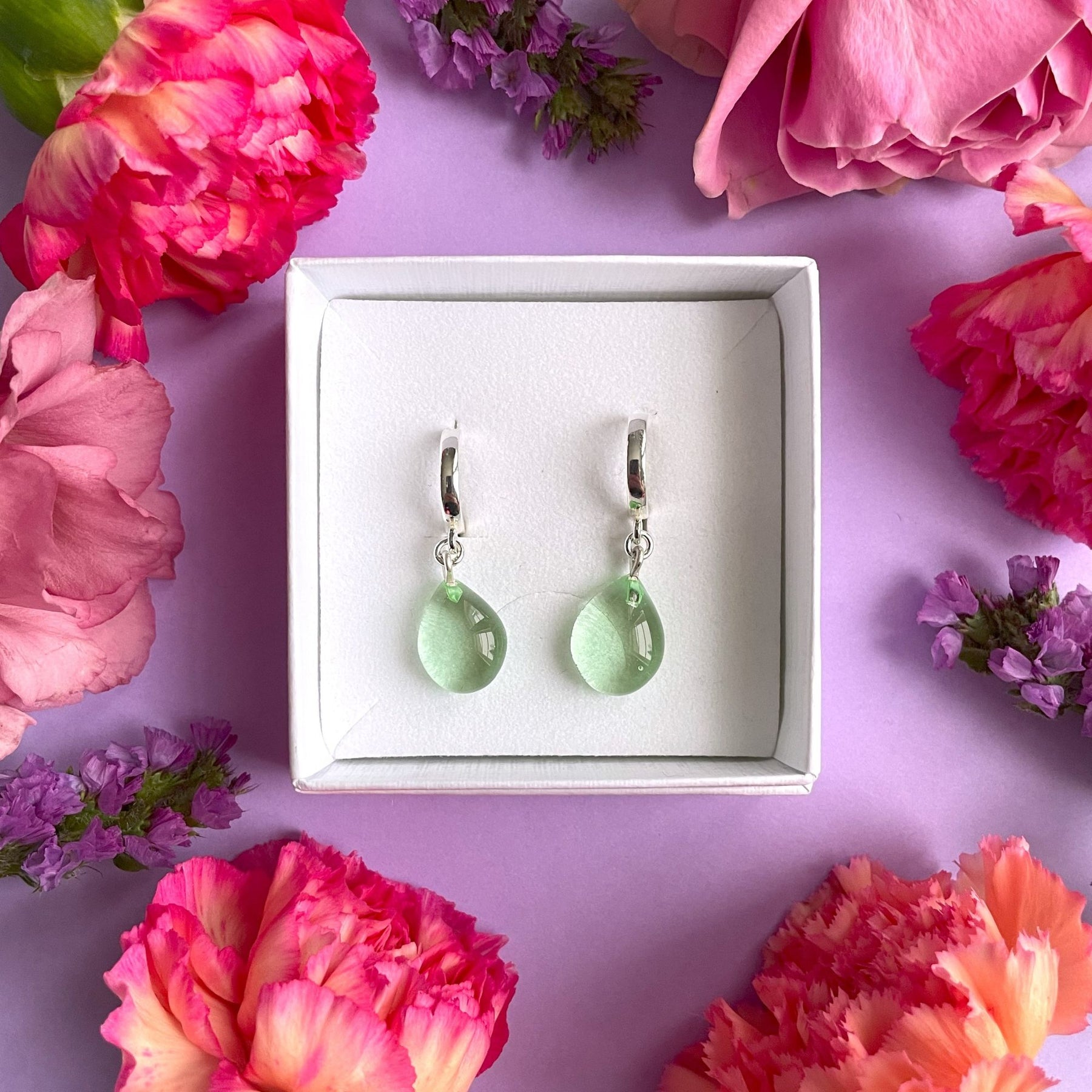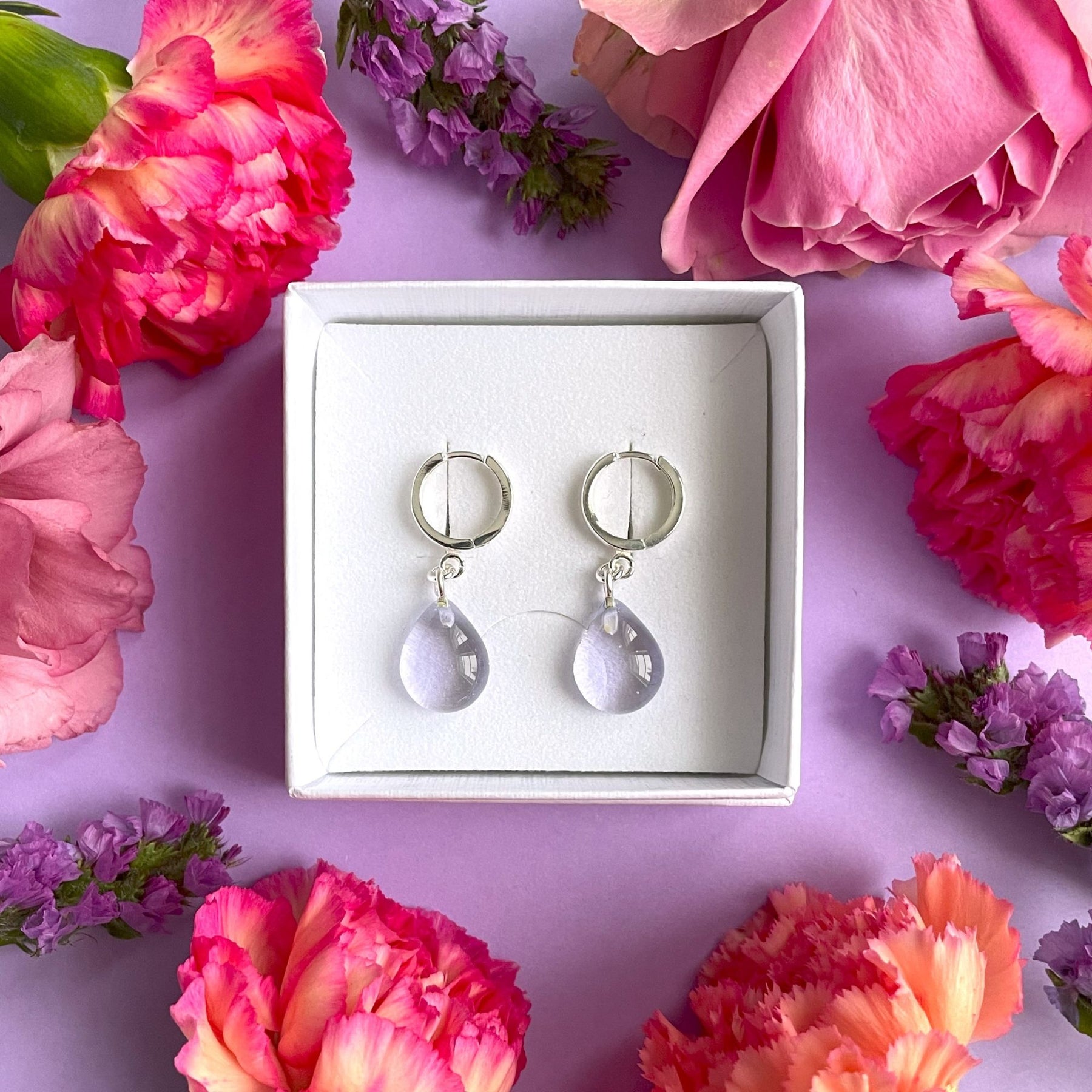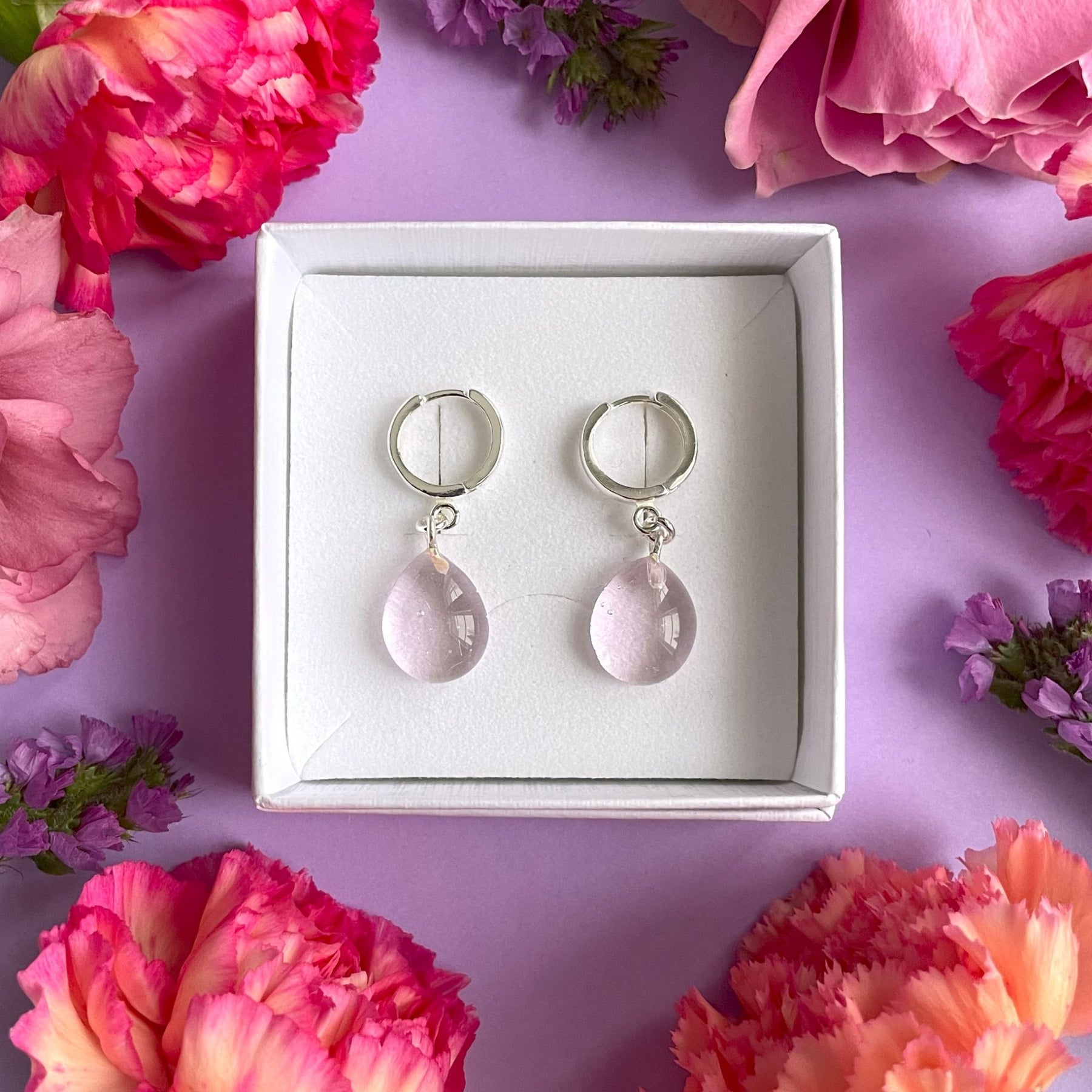 Lasi, korvakorujen metalliosat ovat nikkelitöntä 925 hopeaa.