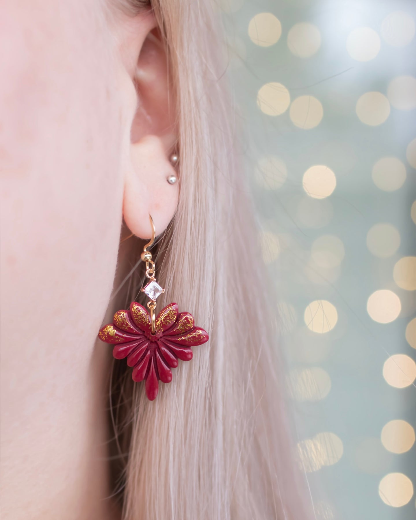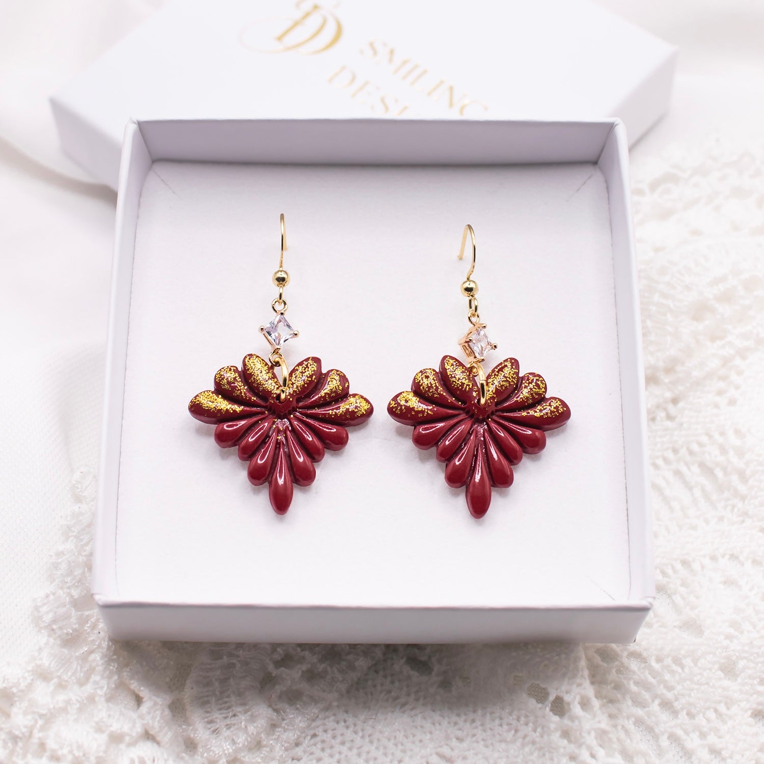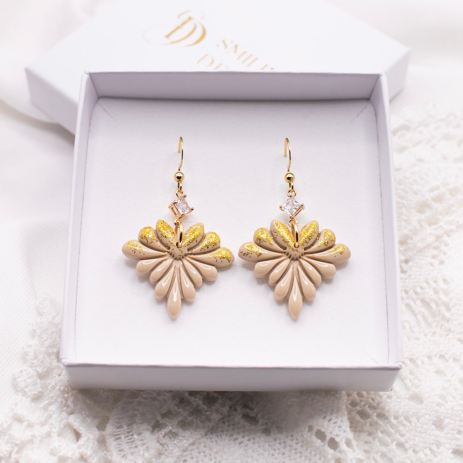 Upeat sirot Smiling Design Vivian korvakorut, joissa on koristeena kultaista glitteriä ja kristalli. Korun pinta on viimeistelty kiiltolakalla. Korujen metalliosat ovat Suomessa testattua, allergiaystävällistä kirurginterästä.