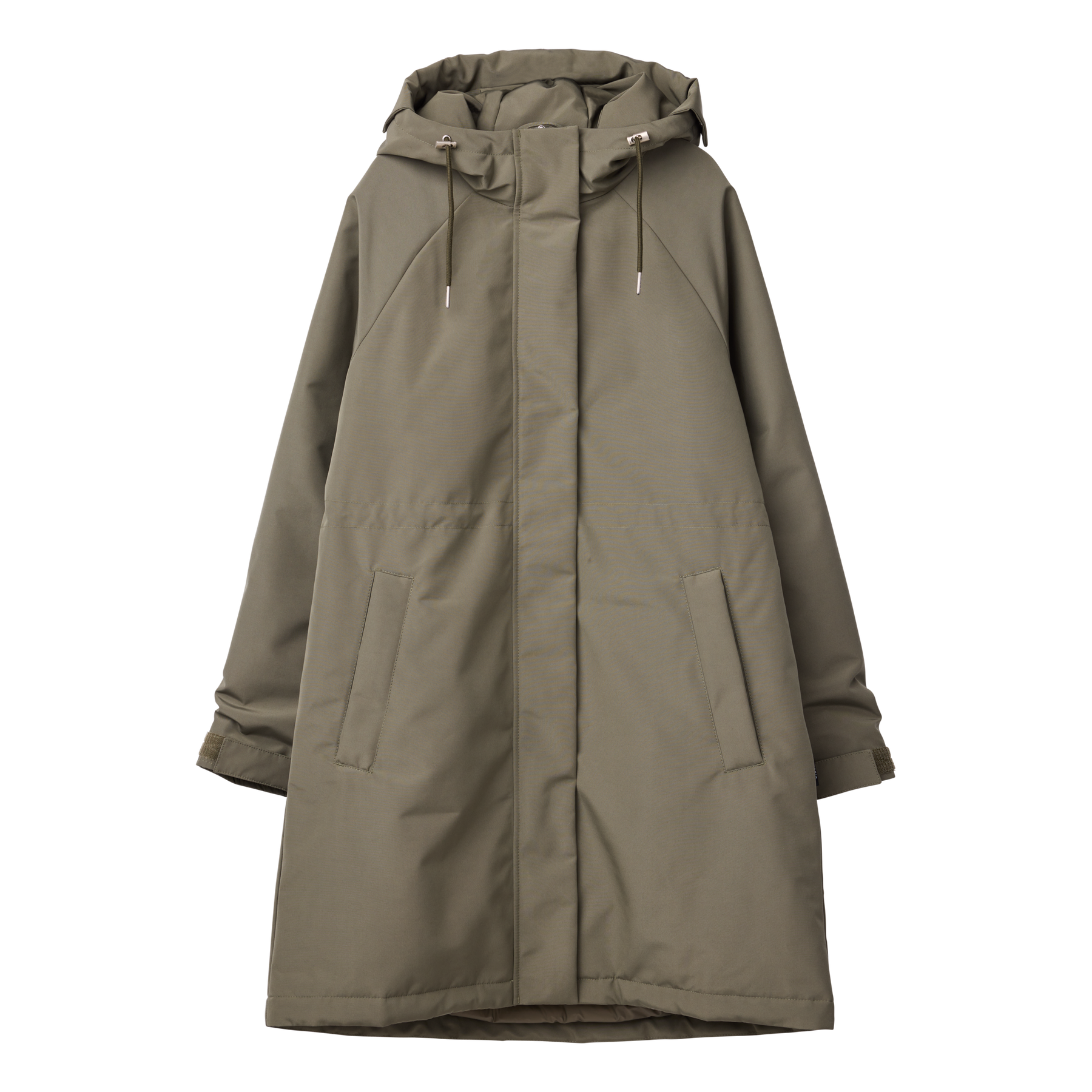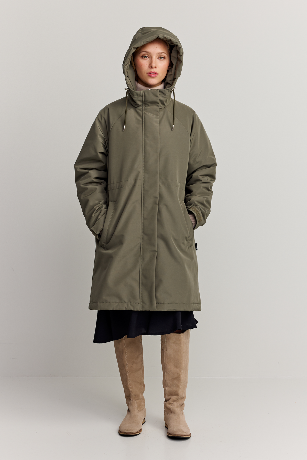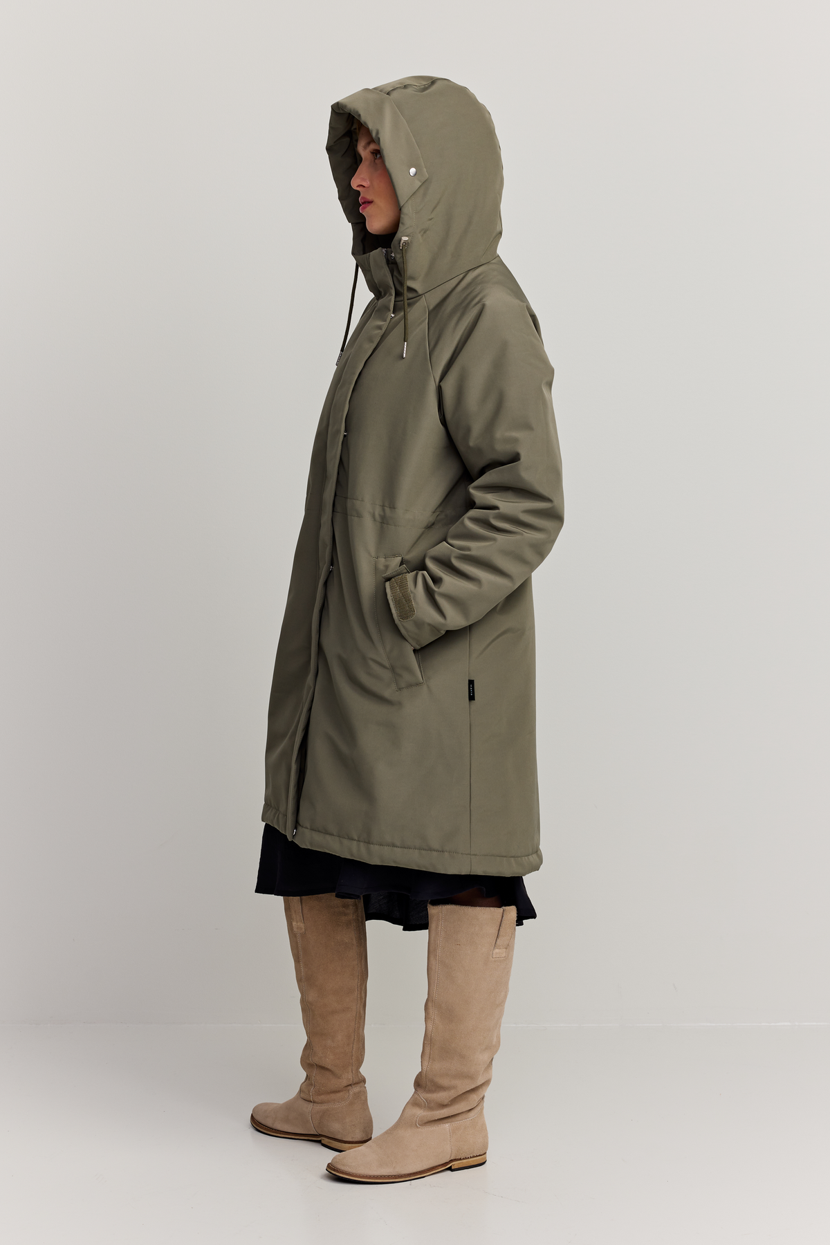 Tyylikäs kaupunkikäyttöön sopiva kevyt toppatakki Kaija Coat pehmeässä oliivinvihreässä sävyssä kotimaiselta Makialta!