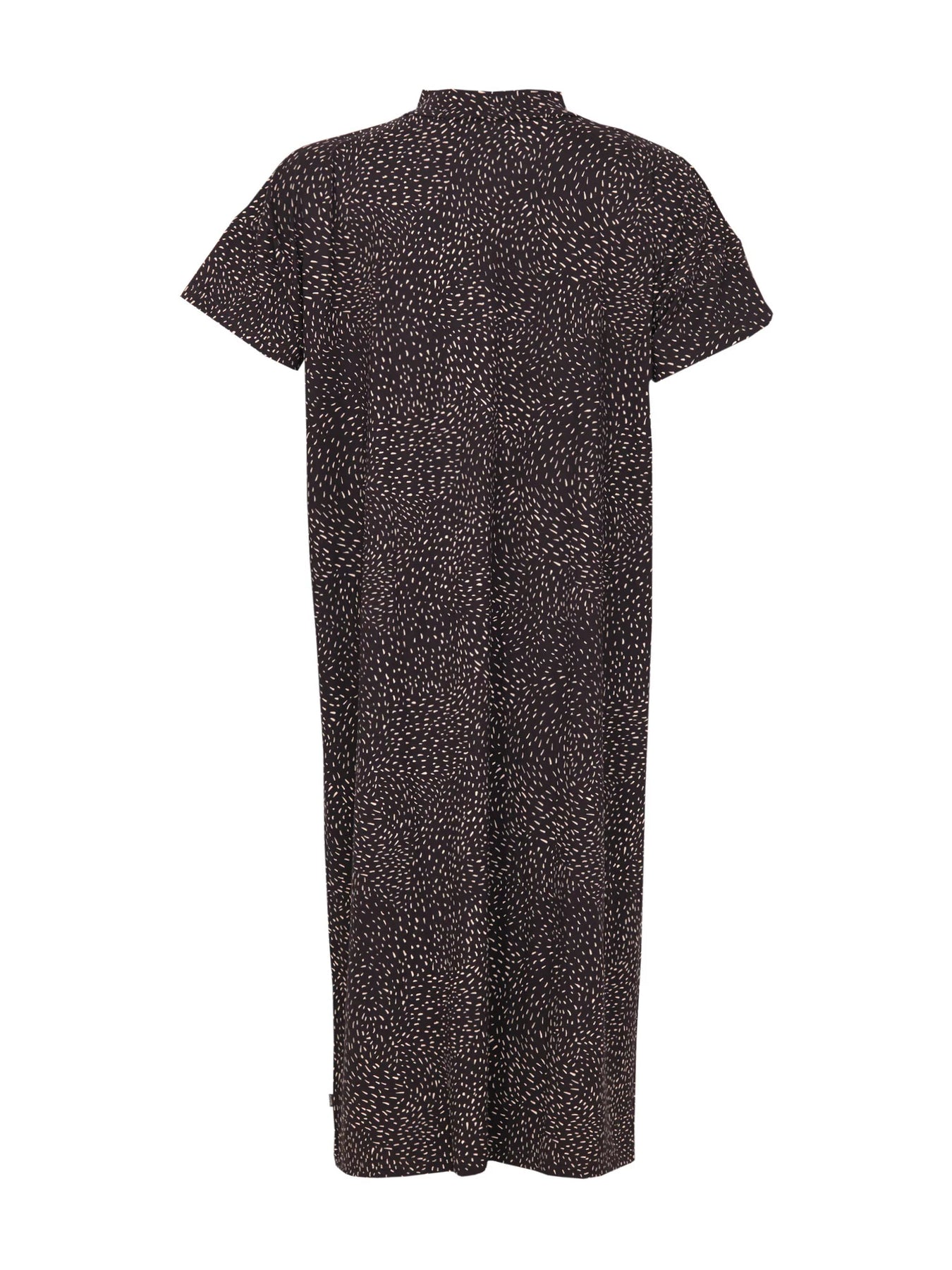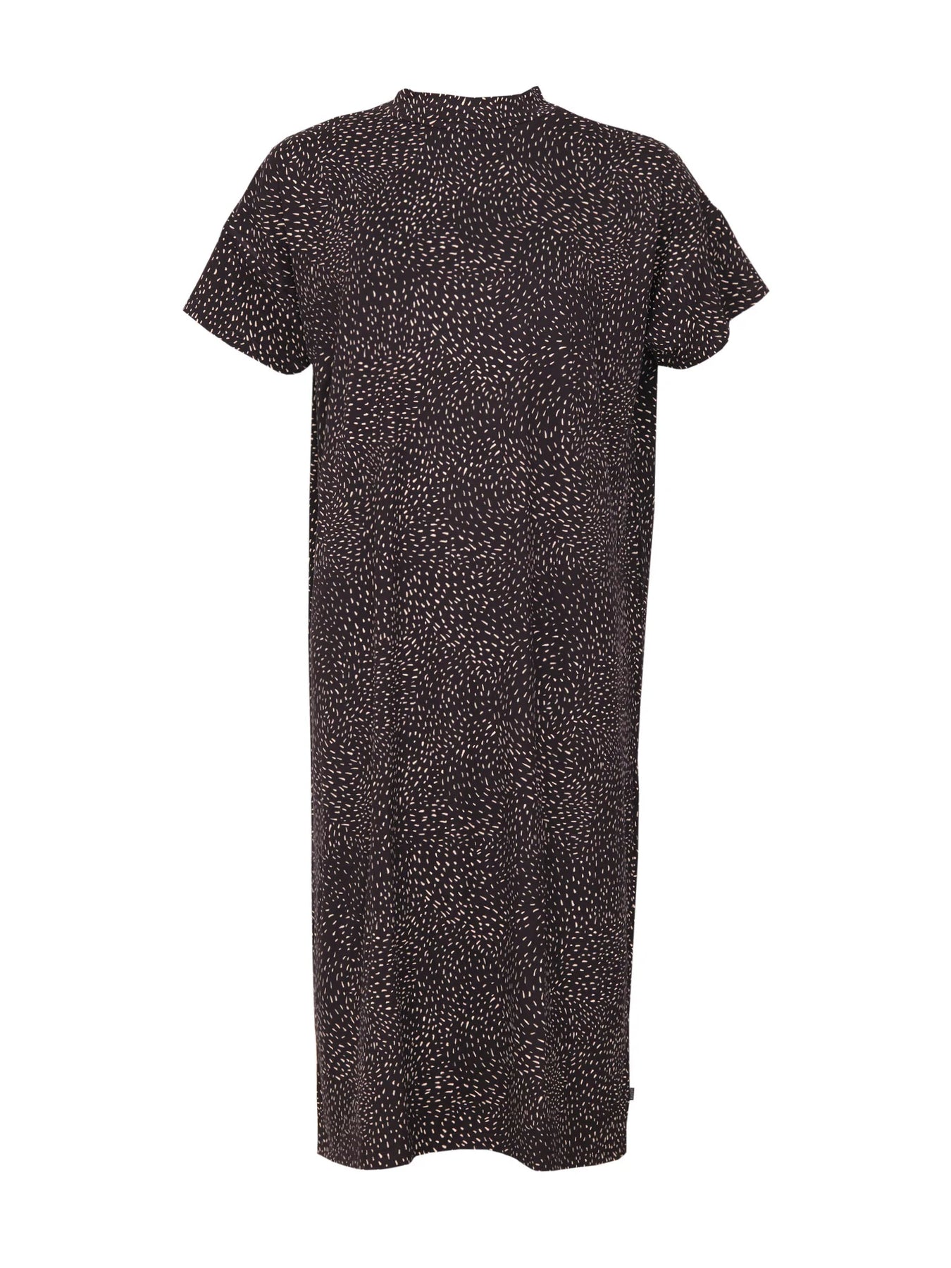 Naisten lyhythihainen mekko Hiekka-kuosilla. Laatikkomainen, väljä malli, jossa hieman korkeampi pääntie ja lyhyet hihat. Molemmilla sivuilla pienet halkiot. Materiaali tuntuu mukavan pehmeältä ja viileältä päällä. Tuote valmistettu Portugalissa.