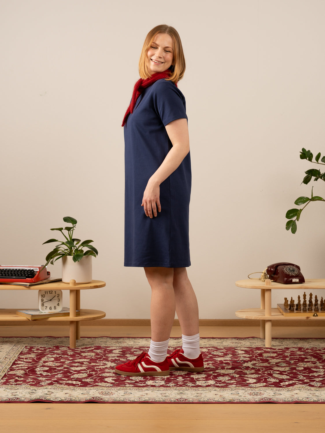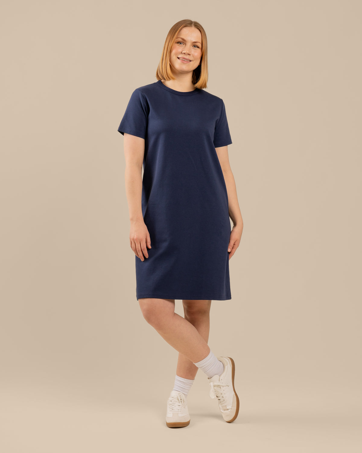 Jyväskyläläisen Toive Companyn tummansininen rennosti istuva t-paitamekko, joka on valmistettu hieman paksummasta ja ihanan sileästä neuloksesta. Arki t-paitamekon istuvuus on samanlainen kuin Toiveen Arki t-paidan: naisten mitoituksella tehty, mutta rento. Jos kaipaat skarppia t-paitamekkoa, joka säilyttää muotonsa, tutustu tähän!