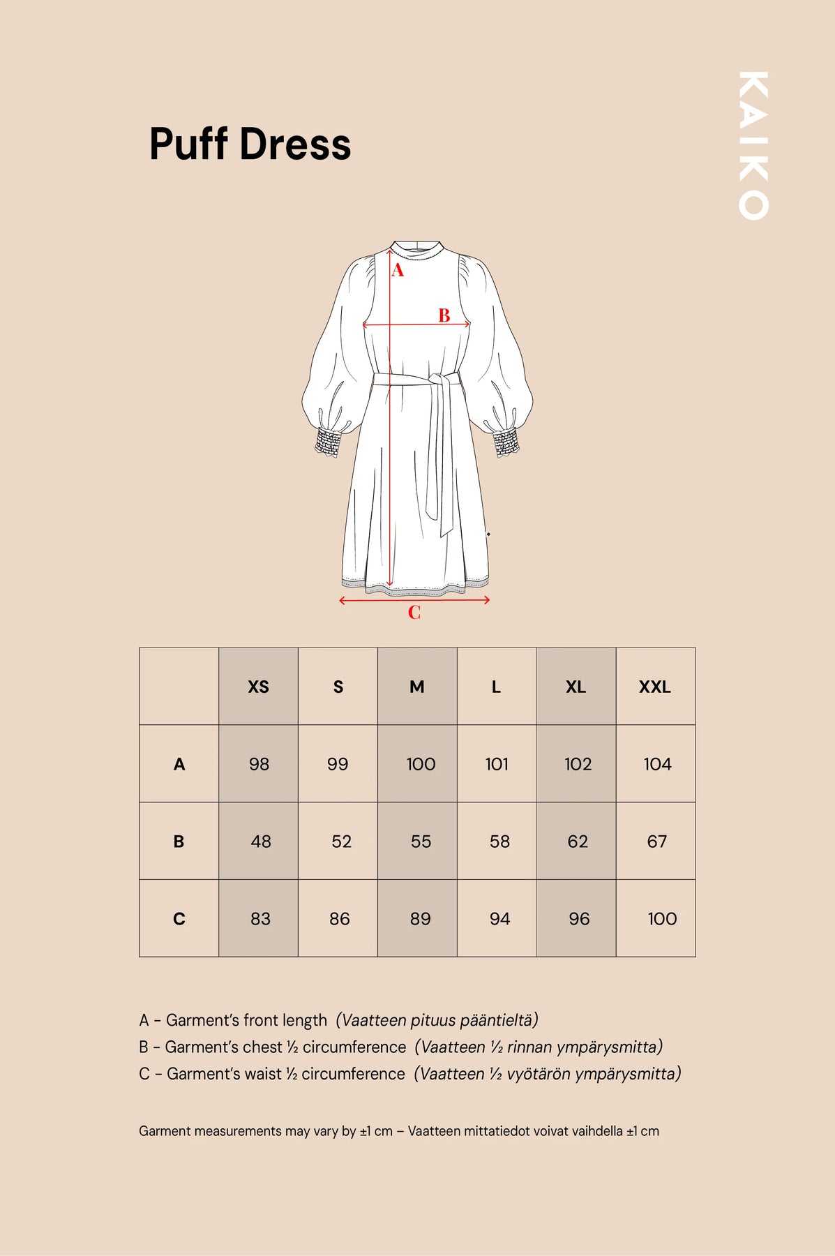 Neuvomme valitsemaan Puff Dressistä saman koon, jonka normaalistikin valitsisit. M koossa tuotteen pituus olalta helmaan 100 cm ja leveys rinnan kohdalla 54 cm.