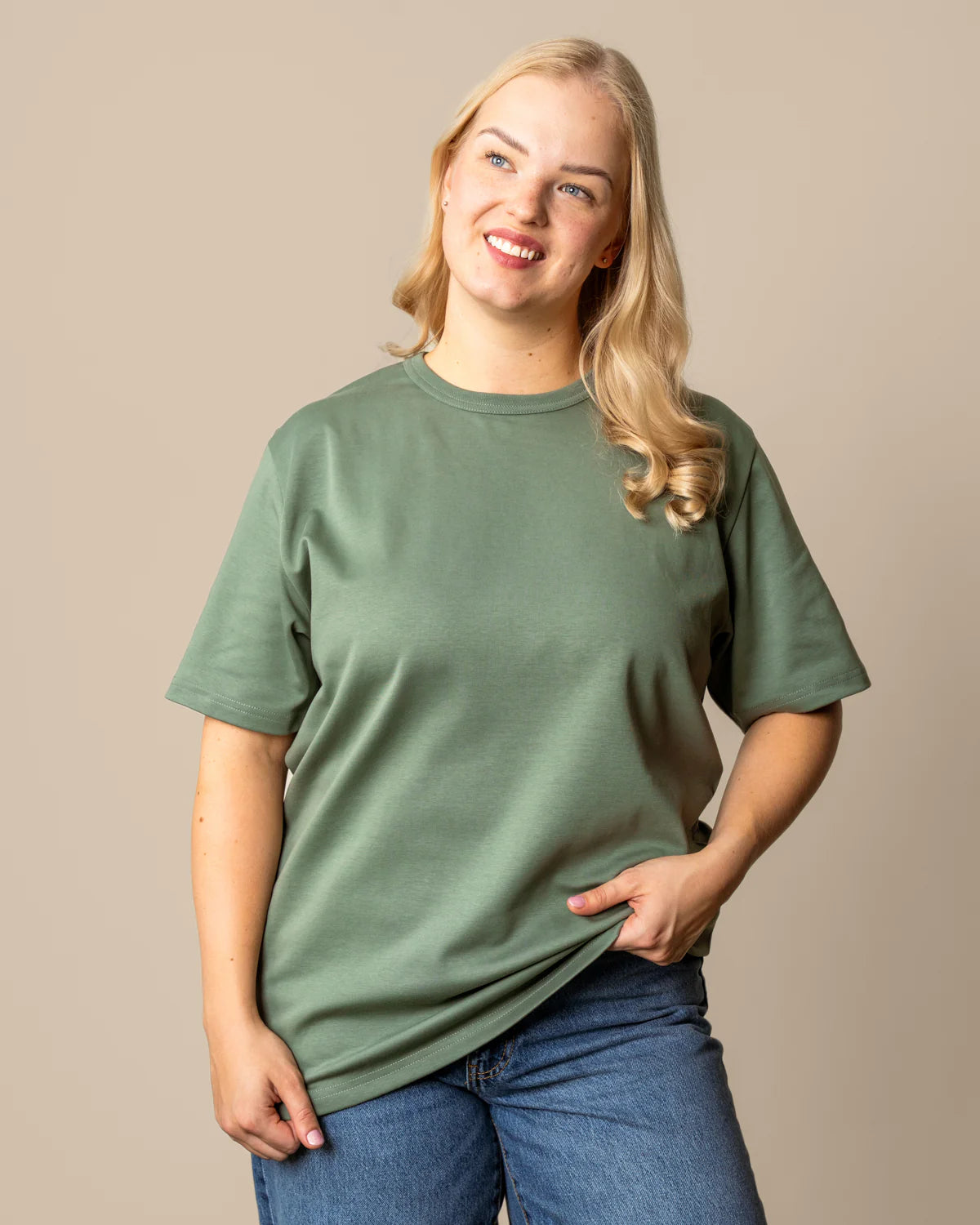 Toive Companyn laadukas Ajaton t-paita on rentoa unisex-mitoitusta ja se on malliltaan pidempi. Saatavilla useissa eri väreissä, tässä kaunis harmaanvihreä sävy Salvia!
