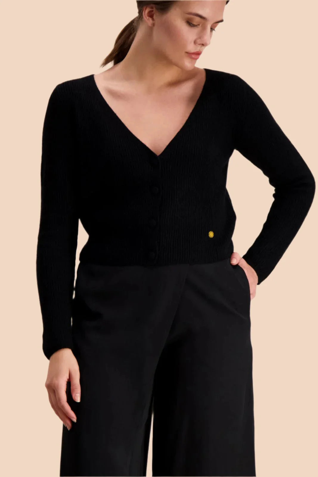 Tyylikäs, ajaton ja unelmanpehmeä Cashmere Cardigan tuo hellää luksuksentuntua arkeen. Kahmirsekoitteisessa neuletakissa on lyhyt helma, pitkät hihat, syvä v-pääntie ja elegantit neulospäällysteiset napit. Kaikon Cashmere Cardigan sopii yhtä hyvin pidettäväksi korkeavyötäröisten alaosien kanssa kuin tuomaan kerroksia pitkiin linjoihin. Neulosrakenne on puolipatenttia, joka luo neuletakille kauniin eläväpintaisen tekstuurin. Kashmirvillasekoite on materiaalina ihanan pehmeä, kevyt ja hengittävä. Värinä klassinen musta.