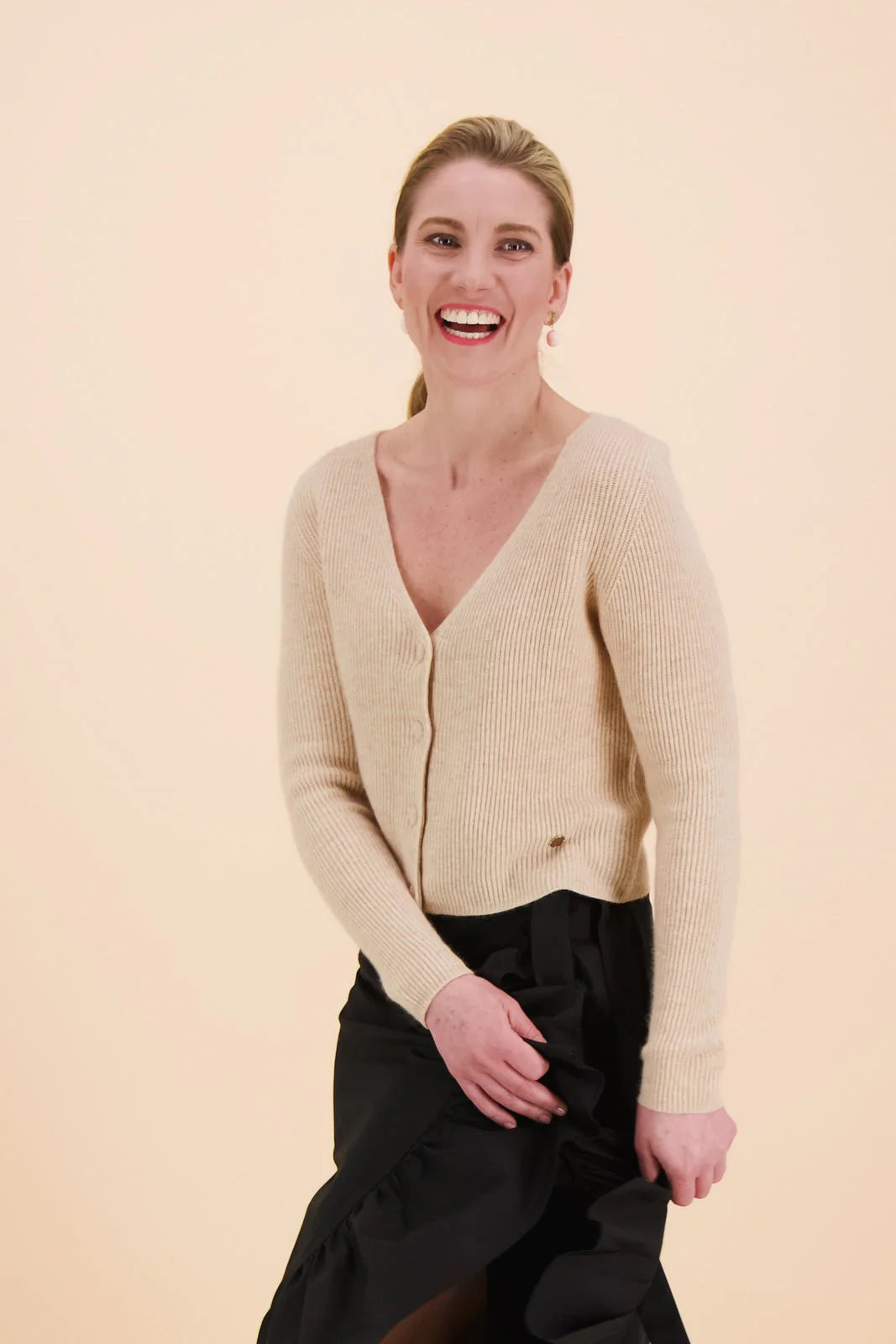 Kaiko Clothingin tyylikäs vajaamittainen kashmir-neuletakki vaalean beigessä Hay-sävyssä!