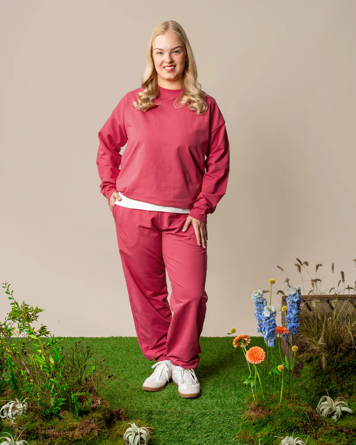 Toive Companyn rennot collegehousut rennolla istuvuudella. Unisex-mitoitus, istuvuus on väljä. Ihana marjapuuron punainen sävy!