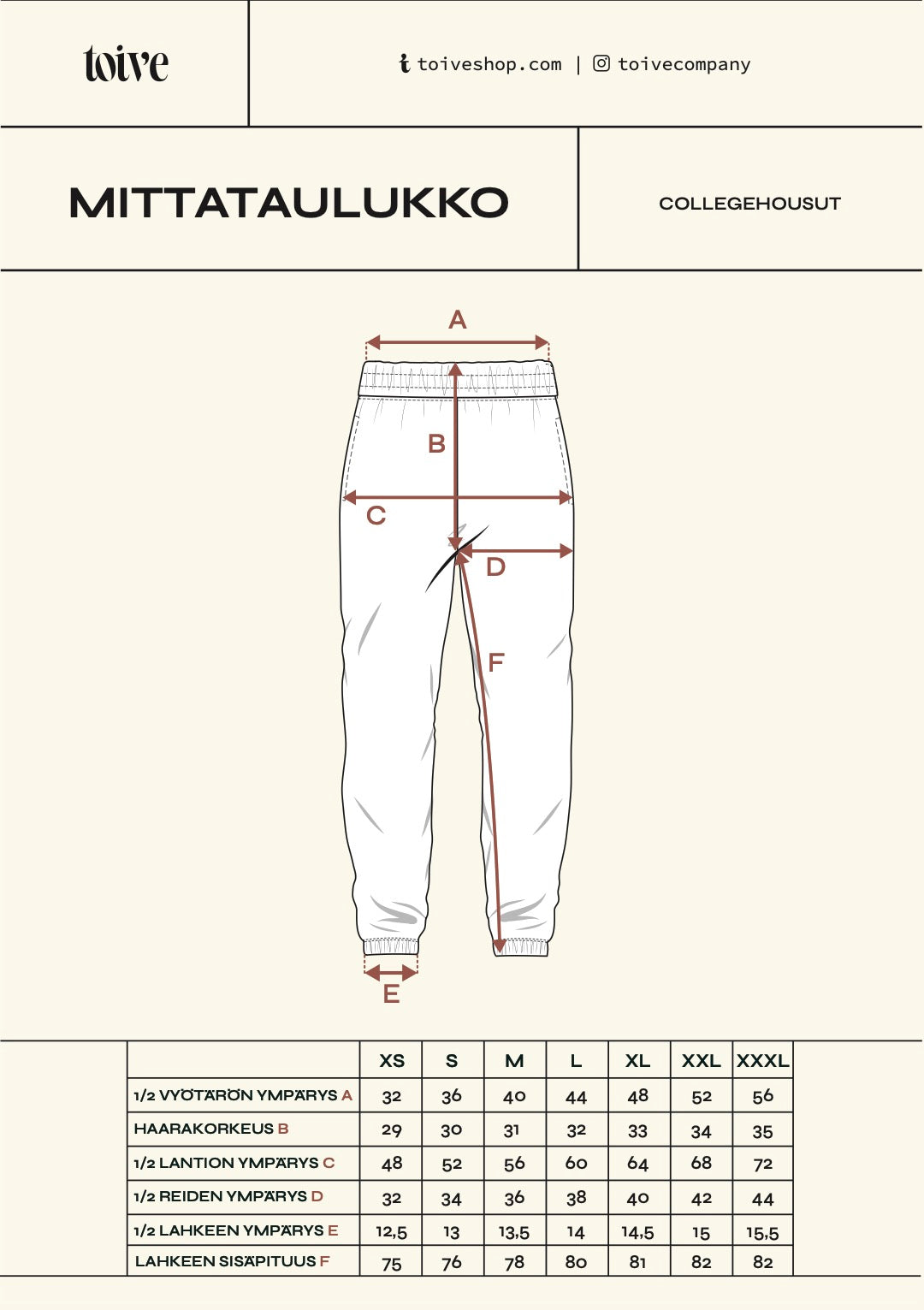 Housujen malli on rento. Vyötäröllä on kuminauhakiristys, jonka lisäksi collegehousun sisäpuolelta löydät narut, joilla voit kiristää vyötäröä.
