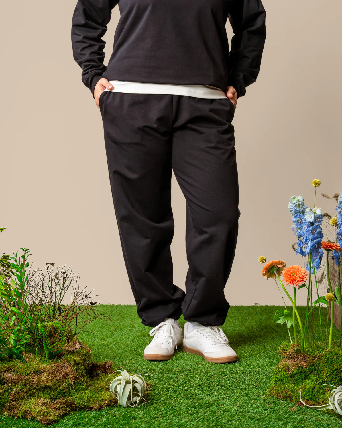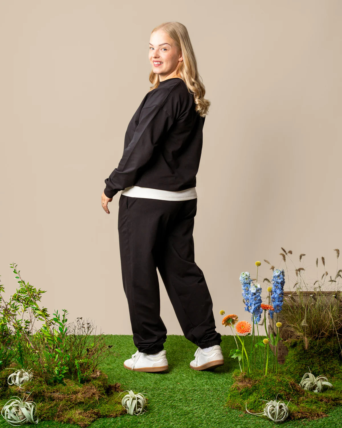 Toive Companyn rennot mustat collegehousut rennolla istuvuudella. Unisex-mitoitus, istuvuus on väljä.