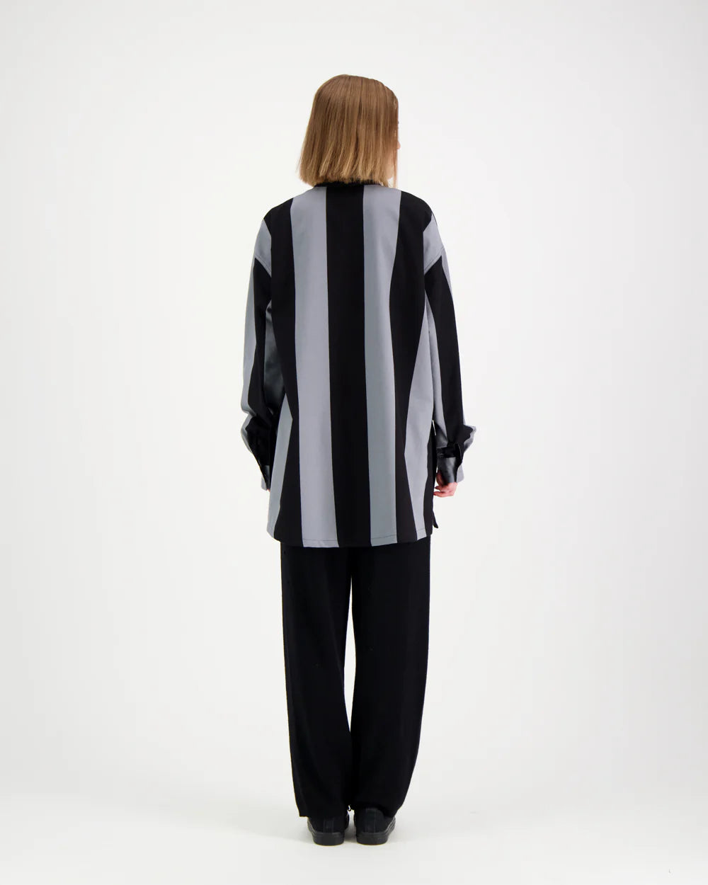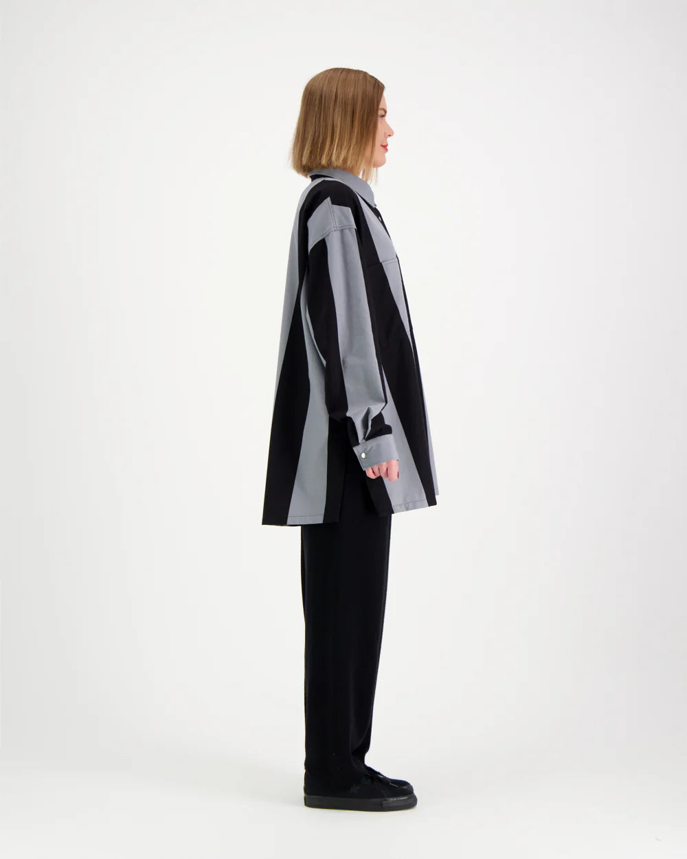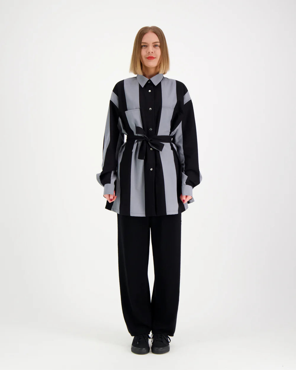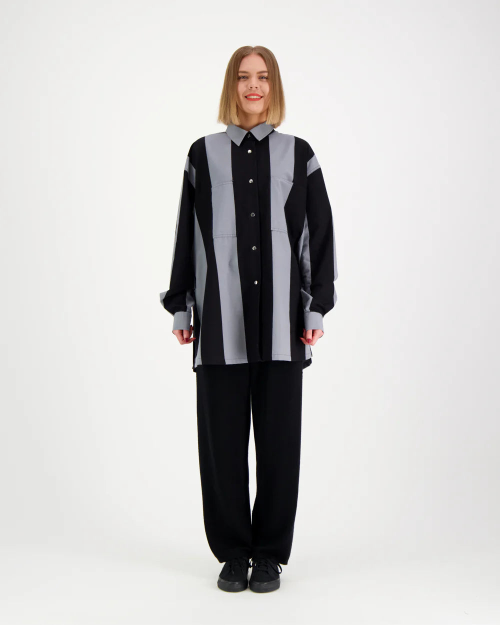 Vuokon klassikkotuote, yhden koon rento kauluspaita joka sopii jokaiselle! Tässä värivaihtoehtona musta-harmaa Jokiraita-pystyraitakuosi.