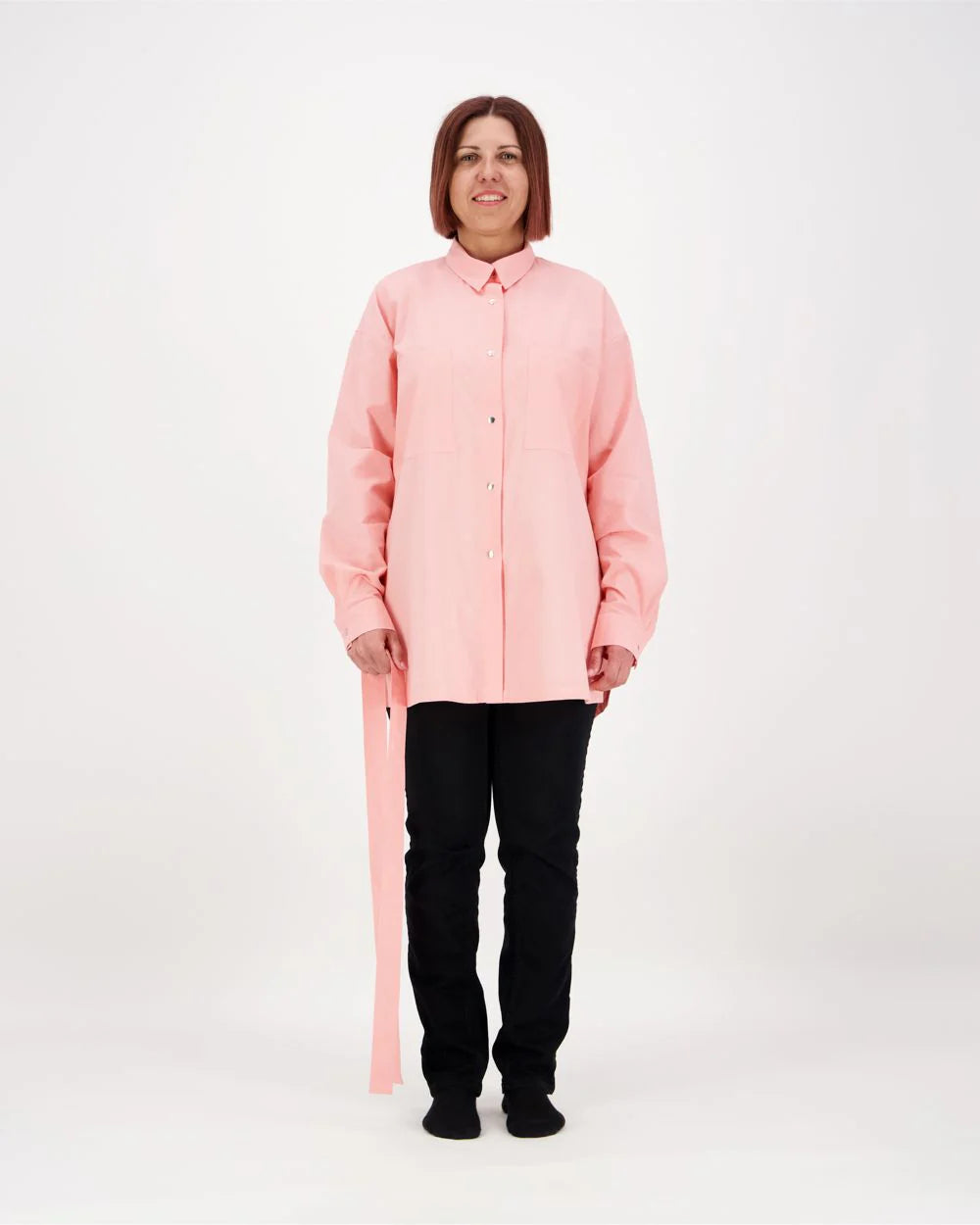 Rento yhden koon kauluspaita. Oversize-paidassa on kaksi rintataskua, nepparit edessä ja hihansuissa, halkiot sivussa ja laskokset selässä. Mukana myös vyö samasta kuosista.