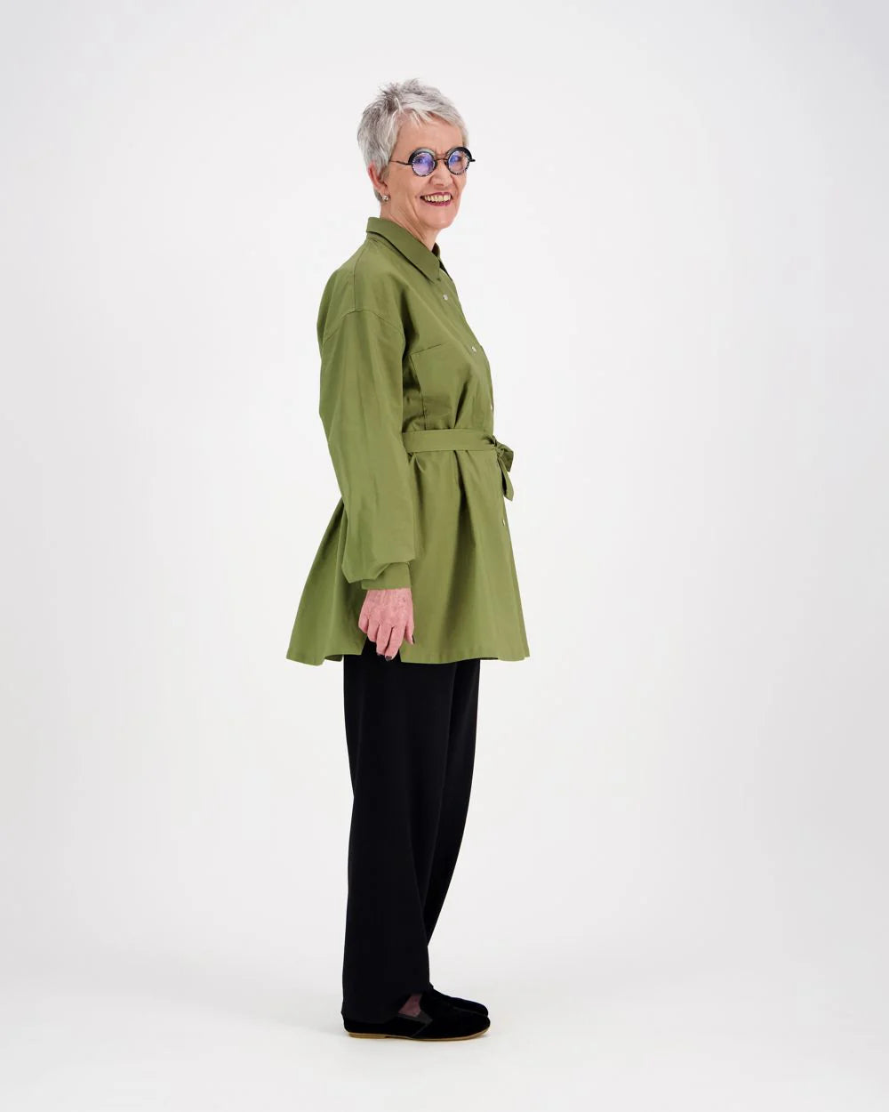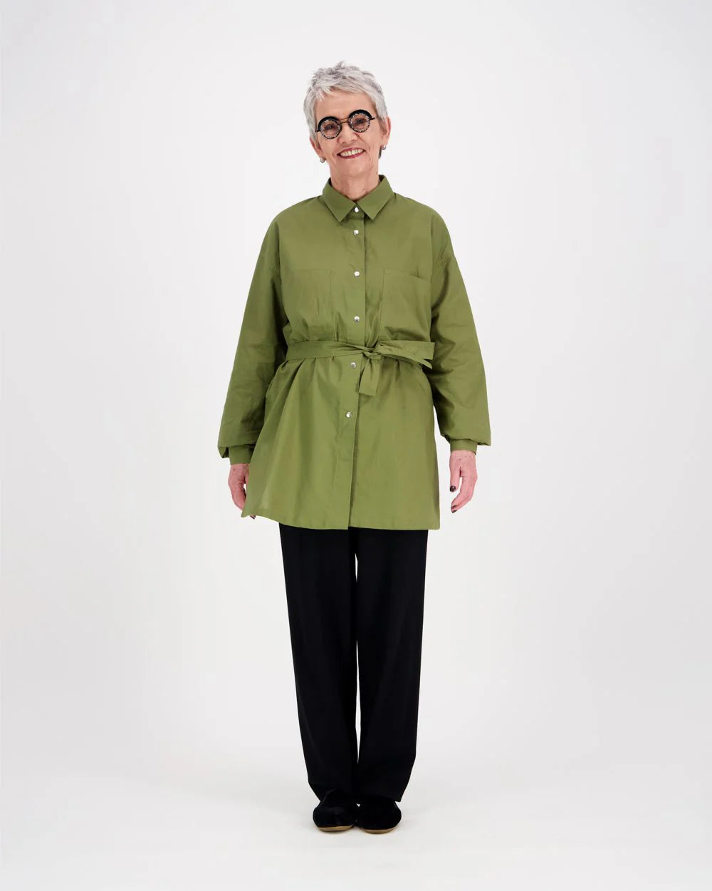 Rento yhden koon kauluspaita. Oversize-paidassa on kaksi rintataskua, nepparit edessä ja hihansuissa, halkiot sivussa ja laskokset selässä. Mukana myös vyö samasta kuosista.