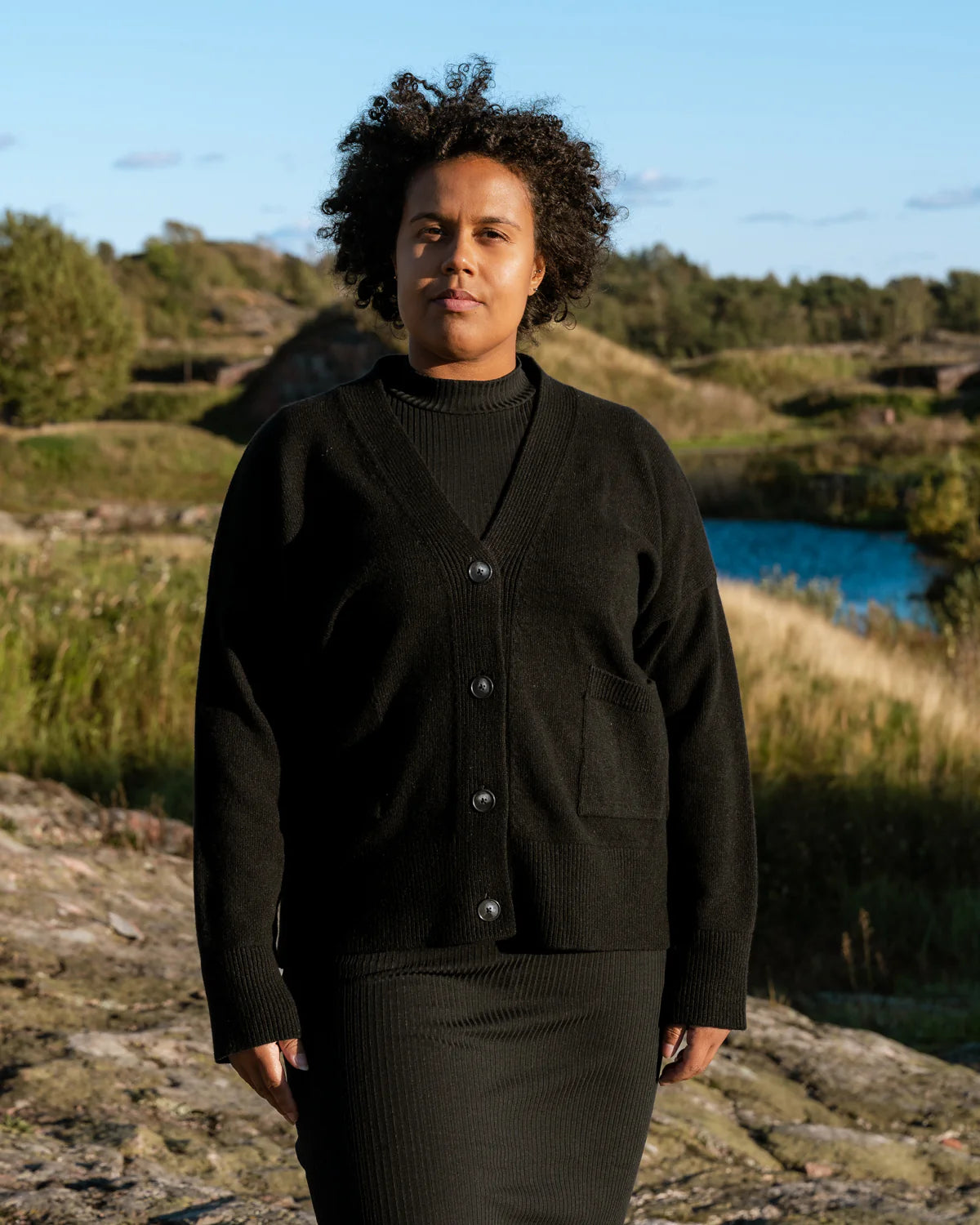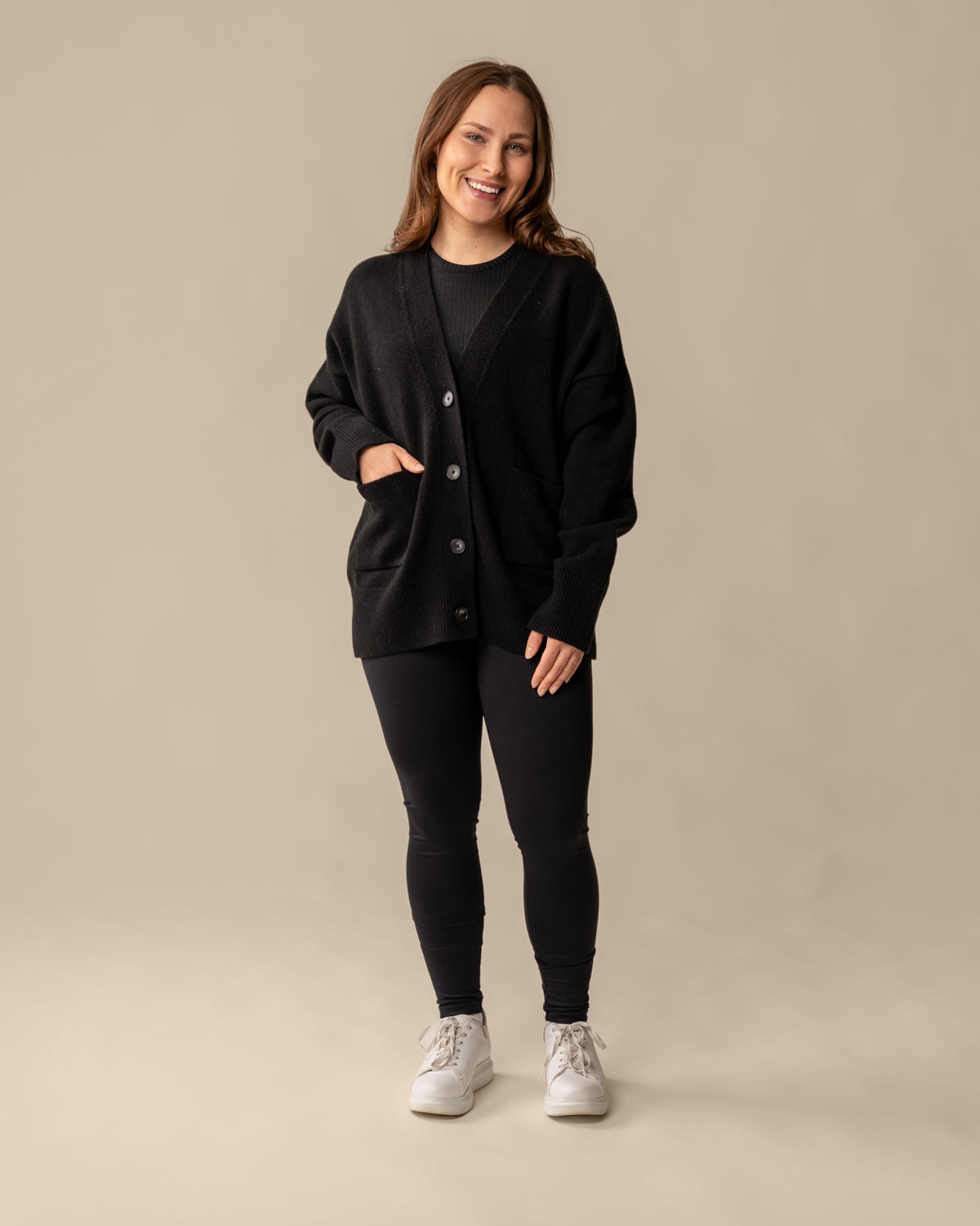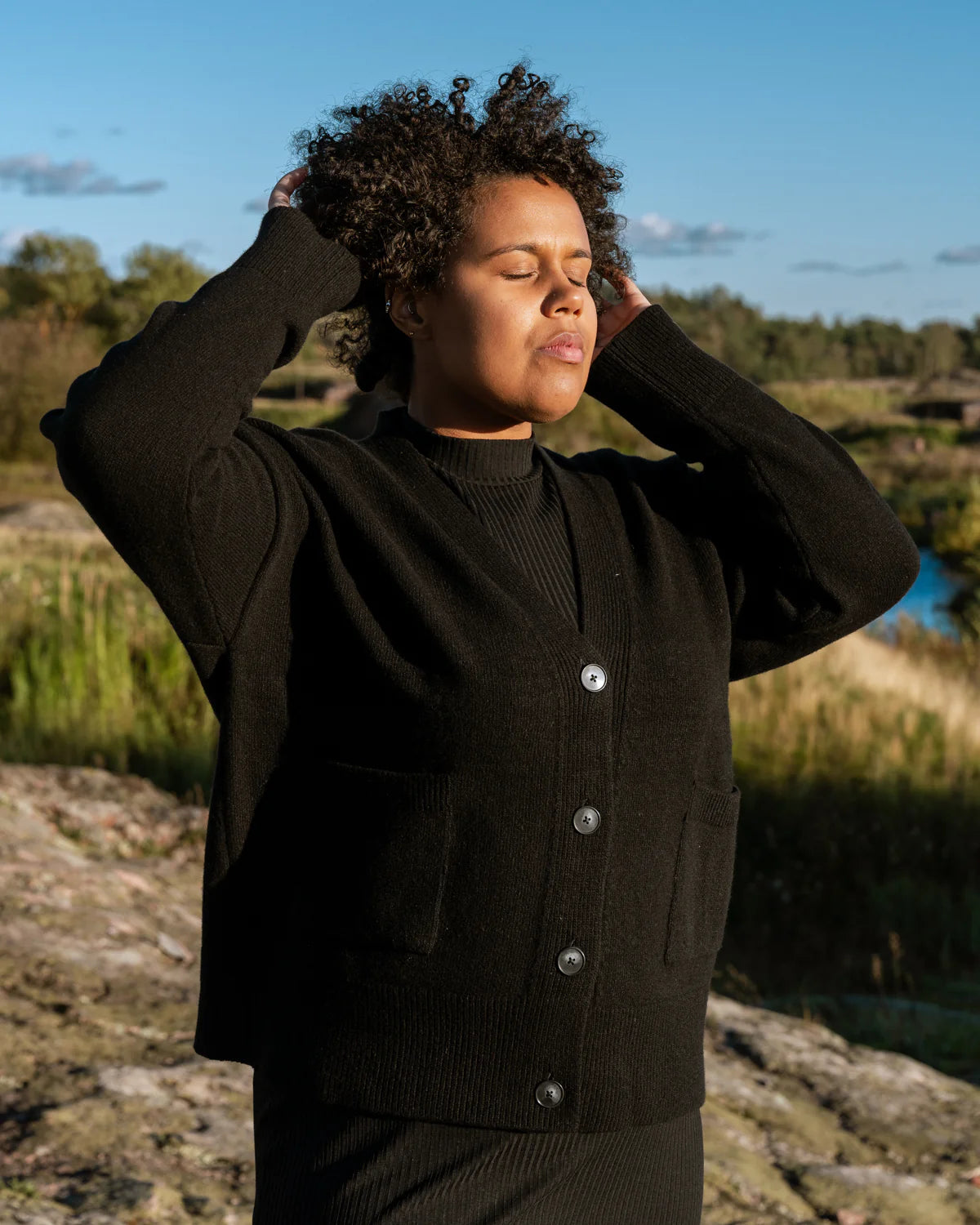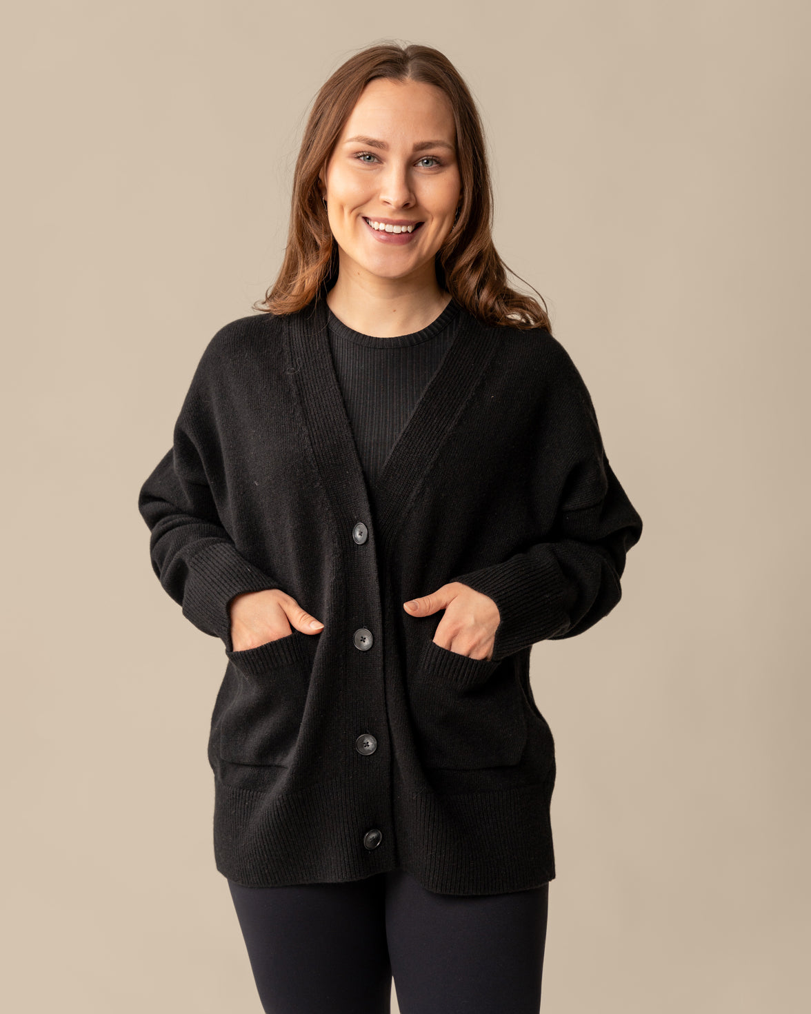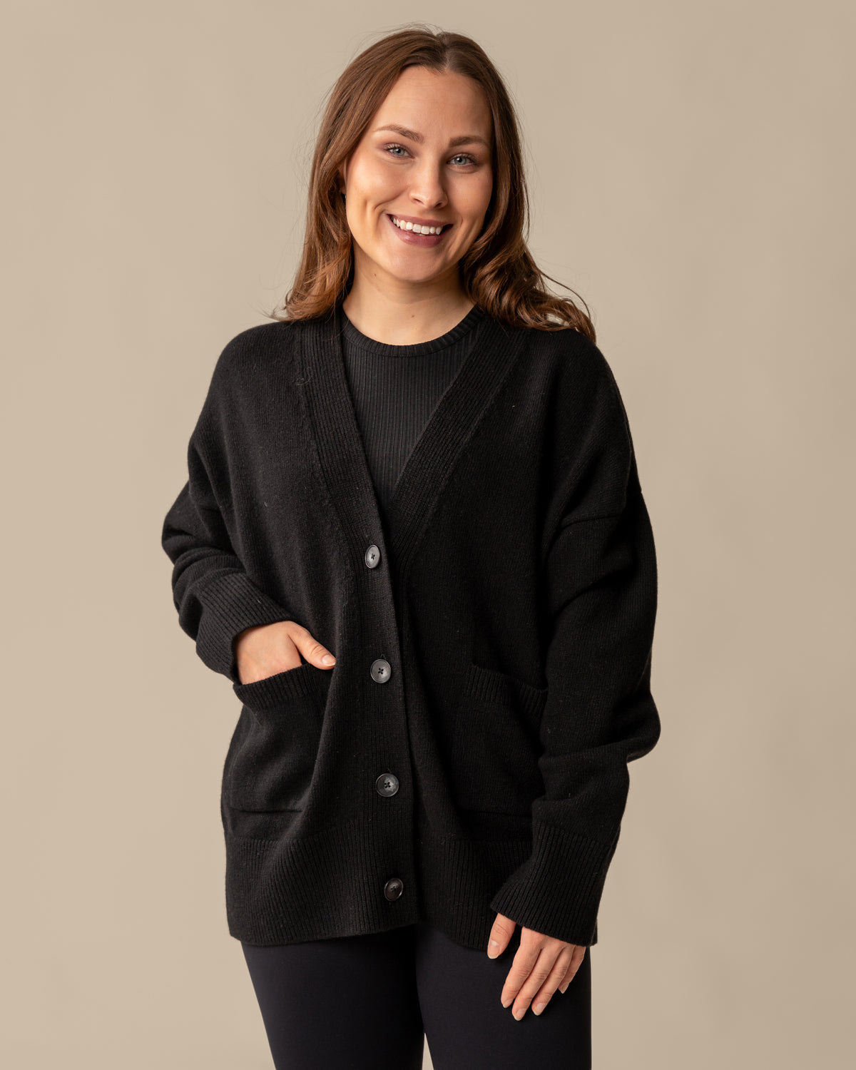Toive Companyn Kaste-neuletakki on ihanan monipuolinen vaatekaapin kulmakivi, sillä se sopii käytettäväksi ympäri vuoden. Taskut ja napit yksityiskohtina kruunaavat tämän neuletakin. Sävynä monikäyttöinen musta. Neuletakki on valmistettu 100% mulesing-vapaasta merinovillasta.