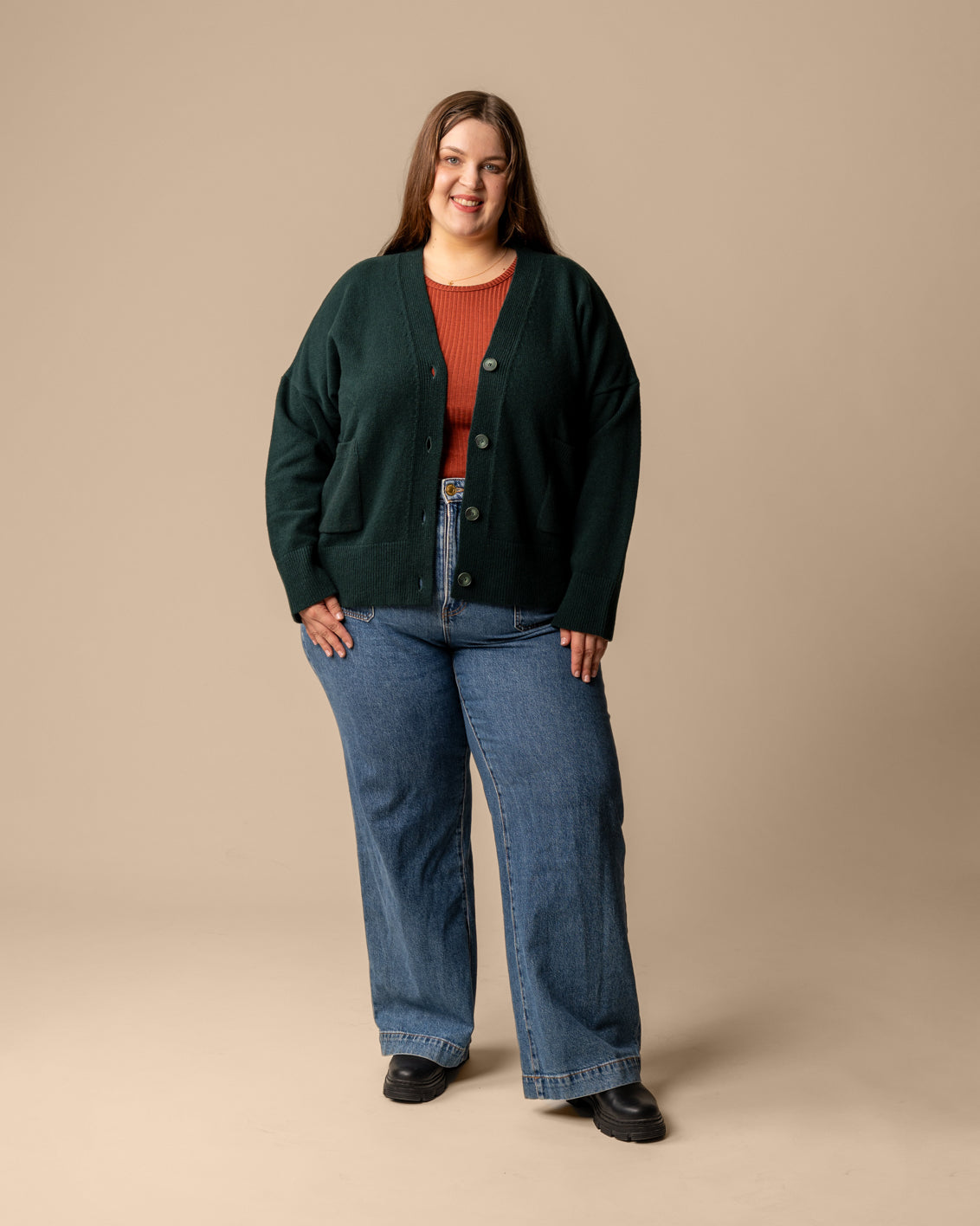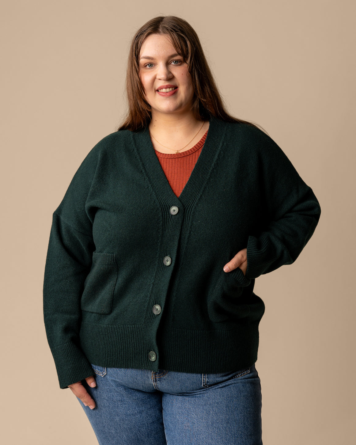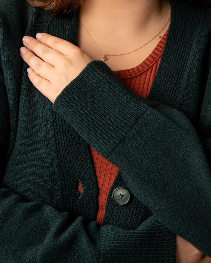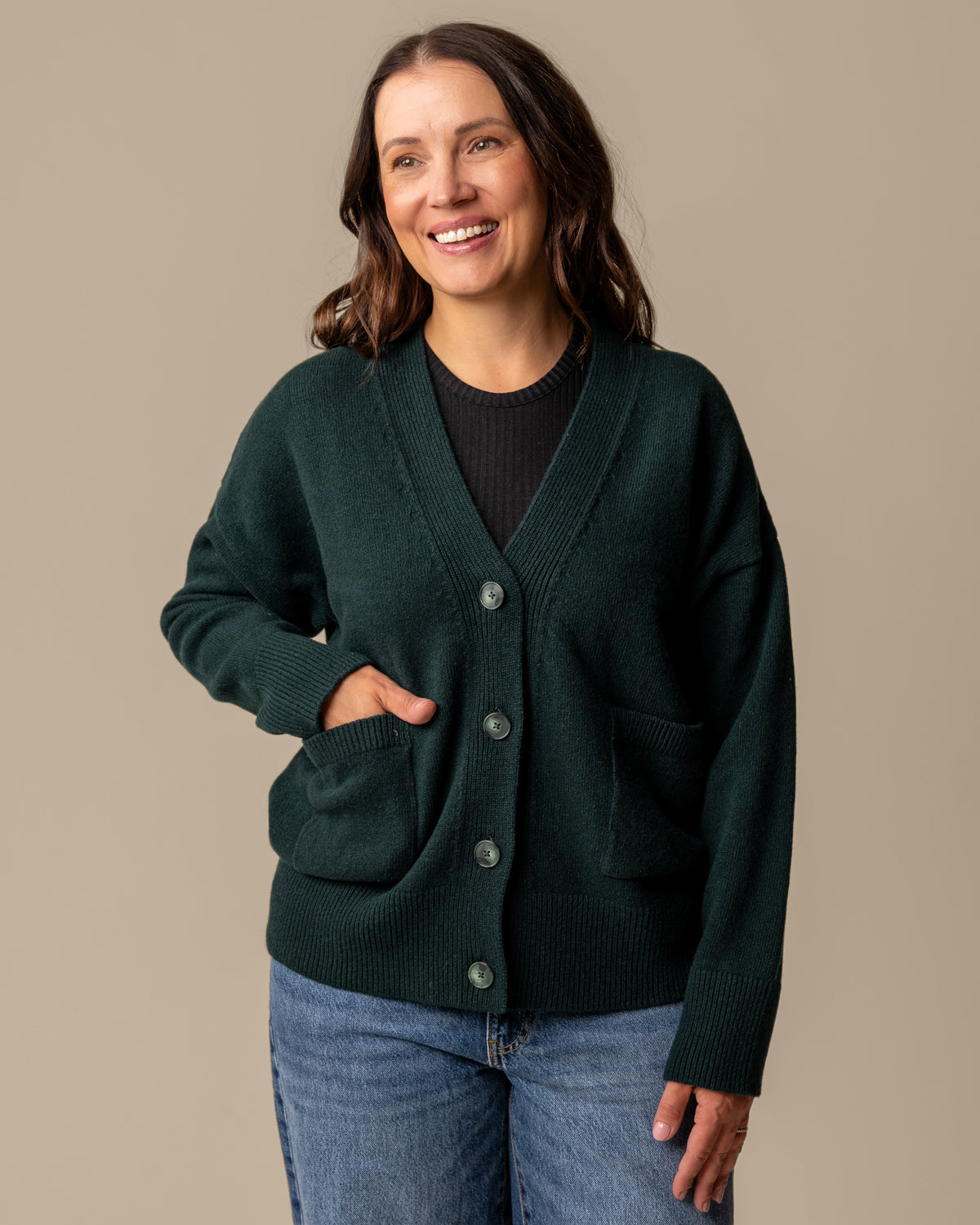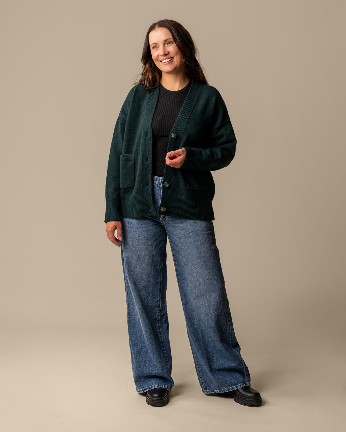 Toive Companyn Kaste-neuletakki on ihanan monipuolinen vaatekaapin kulmakivi, sillä se sopii käytettäväksi ympäri vuoden. Taskut ja napit yksityiskohtina kruunaavat tämän neuletakin. Sävynä suosittu tummanvihreä. Neuletakki on valmistettu 100% mulesing-vapaasta merinovillasta.
