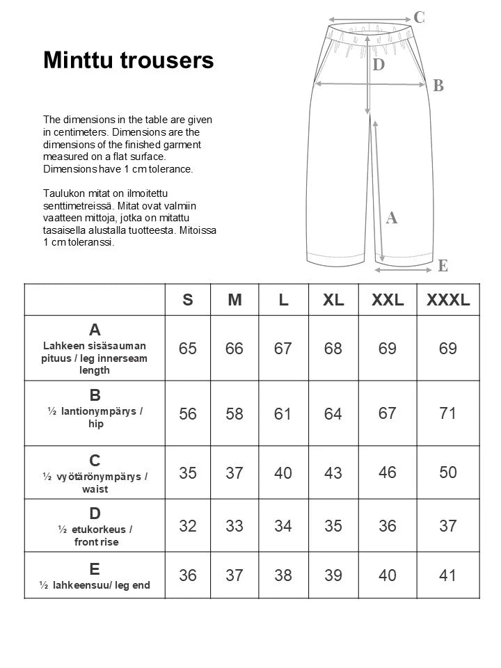 Naisten vahvempi trikoohousu Minttu mustavalkoisella Block-kuosilla. Materiaali on painavampaa ja tukevampaa verrattuna tavalliseen trikooseen. Housuissa on taskut ja joustava vyötärö.