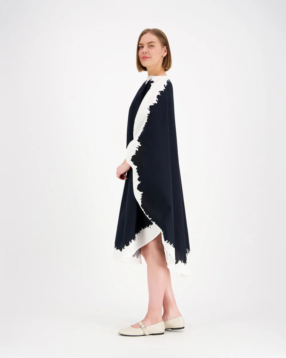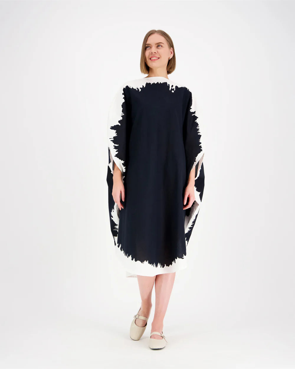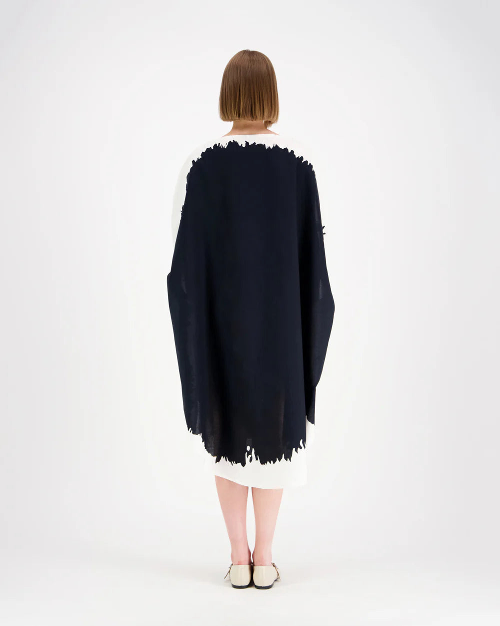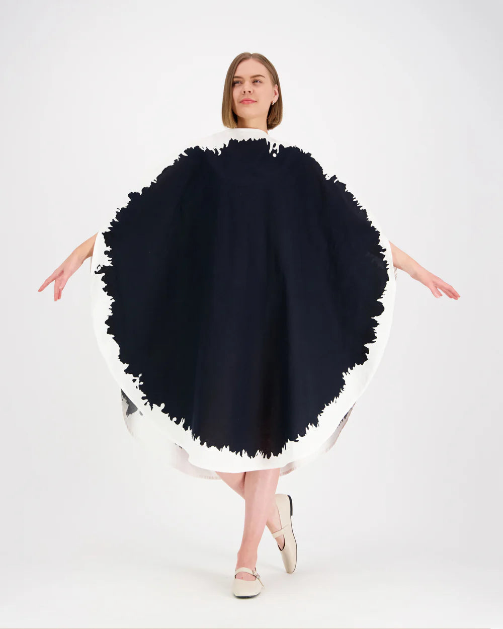 Pyöreä Vuokko-klassikko vuodelta 1964. Venepääntie ja sivusaumoissa aukot käsille. Puku on väljää mallia ja laskeutuu kauniisti, voi käyttää myös vyön kanssa. Nostamalla kädet sivuille suoraksi, mekko muodostaa täyden ympyrän – hauskaa ja pelkistettyä!