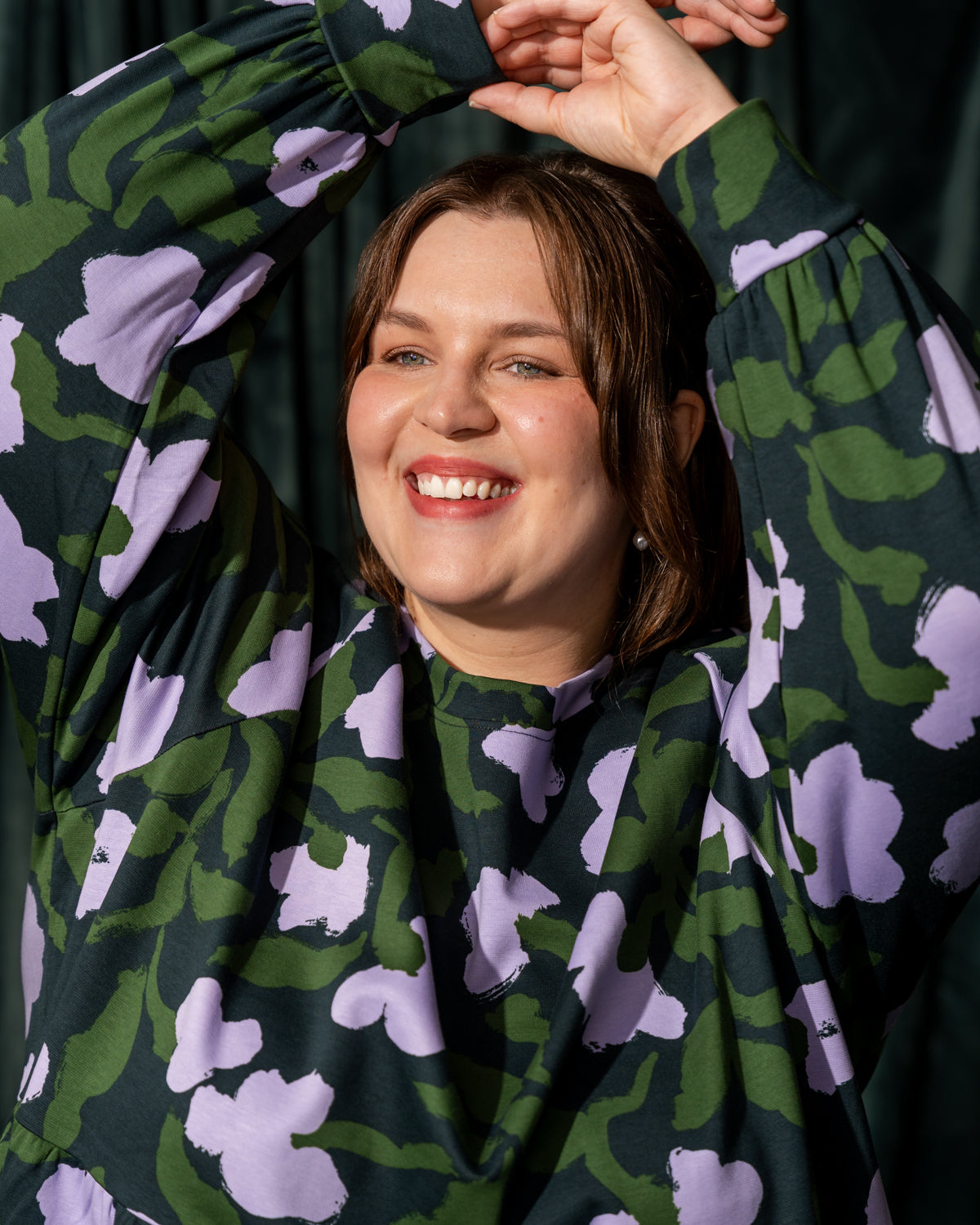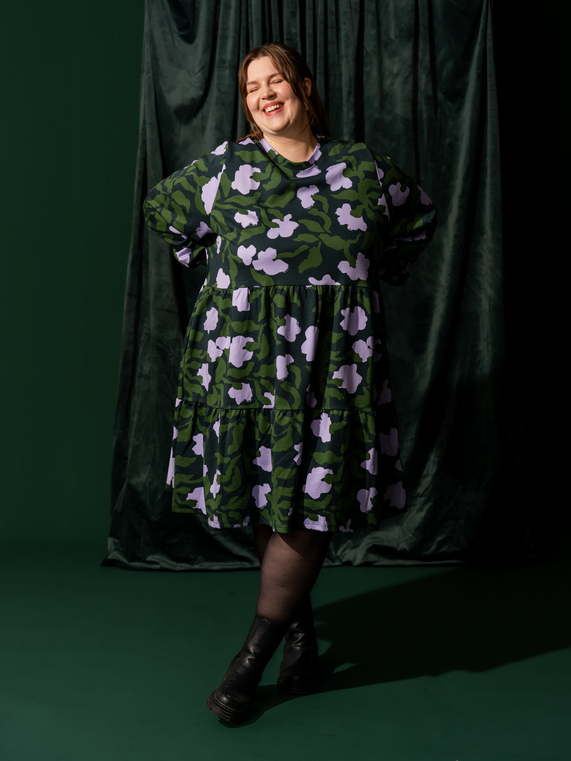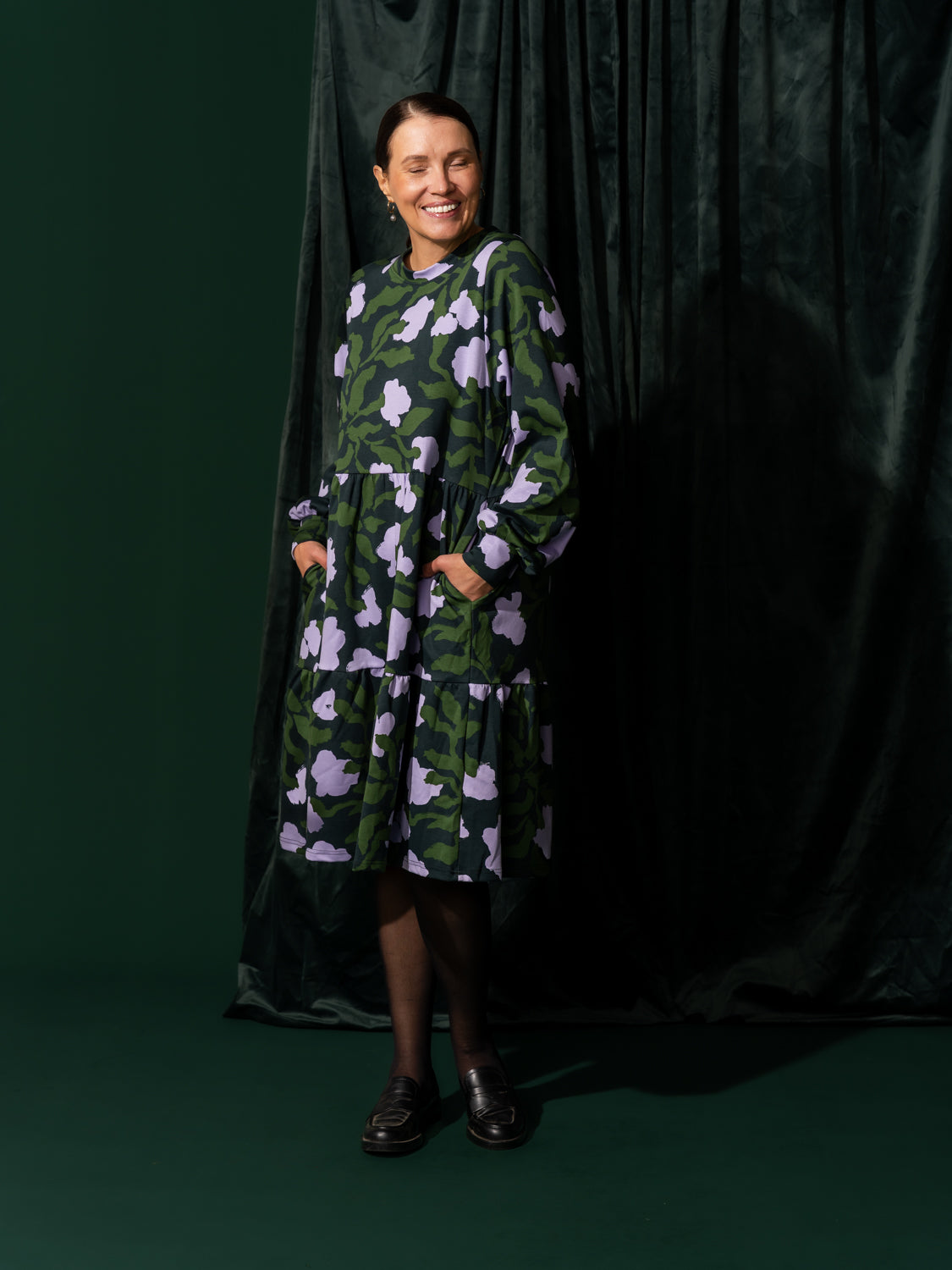 Toive Companyn ihana pitkähihainen mekko, jossa tyylikäs frillahelma. Upea mystinen vihreä-liila Köynnös-kuosi.