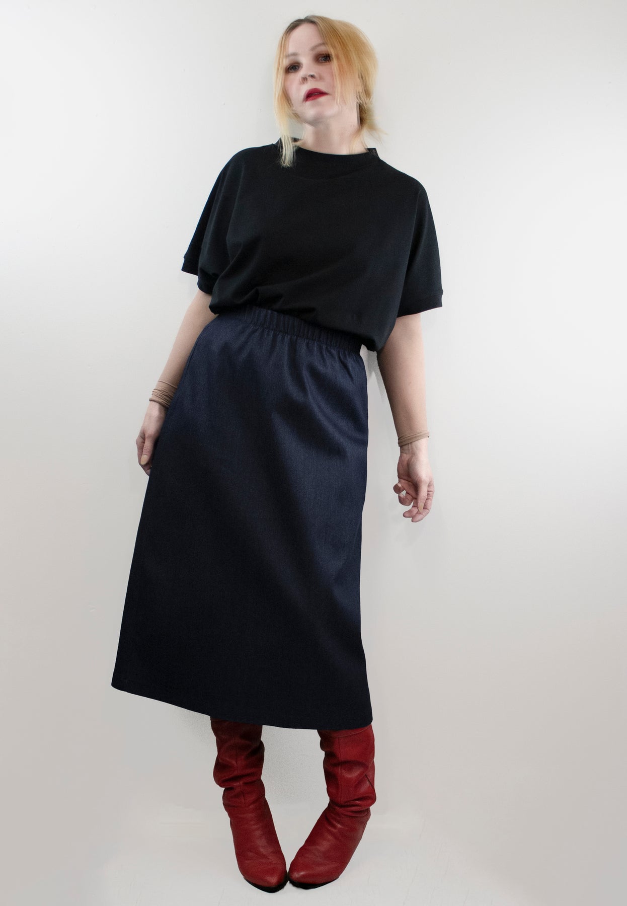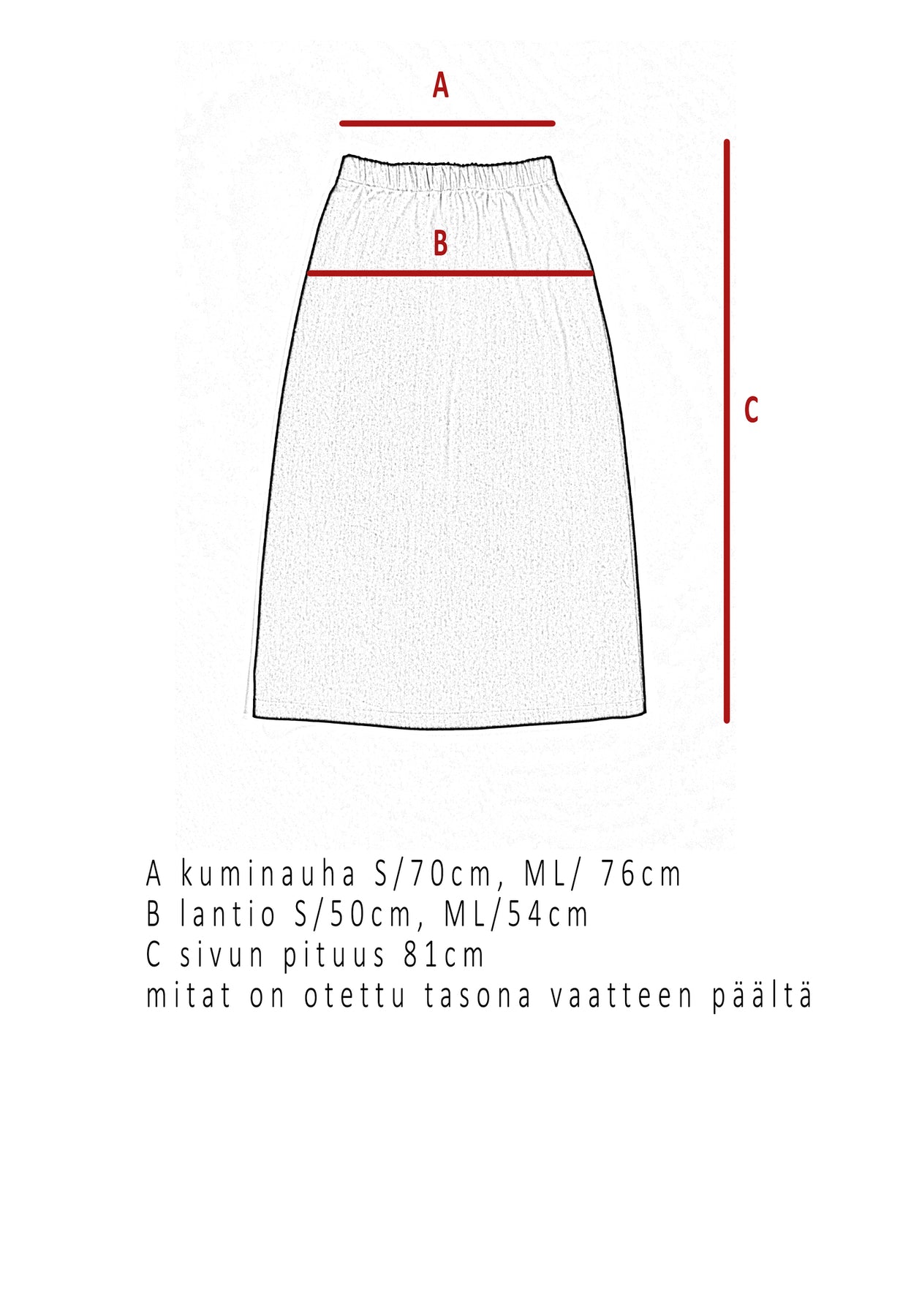 Sanna Hopiavuoren tyylikäs kapealinjainen farkkuhame joustavasta farkkukankaasta. Vyötäröllä mukava ja leveä kuminauha.