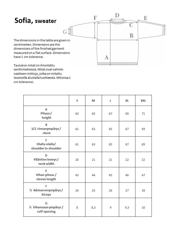 Pesu 40°C. Valkaisu, rumpukuivaus ja kemiallinen pesu kielletty. Pese nurja puoli ylöspäin samanväristen kanssa. Muotoile kosteana. Pesun jälkeen kuivaa tasolla. Silitys nurjalta puolelta maksimissaan 150 °C. Kutistuvuus maksimissaan 8 %.