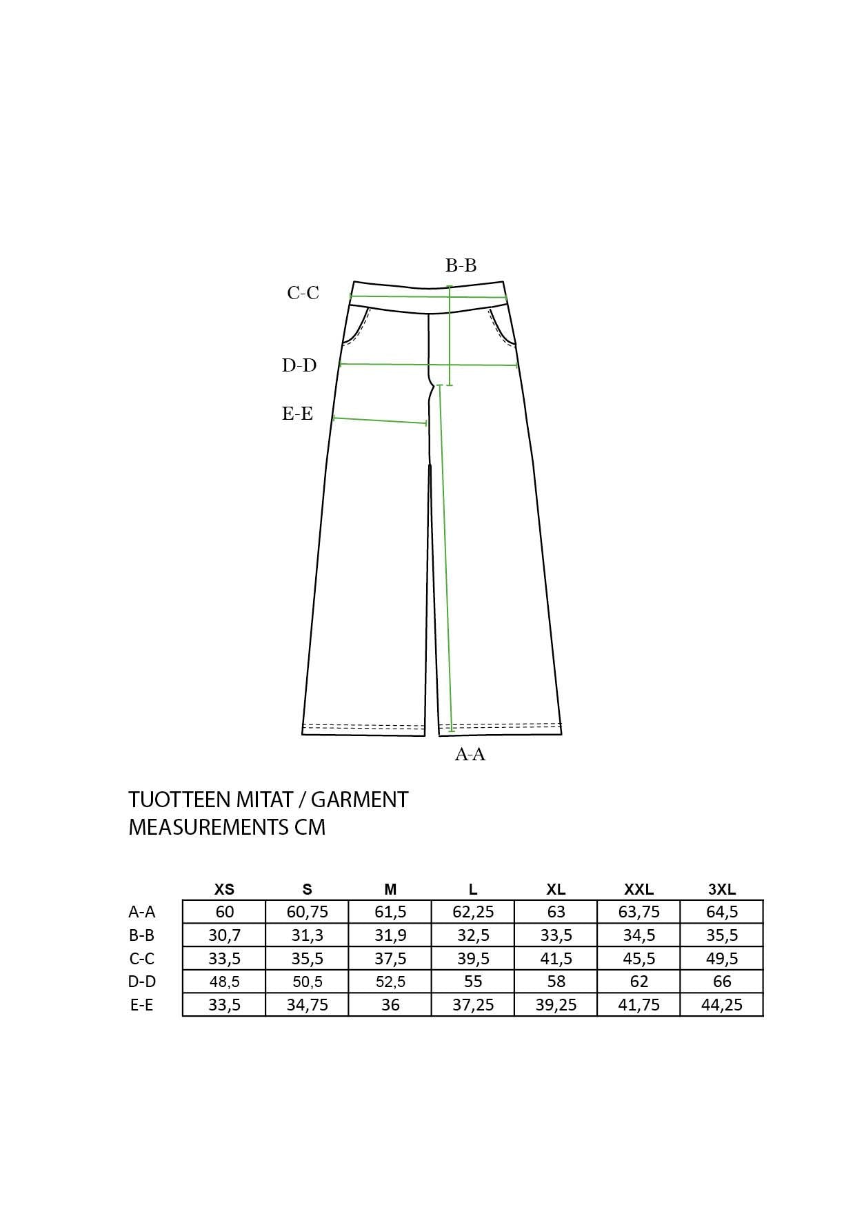 Vinkki: Neulos antaa leveydestä jonkin verran myöden käytössä, mutta palautuu pesussa takaisin mittoihinsa. Pesuväliä voi pidentää myös höyryttämällä housut paikallisesti esim. polvipussit.