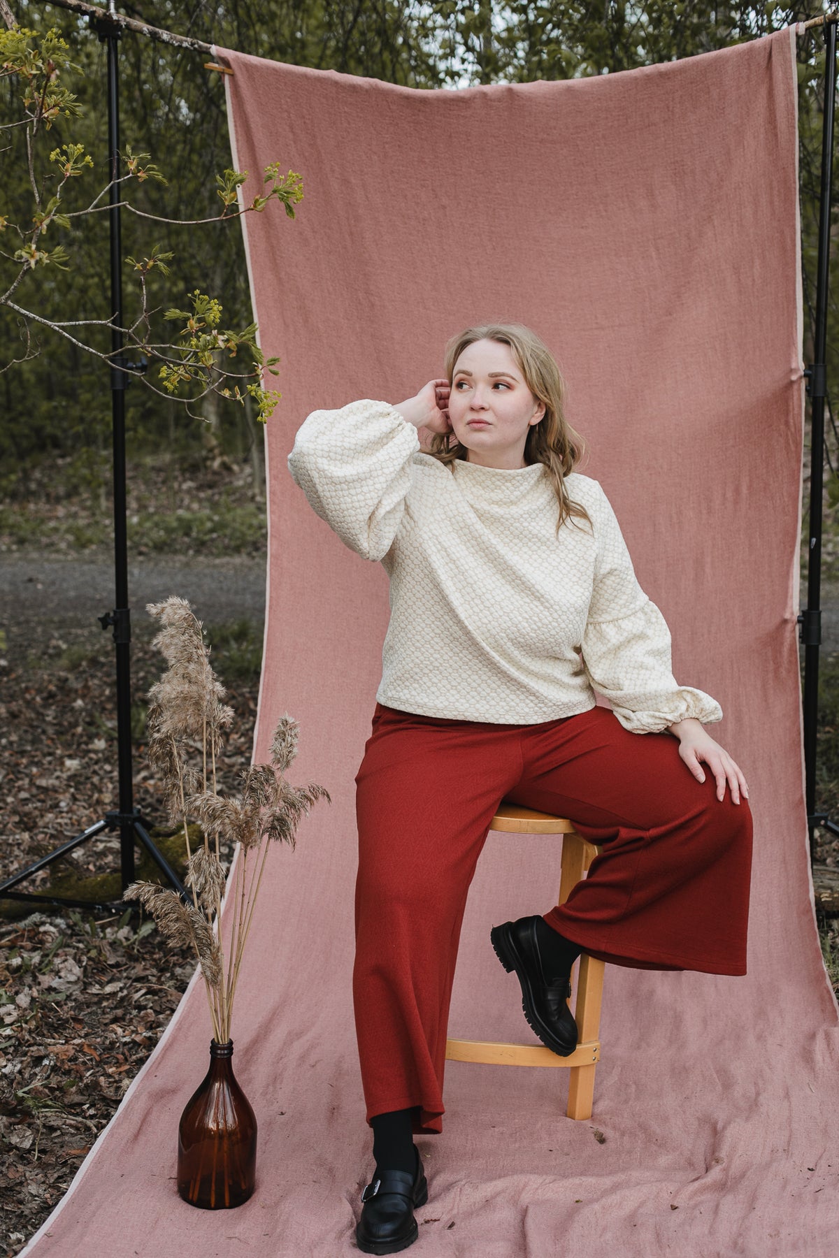 Tamperelaisen Noukin toivotut klassiset merinovillaiset Tundra-culotteshousut ovat täällä! Kaunis syksyinen punaruskea Kaarna-struktuurikuosi sävyssä Ruska.