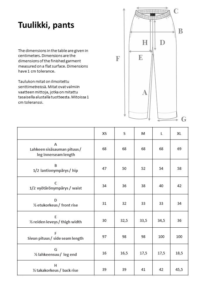 Kangasta voi kuvailla vahvaksi mutta se ei ole kovin laskeutuva kuitenkaan. Elastaani tuo vaatteeseen käyttömukavuutta. Housuissa on joustava kuminauhavyötärö ja taskut.