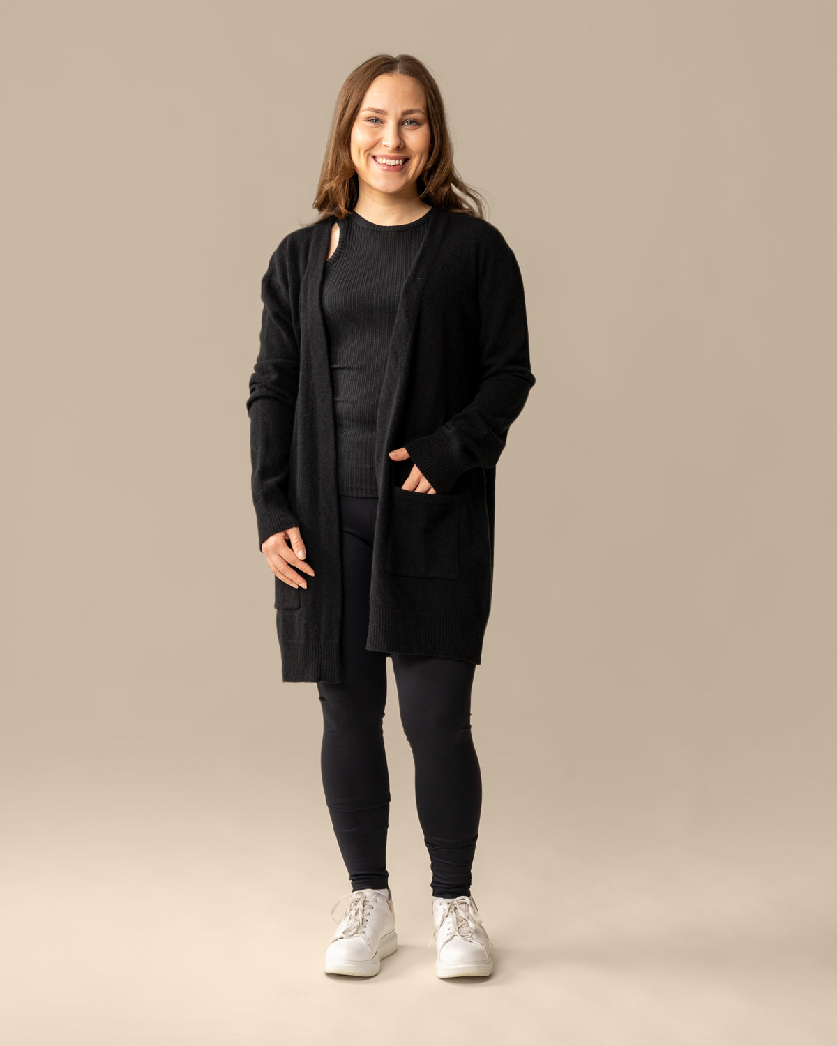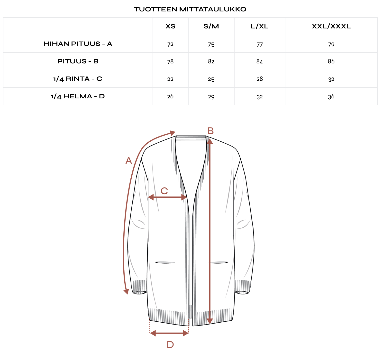 Tyyni neuletakki on täydellinen kerrospukeutumiseen ja viileämmille säille! Neuletakista löydät kätevät taskut sekä resorit hihansuista. Pitkä neuletakki ylttää noin reiden puoleenväliin, riippuen käyttäjän pituudesta ja mittasuhteista.