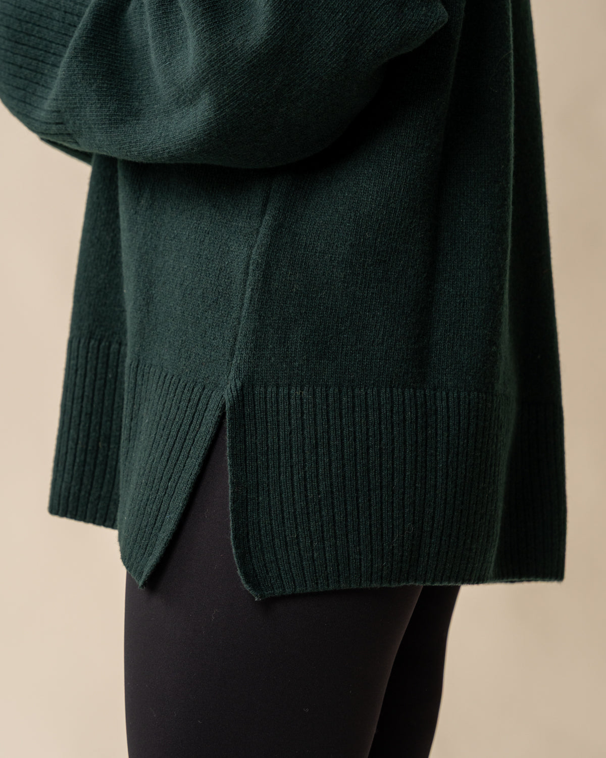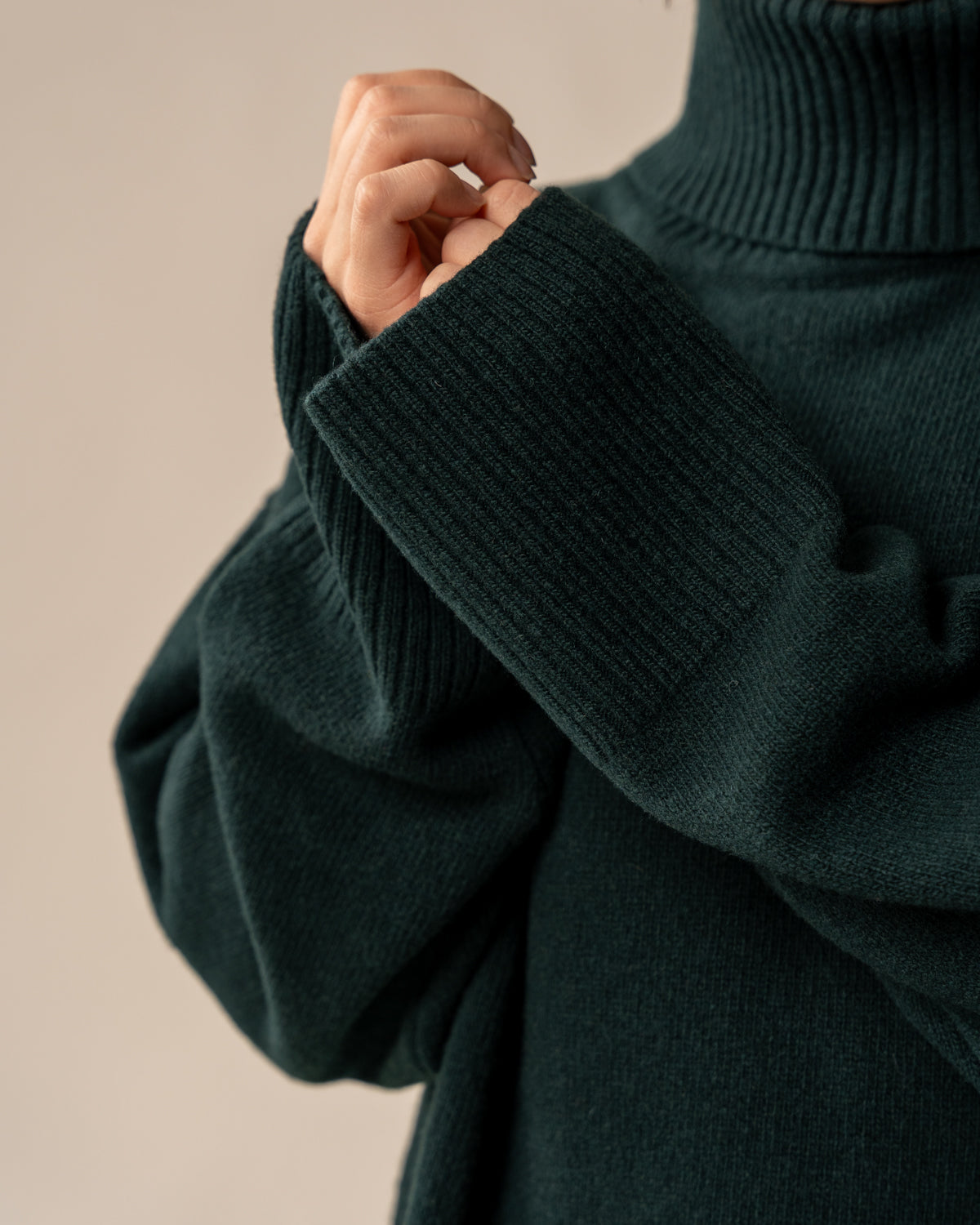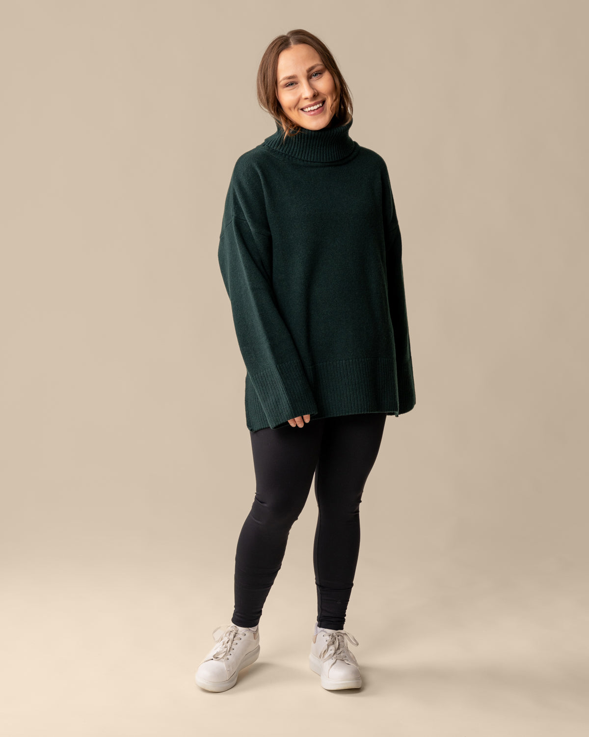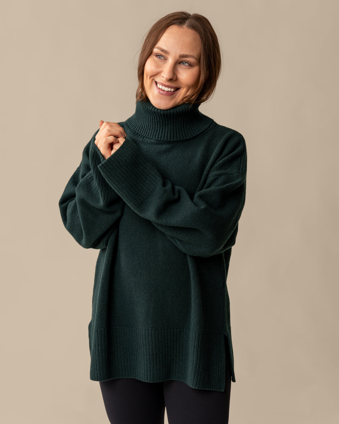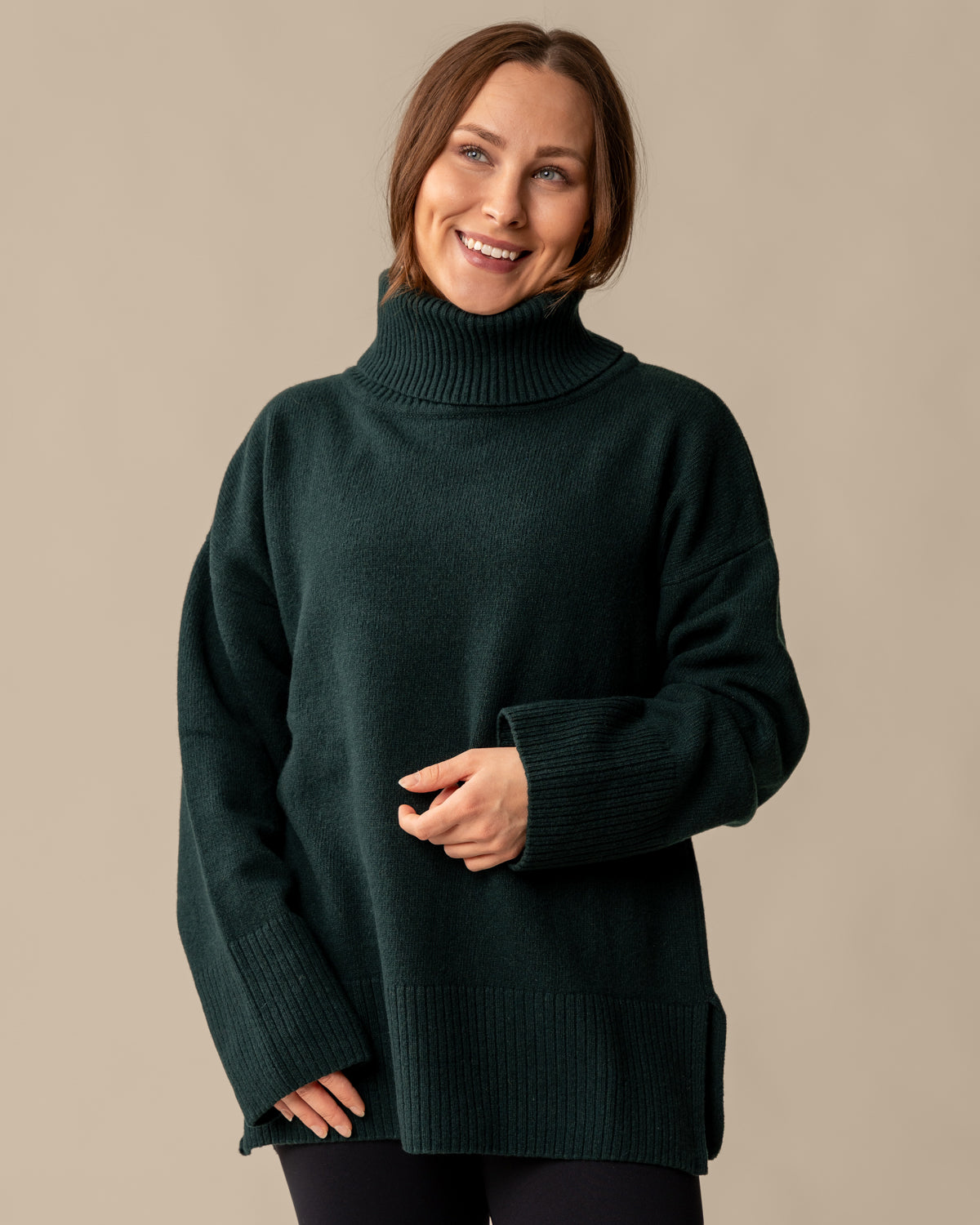 Merinovillainen pooloneule. Tämä rennosti mitoitettu pooloneule lämmittää viileinä päivinä. Neuleessa on taitettava poolokaulus, pitkät hihat ja halkiot sivuilla. Neule on 100% mulesing-vapaata merinovillaa. Sävynä tyylikäs tummanvihreä.