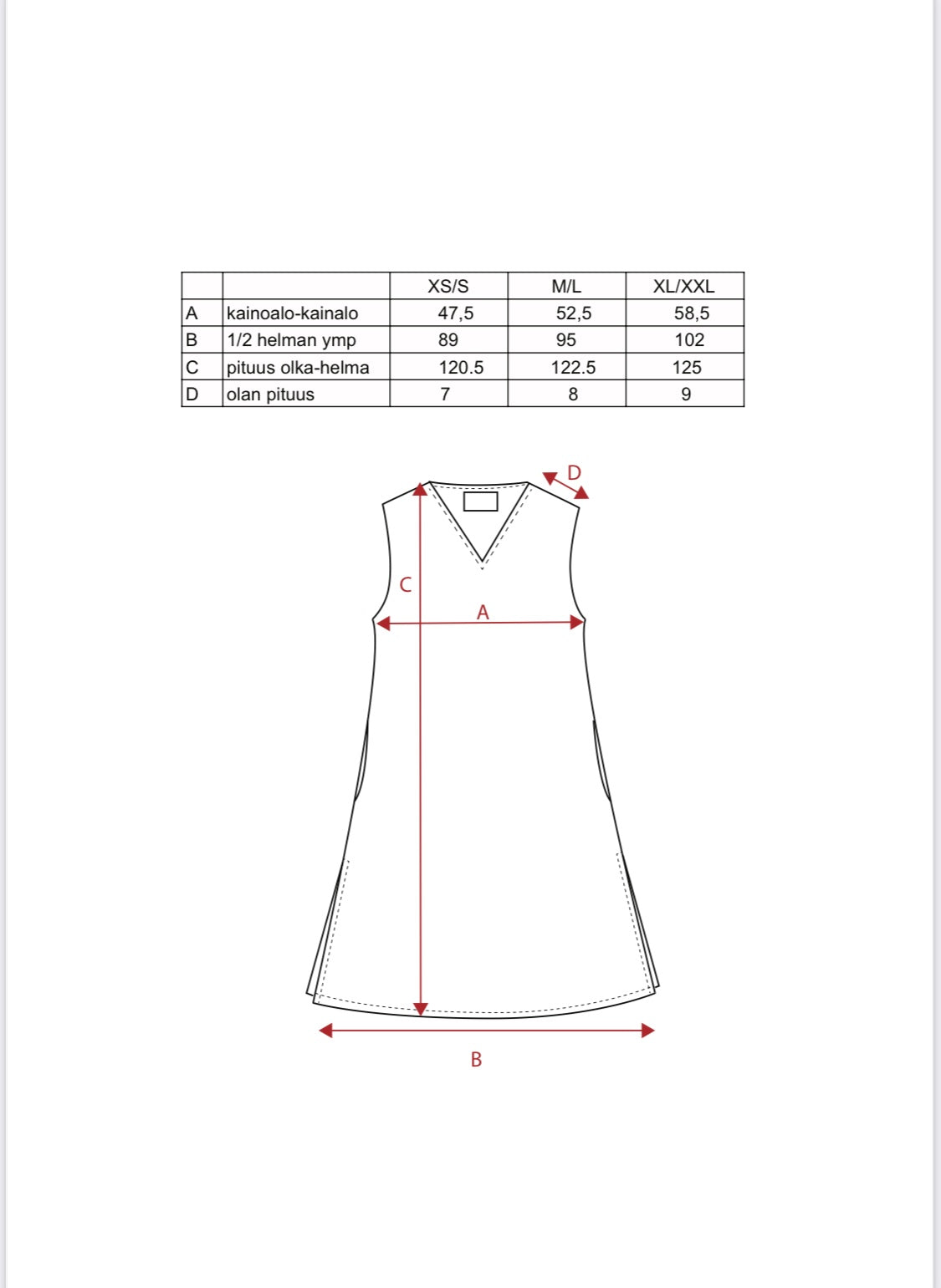 Pitkä hulmuava helma ja kepeä hihaton malli toimivat kesän kuumimpinakin päivinä, mutta voit tarvittaessa myös kerrostaa mekon ja siksi tämä malli onkin kaudesta riippumaton.