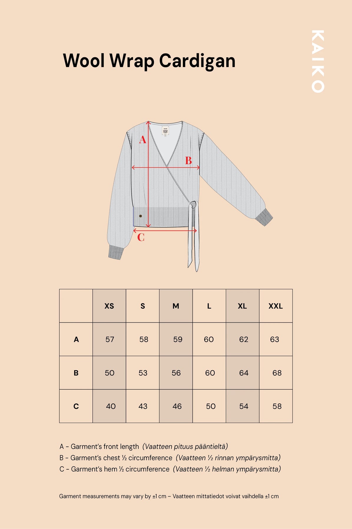 Käytä koon valinnan apuna Kaikon vartalonmittataulukkoa ja vaatteen mittoja (viimeinen kuva).