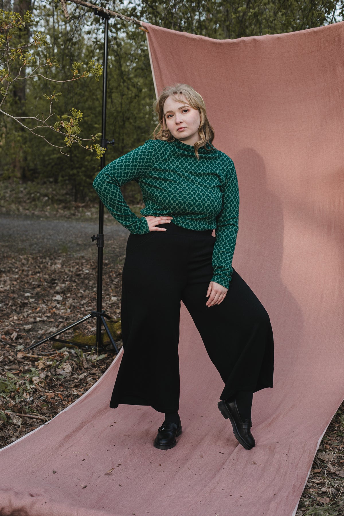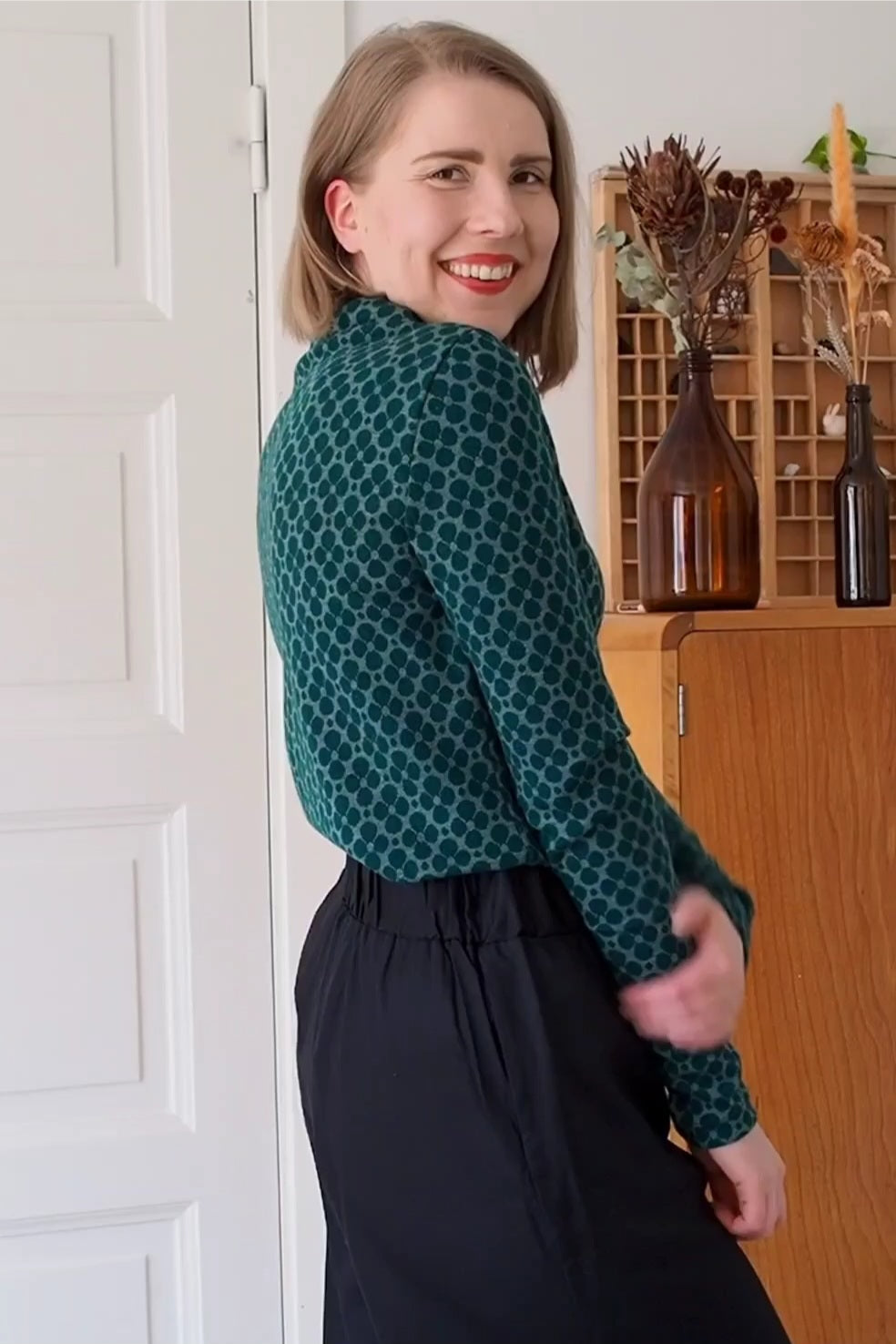 Videon mallilla on poolosta koko M. Mallin mitat: ry: 83cm, vy 63cm, ly 105cm. (Poolo on siis muutaman koon mitoitusohjetta suurempi ja näin ollen mitoitus on hieman rennompi.)