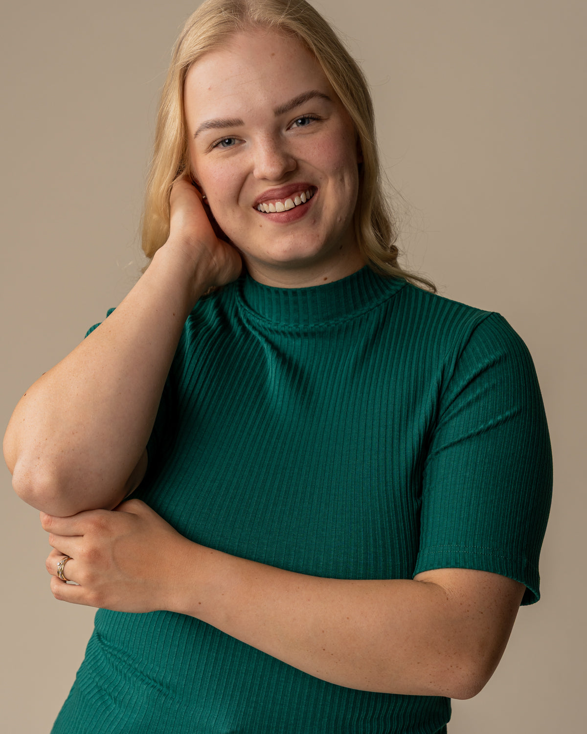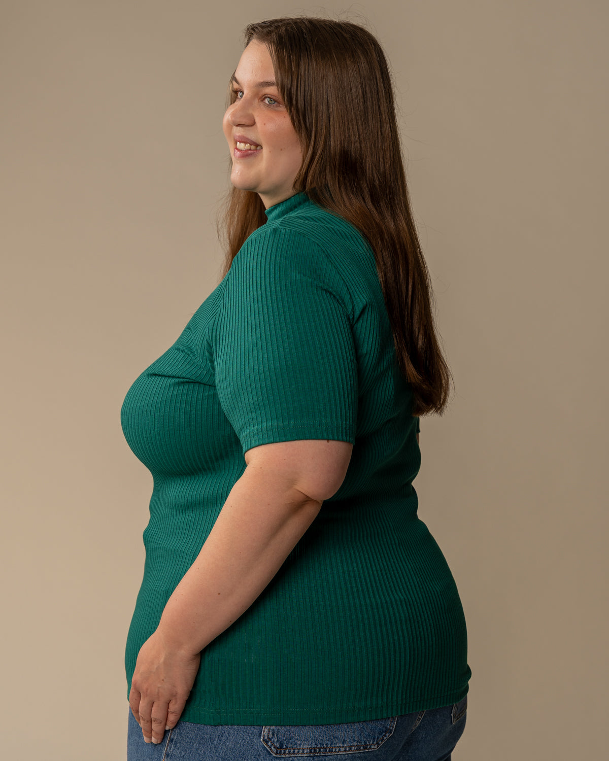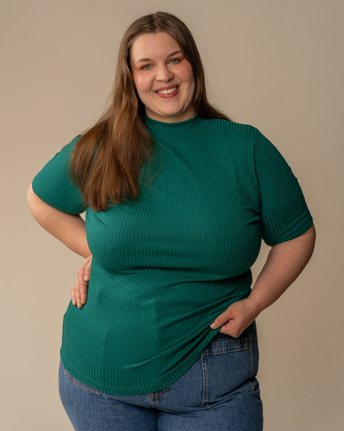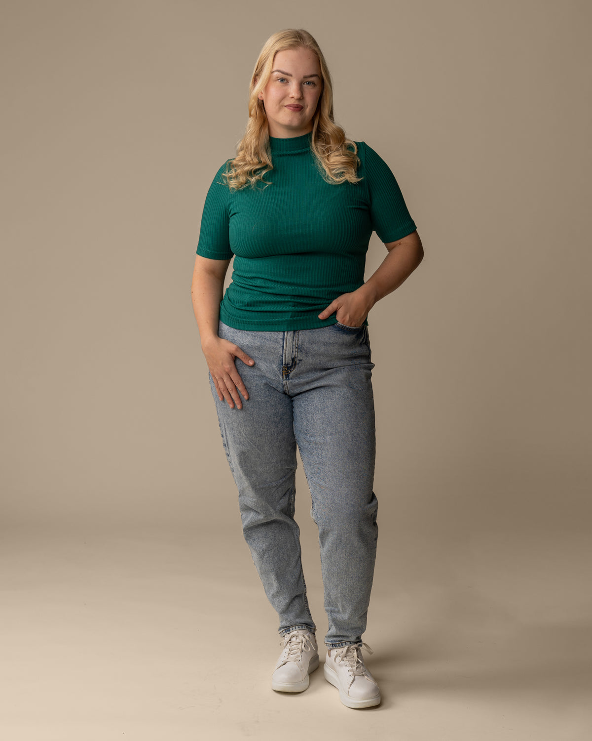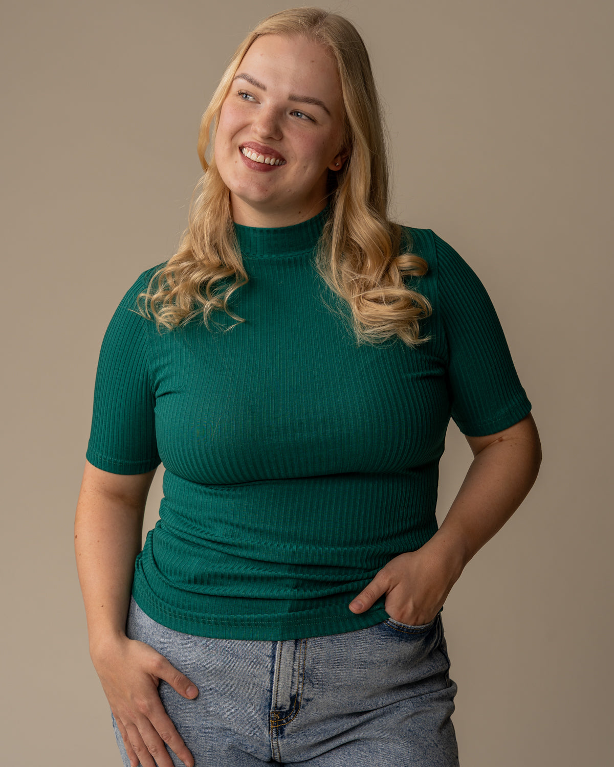 Kevyestä ja joustavasta ribbimateriaalista tehty poolo, jossa on lyhyet hihat. Sopii hyvin moneen asuun eri alaosien pariksi. T-paidassa on matala poolokaulus, eli kilpikonnakaulus. Sävynä värianalyysissa talville sopiva smaragdin vihreä.