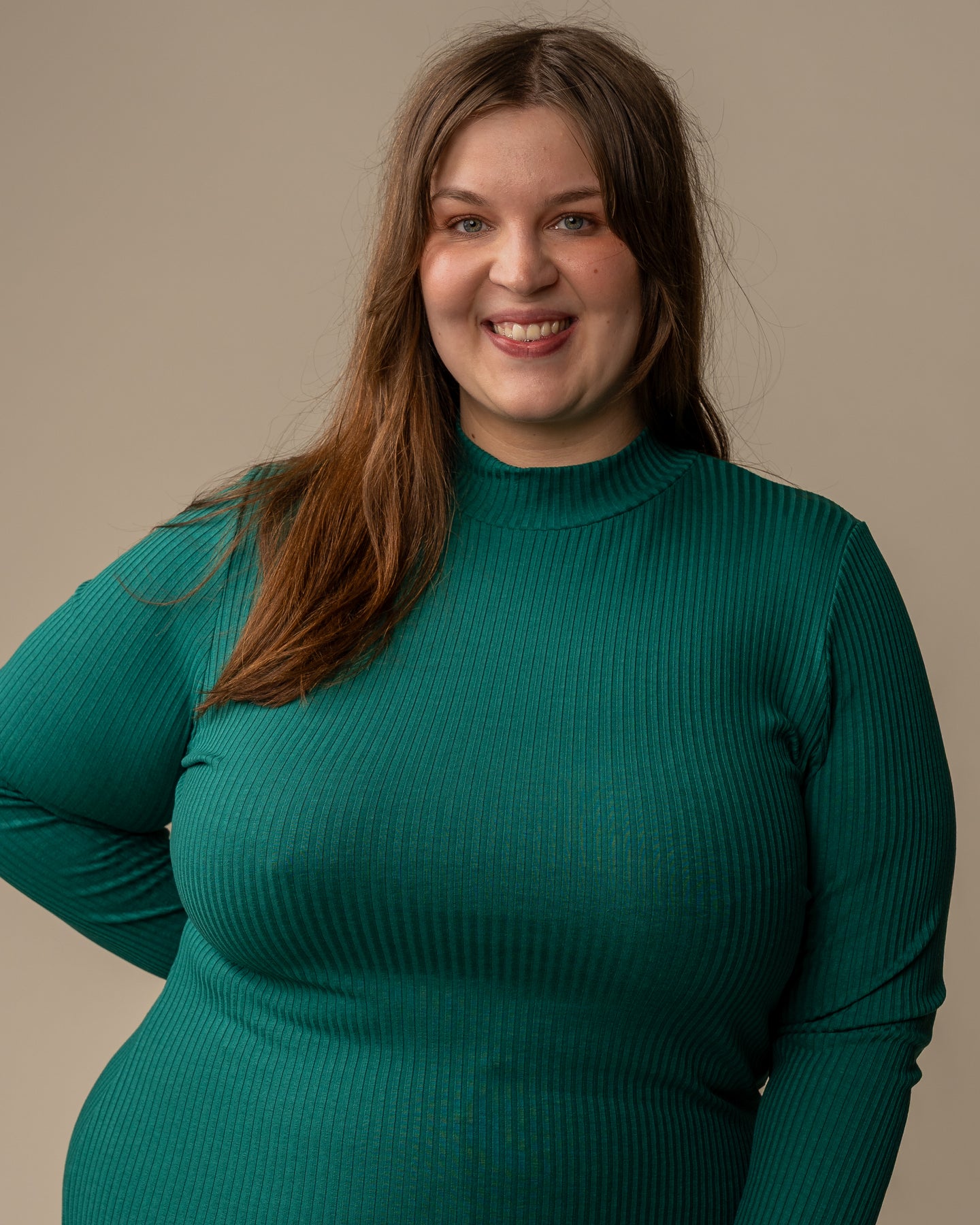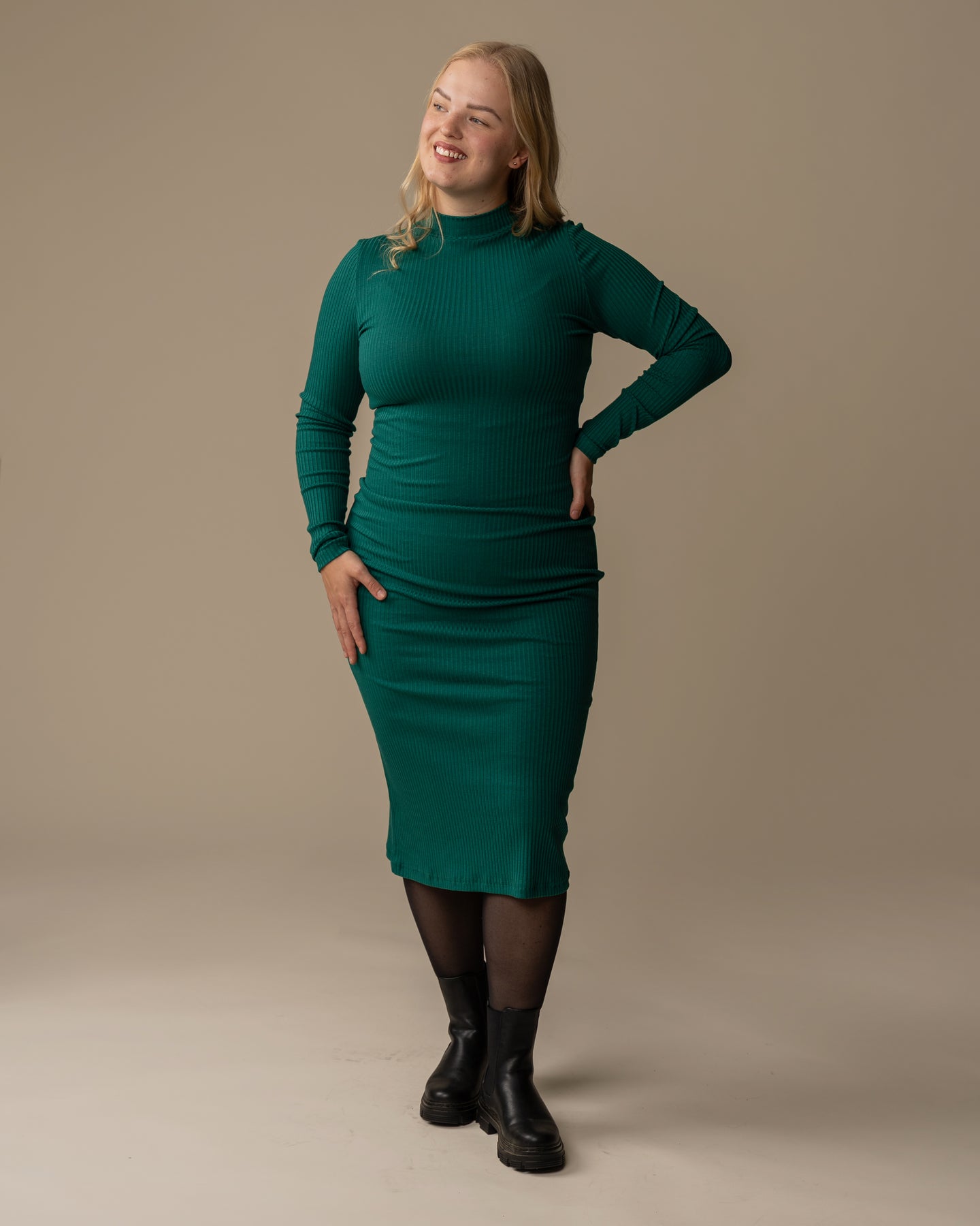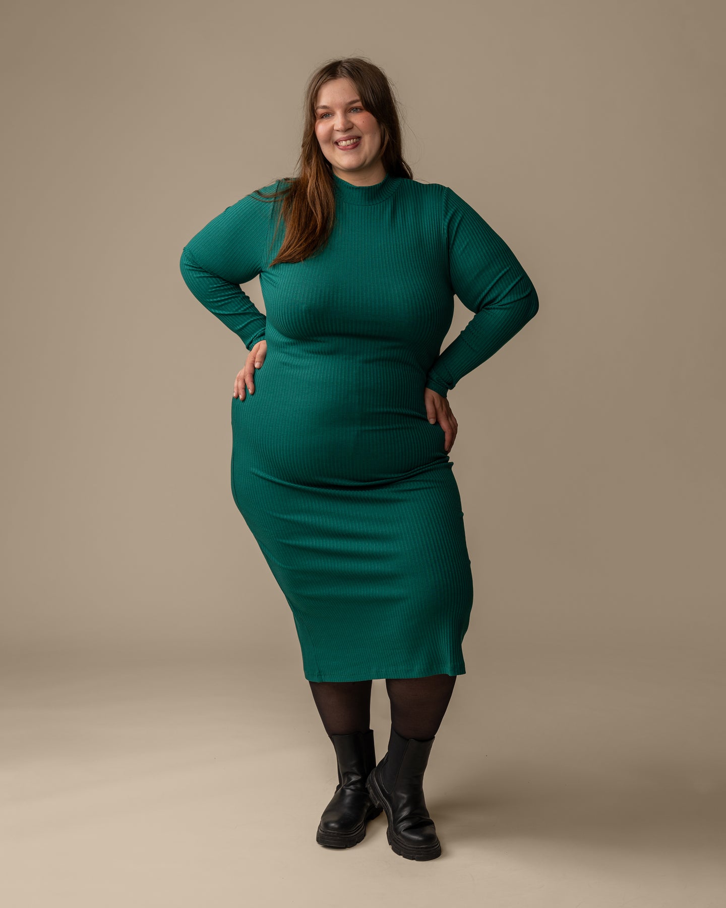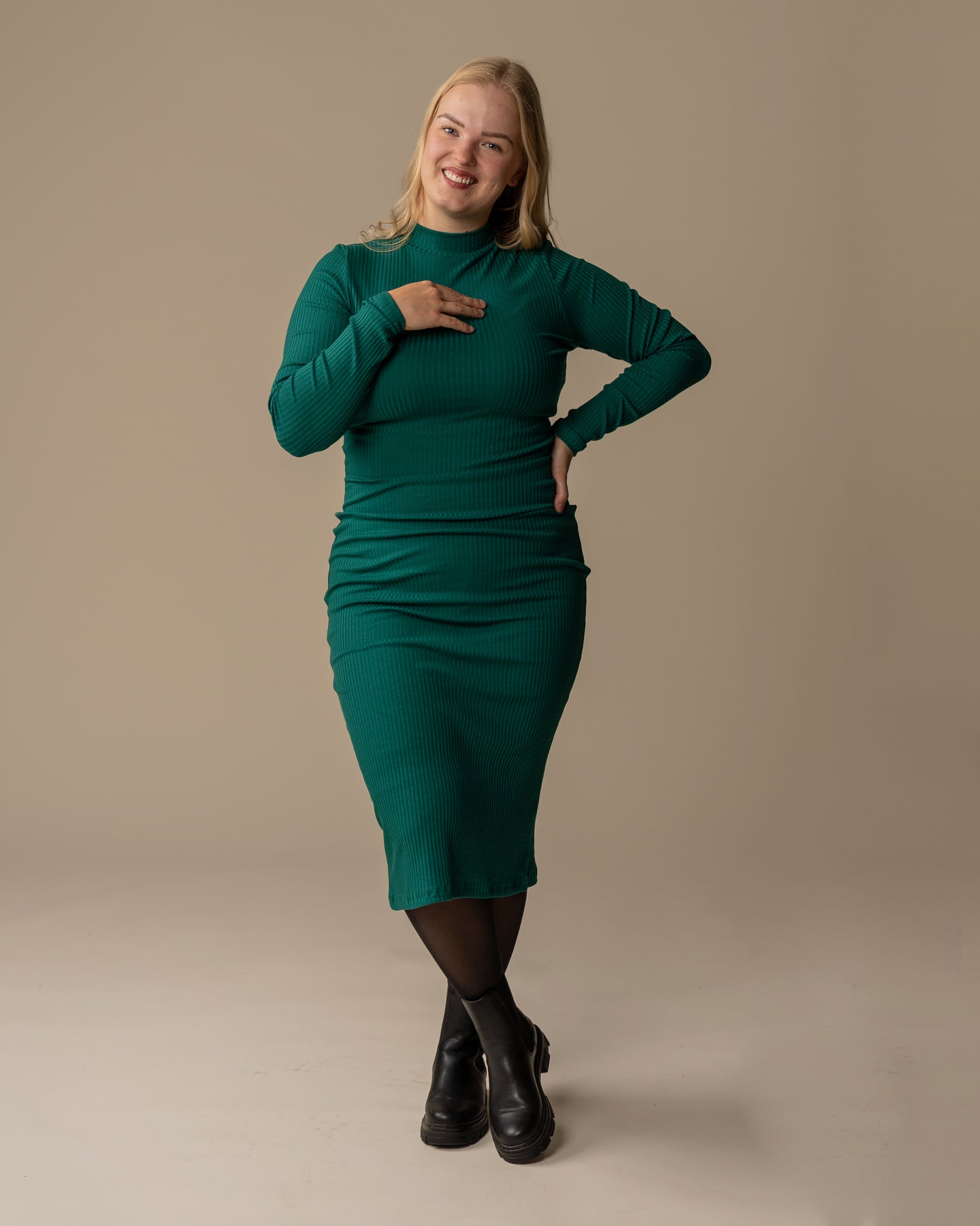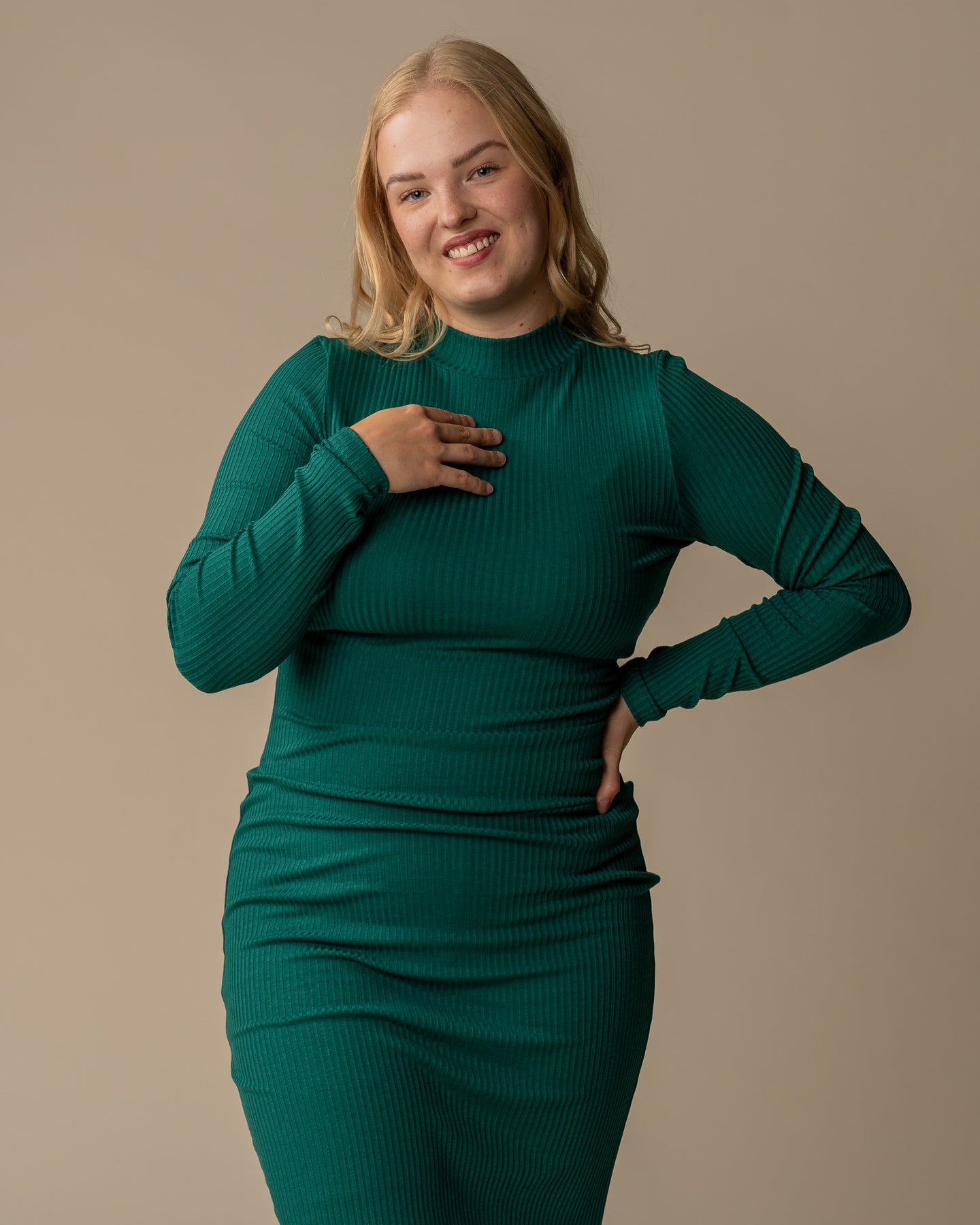 Ribbimekko on vartalonmyötäinen ja siinä on pääraaka-aineena mukava ja hengittävä lyocell. Mekossa on kilpikonnakaulus ja pitkät hihat. Pituus hieman polven alle 170 senttisellä. Sävynä värianalyysissa talville sopiva smaragdin vihreä.