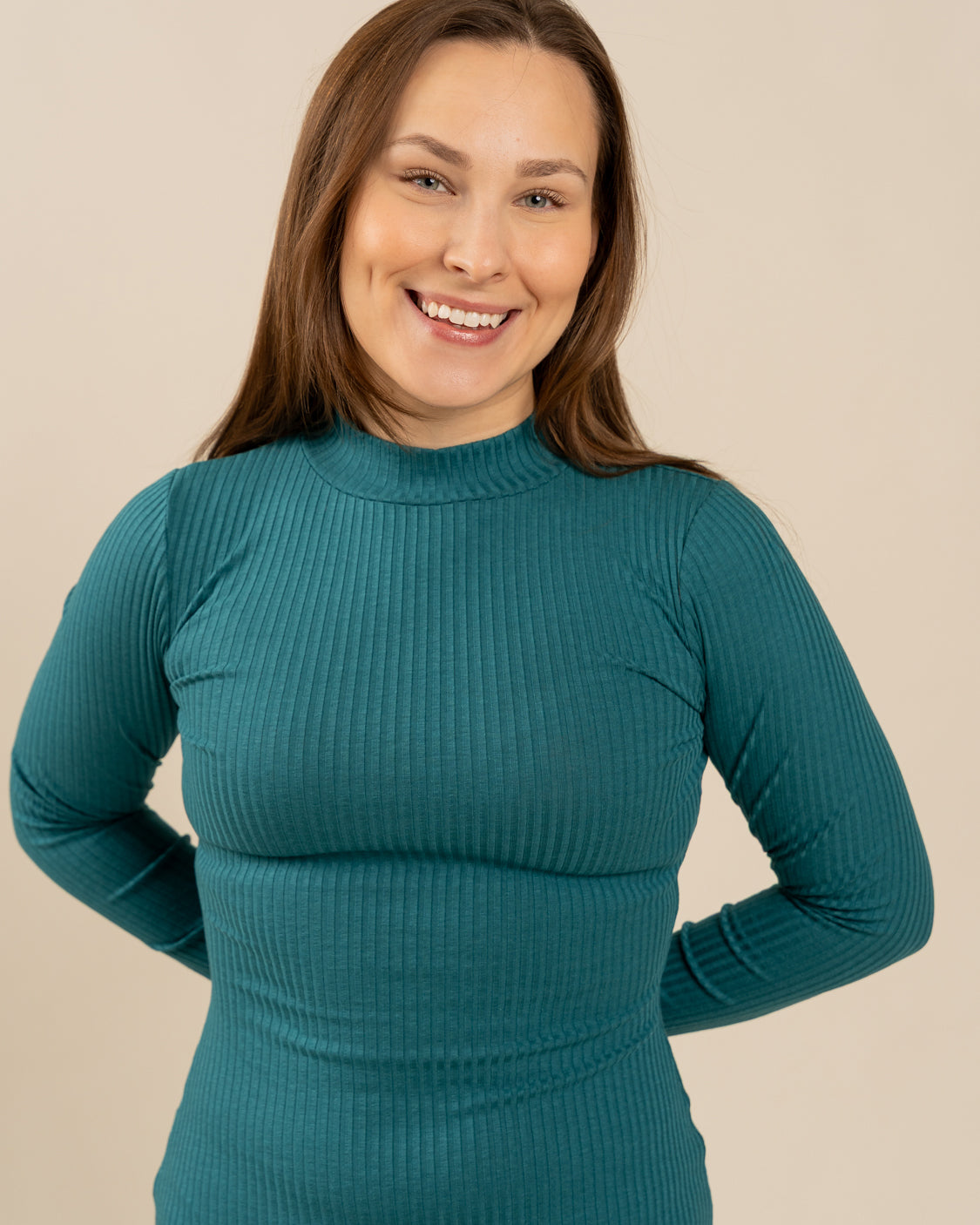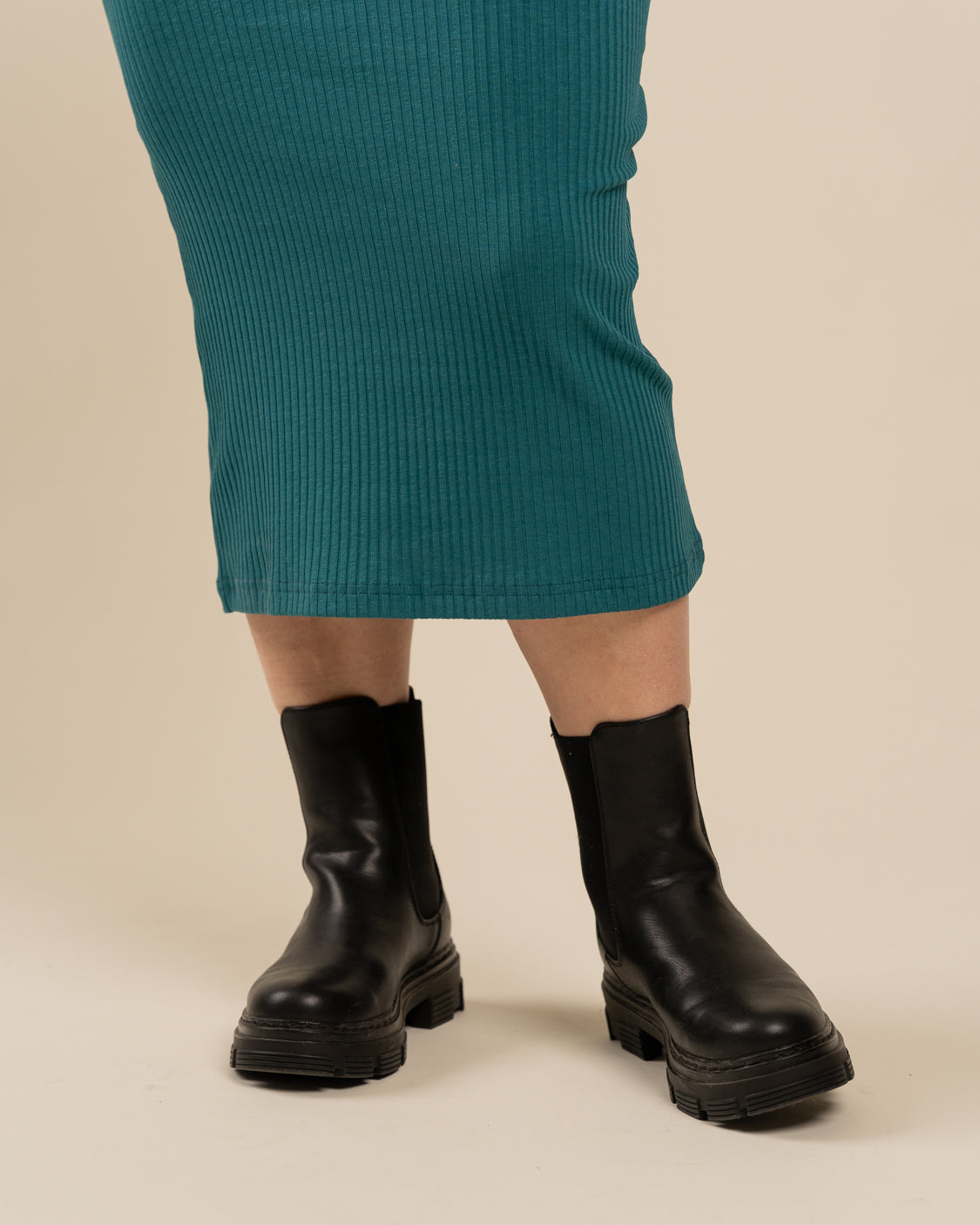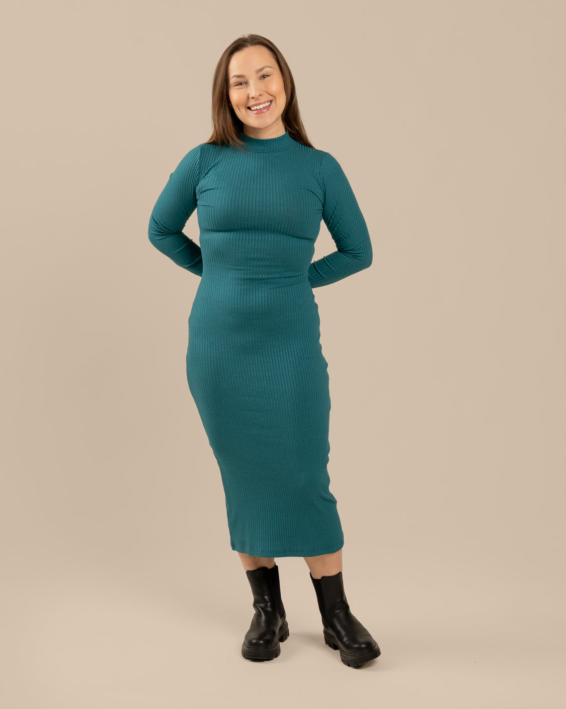 Ribbimekko on vartalonmyötäinen ja siinä on pääraaka-aineena mukava ja hengittävä lyocell. Mekossa on kilpikonnakaulus ja pitkät hihat. Pituus hieman polven alle 170 senttisellä.