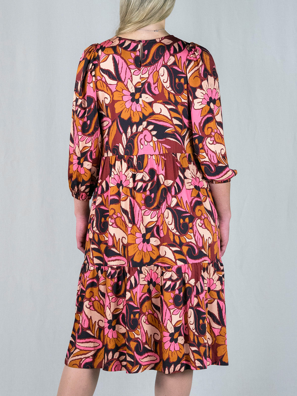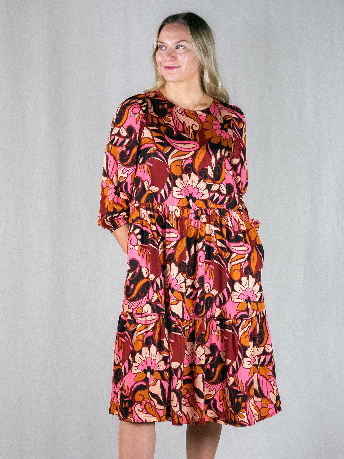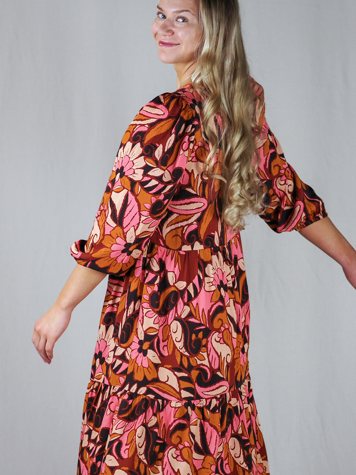 Pohjepituisessa mekossa on pyöreä pääntie, jossa takana keskellä pieni halkio ja nappikiinnitys. Mekossa on kaksi poikittaista frillasaumaa, joista helma levenee kerrostetusti alaspäin. Hihat ovat puolipitkät hieman pussimaiset ja olalta poimuttuvat. Hihansuussa on kuminauhakuja ja sivusaumoissa taskut. Mekko on valmistettu laadukkaasta eurooppalaisesta viskoosista, joka tuntuu silkkimäisen pehmeältä ja laskeutuu kauniisti