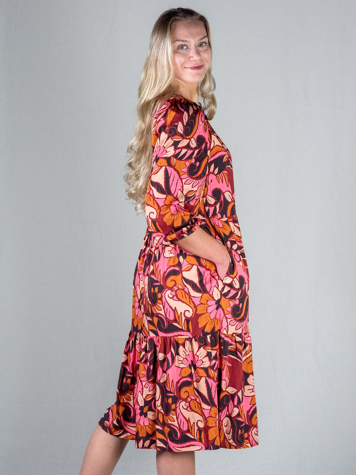 Kotimaisen CUOSI:n Daniella-frillamekko on viehättävän naisellinen kuosimekko, joka sopii niin juhlaan kuin arkeen. Mekon Flora-painokuosissa on erisävyisiä oranssinpunaisia, keltaisia ja pinkkejä tyyliteltyjä kukkia ja kasviaiheita.