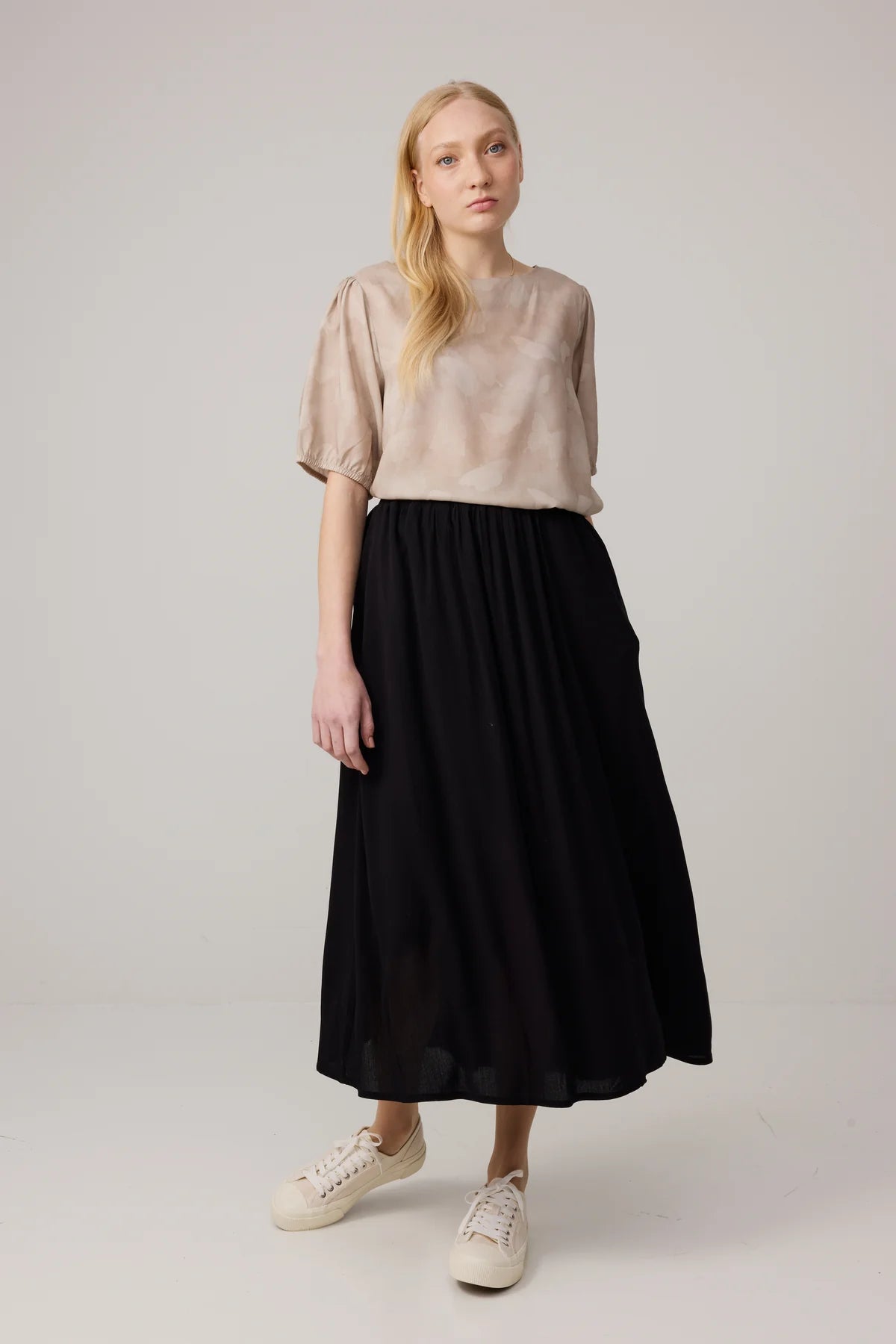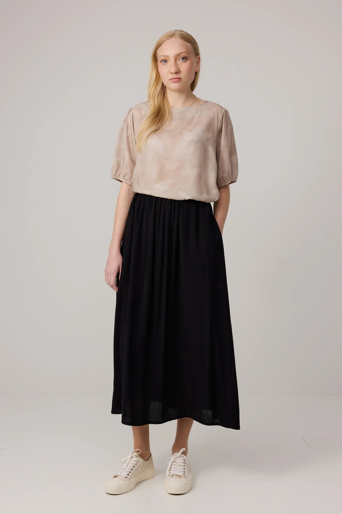Midimittainen kreppihame on valmistettu pehmeästä 100% Ecovero™ viskoosista. Heidi hameessa on mukava joustovyötärö laskoksilla ja sivuilla kätevät taskut.