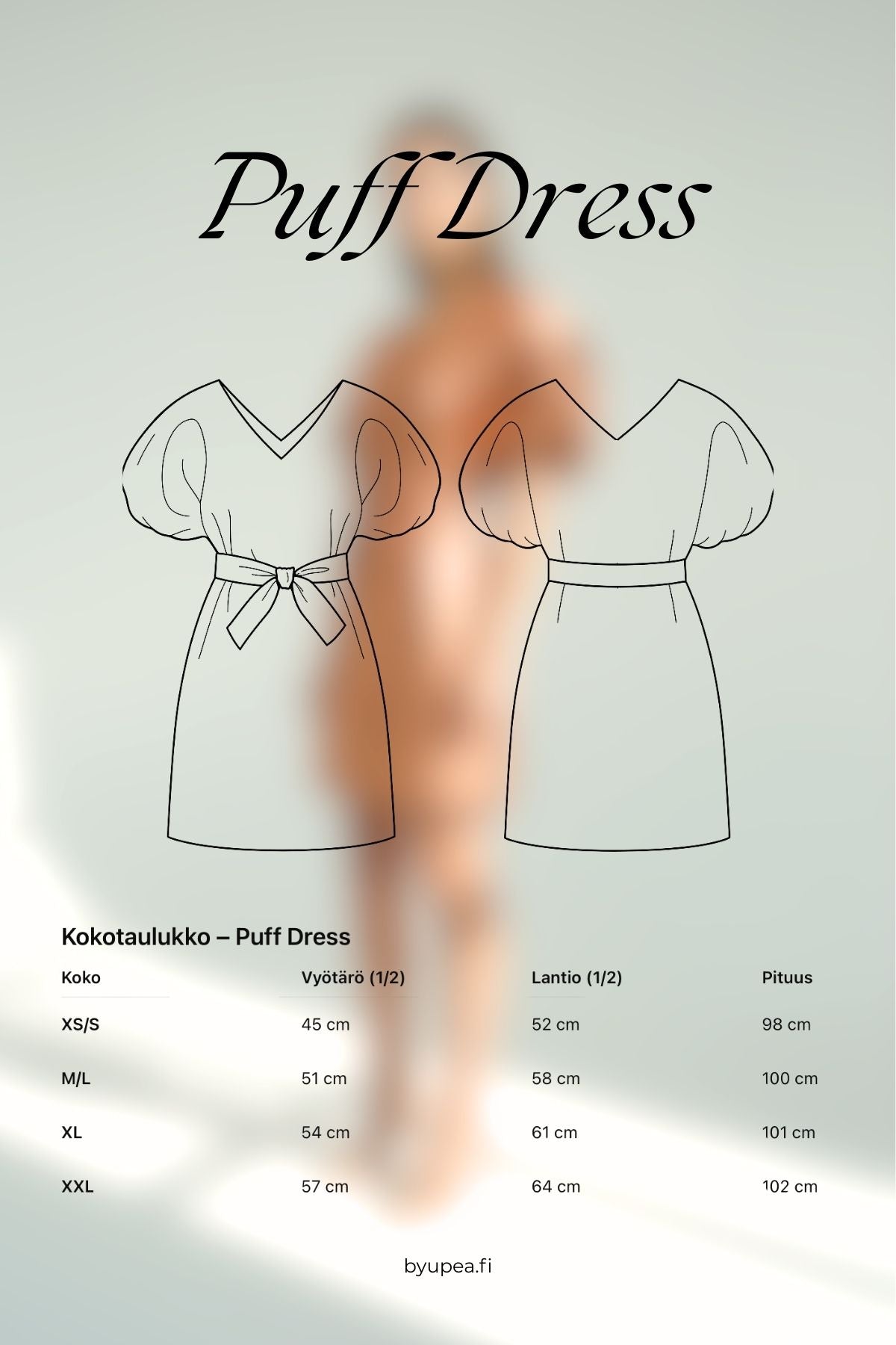 Valitse kokosi ensisijaisesti lantion ympäryksen mukaan. Puff Dress on suunniteltu väljäksi, mutta jämäkkä kangas ei jousta – oikean koon valinta lantion kohdalla varmistaa parhaimman istuvuuden ja liikkumavaran.