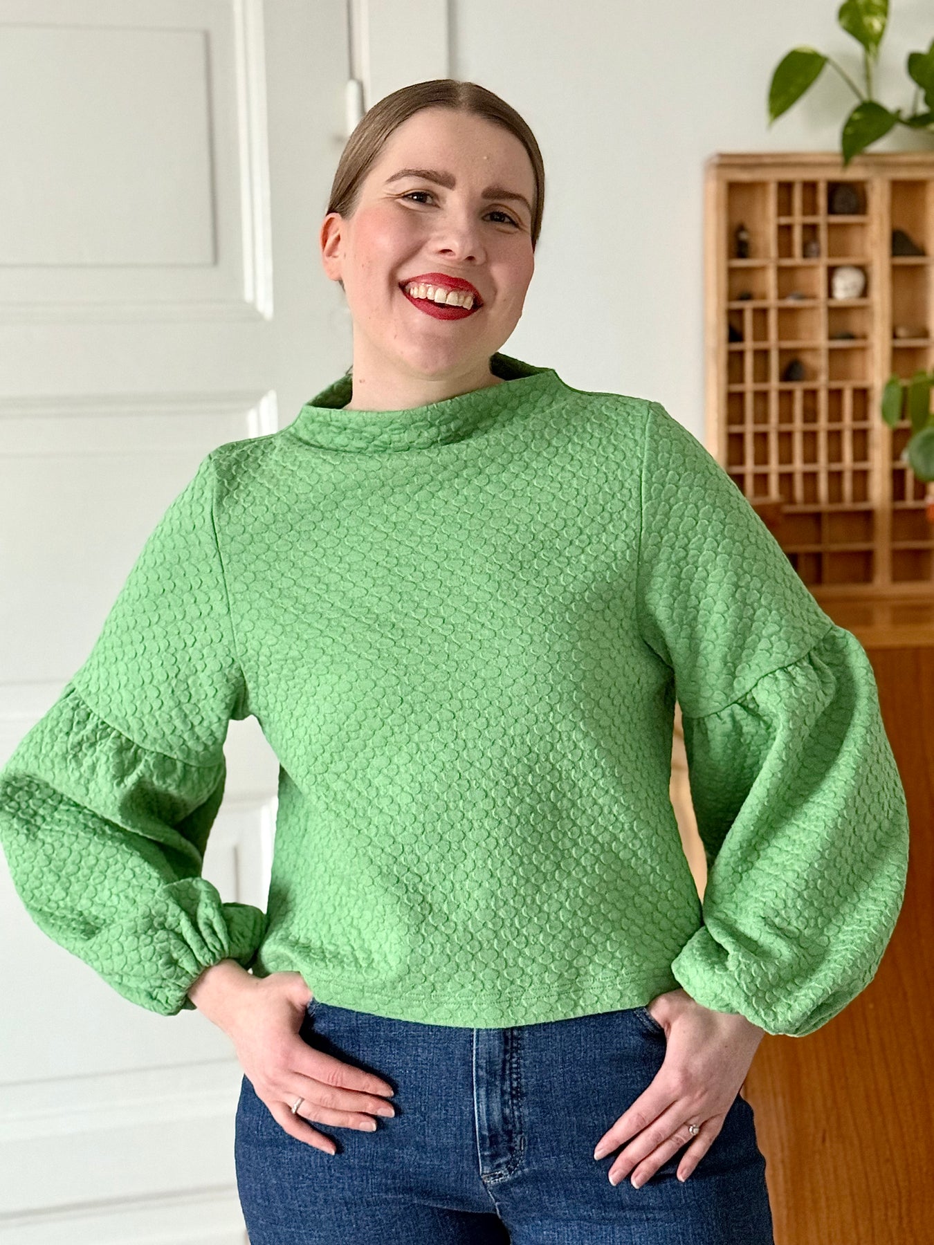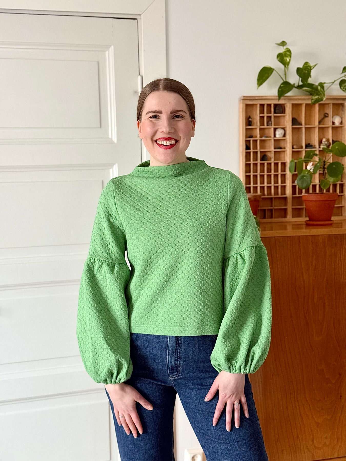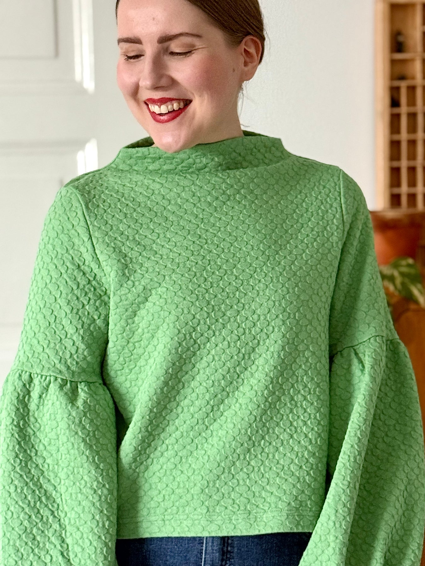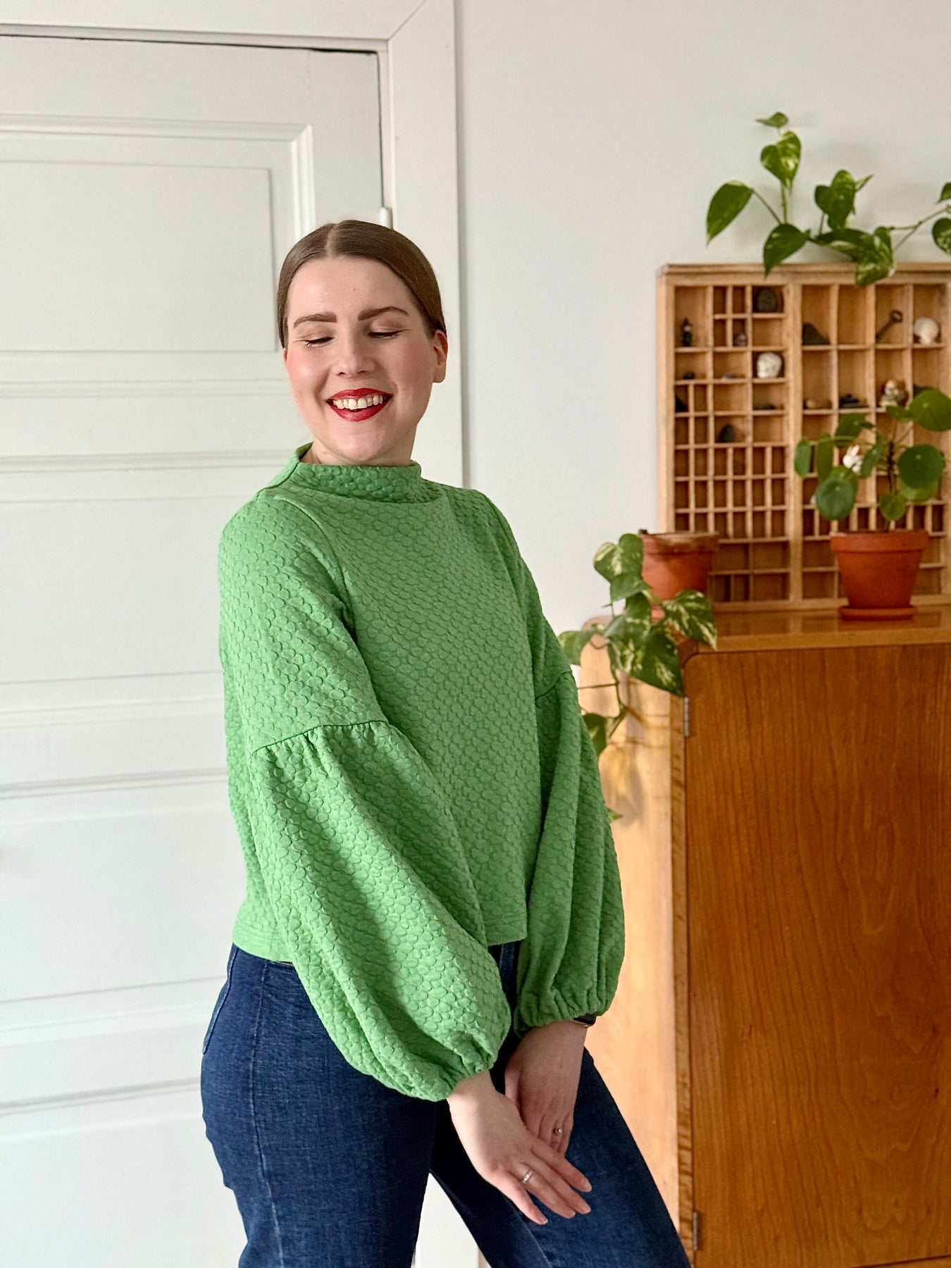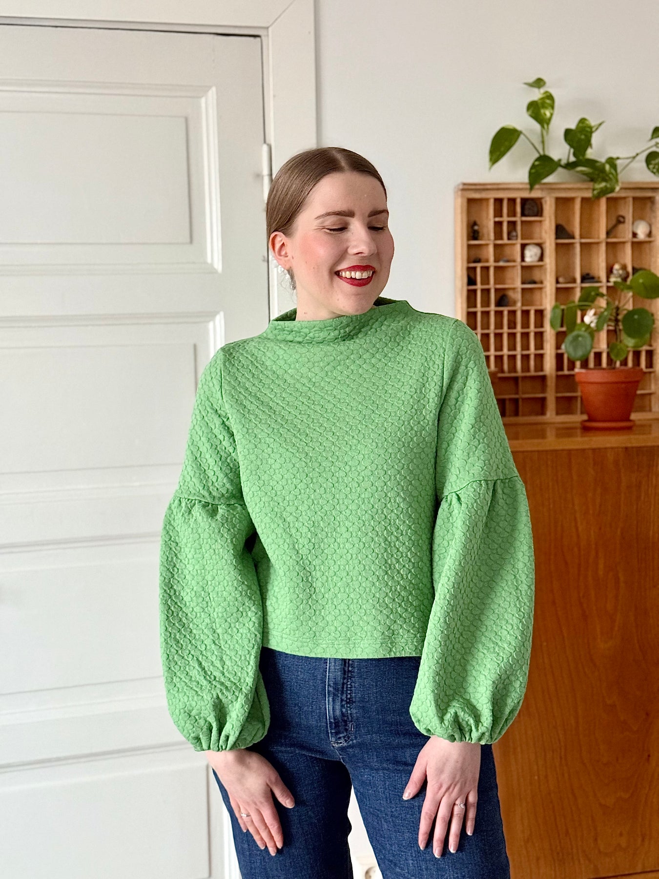 Suora ja lyhyt malli, joka korostaa upeita pussihihoja. Savupiippukaulus, hihansuissa kuminauhat. Toimii parhaiten hieman korkeavyötäröisempien alaosien kanssa.