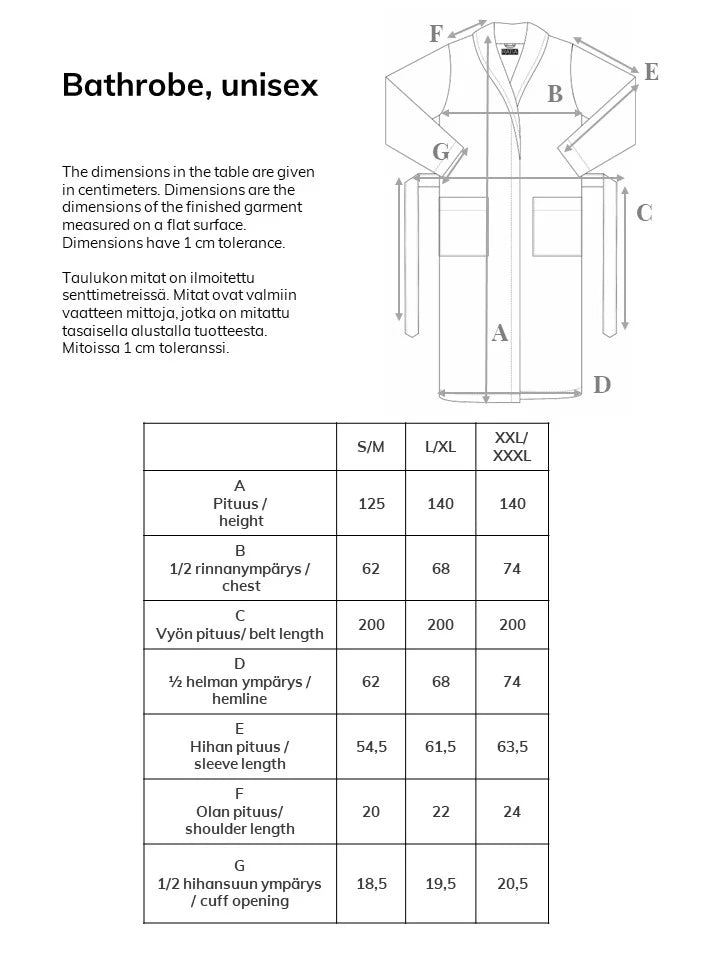 Huom! Kylpytakki on unisex-mallia ja tehty miesten mittataulukon mukaisesti. Jos haluat ostaa takin naiselle, valitse yksi koko pienempi kuin normaalisti.