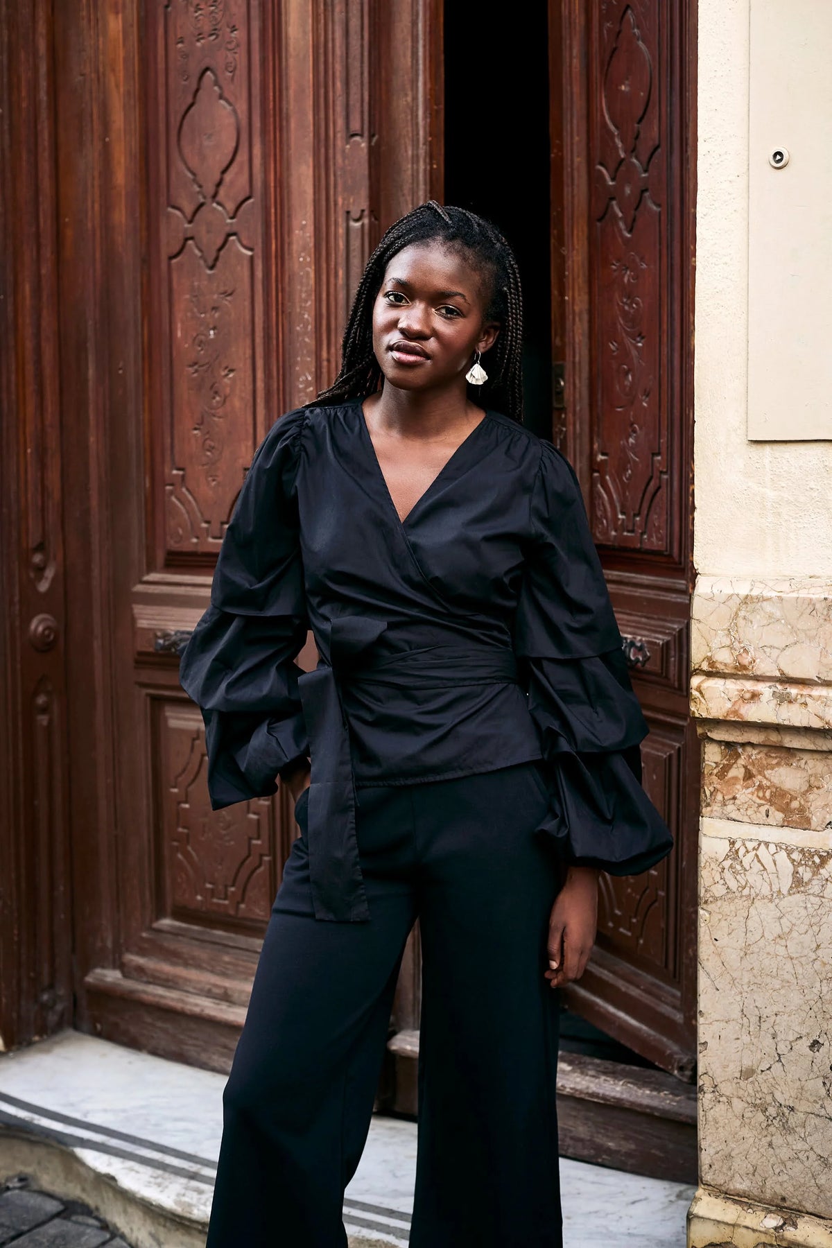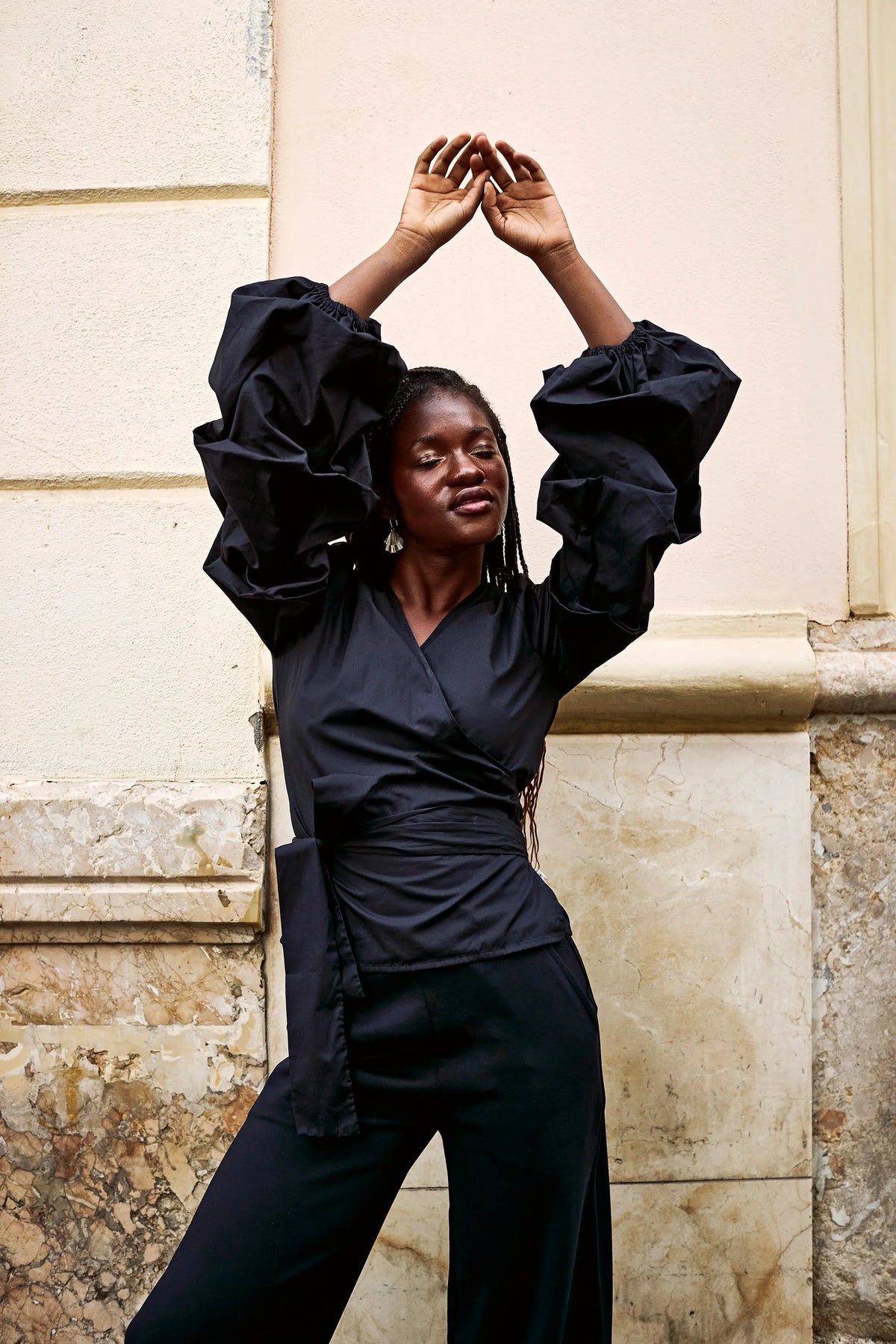 Kietaisupaidassa on solmittavat nauhat vyötäröllä sekä runsaat, kerrostetut täyspitkät hihat. Hihansuut on poimutettu kuminauhalla. Imarteleva kietaisuleikkaus ja säädettävä vyötärönauha varmistavat täydellisen istuvuuden jokaiselle vartalotyypille. Näyttävä ja dramaattinen paita on täydellinen valinta juhliin ja muihin erityisiin hetkiin. Värinä klassinen musta.