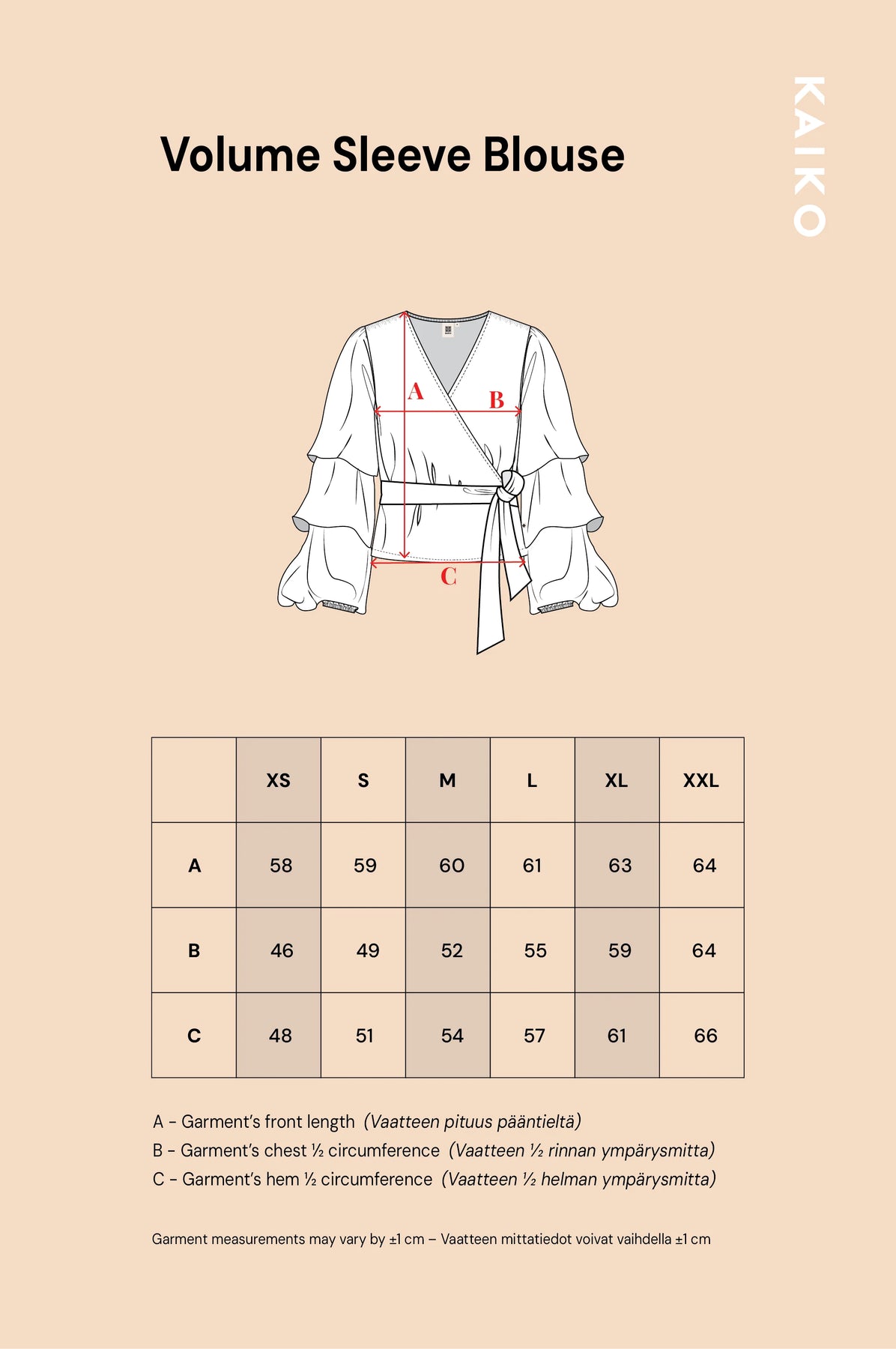 Kaiko Clothingin Volume Sleeve Blouse -kietaisupaita vastaa hyvin kokoaan. Suosittelemme valitsemaan paidasta saman koon, jonka normaalistikin valitsisit.