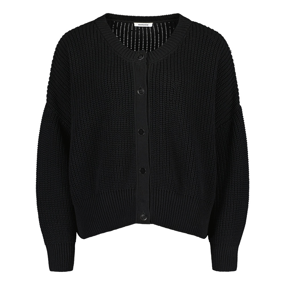 Metsolan Cotton Knit Cardigan Licorice neuletakki on More Love -malliston uusi musta neuletakki, jossa yhdistyvät käytännöllisyys, laatu ja ajaton tyyli. Neuletakin rento malli tekee siitä täydellisen yhdistettävän mekkoihin, hameisiin ja korkeavyötäröisiin housuihin.
