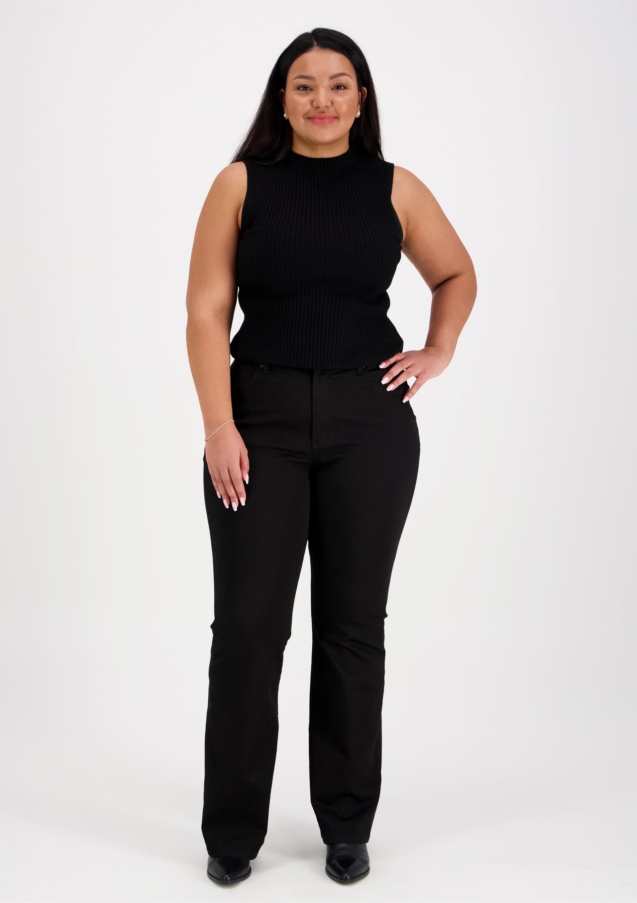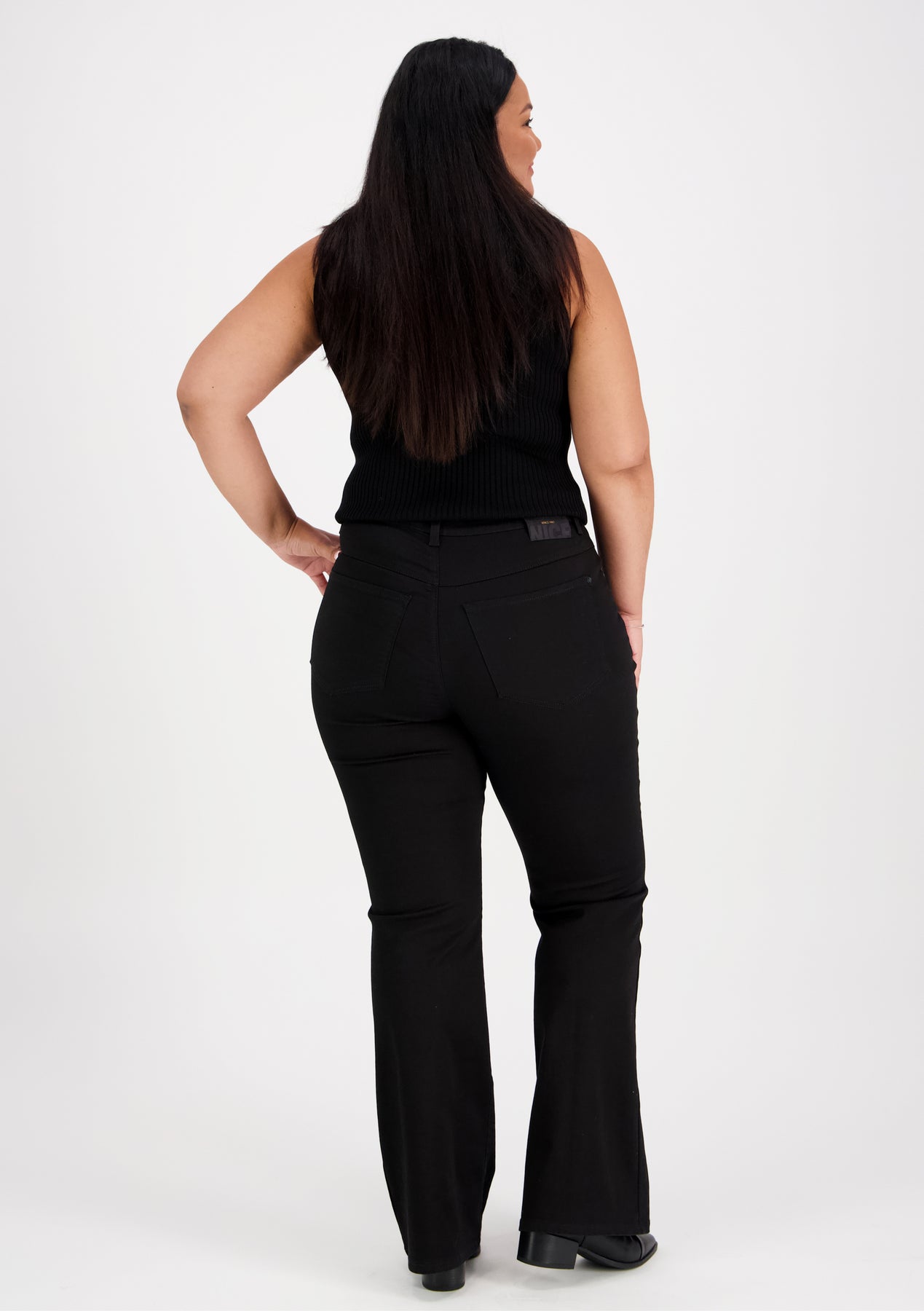 Lahje levenee polven kohdalta ja luo imartelevan bootcut-lahkeenlinjan. Monikäyttöiset, siistit mustat farkut mustilla tikkauksilla sopivat erinomaisesti myös juhlaan. Materiaali on modaalin ansiosta kevyt, pehmeä ja erittäin joustava. Stay Black -kankaassa on erinomainen värinkesto.