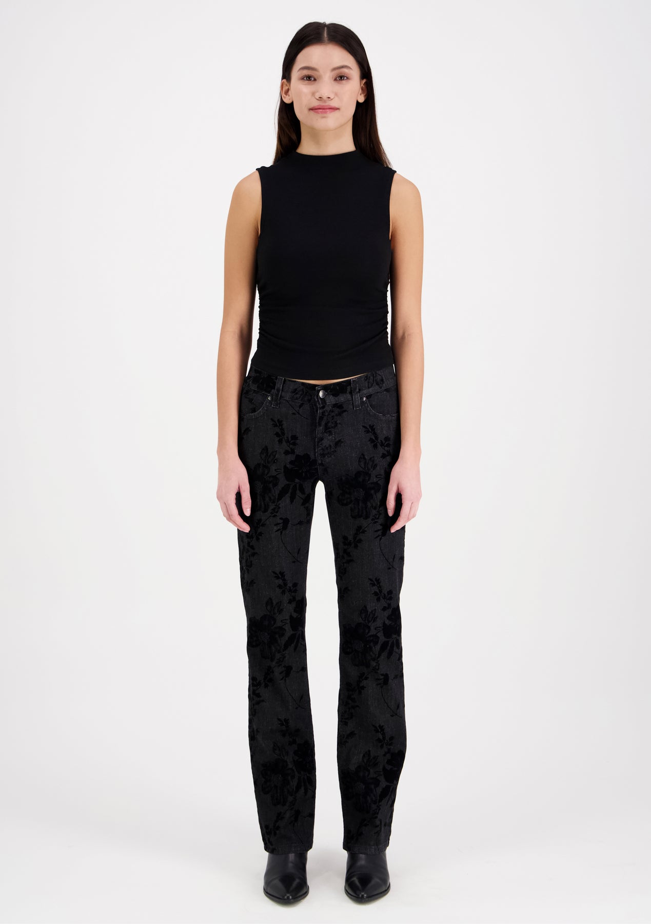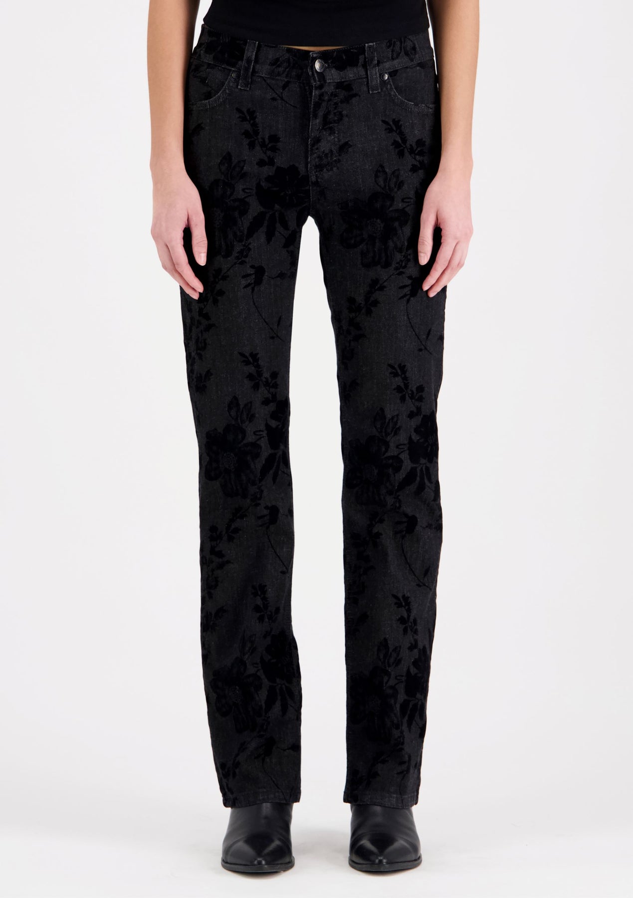 Kotimaisen Very Nicen klassiset Emily farkut mustalla samettikukkapainatuksella!